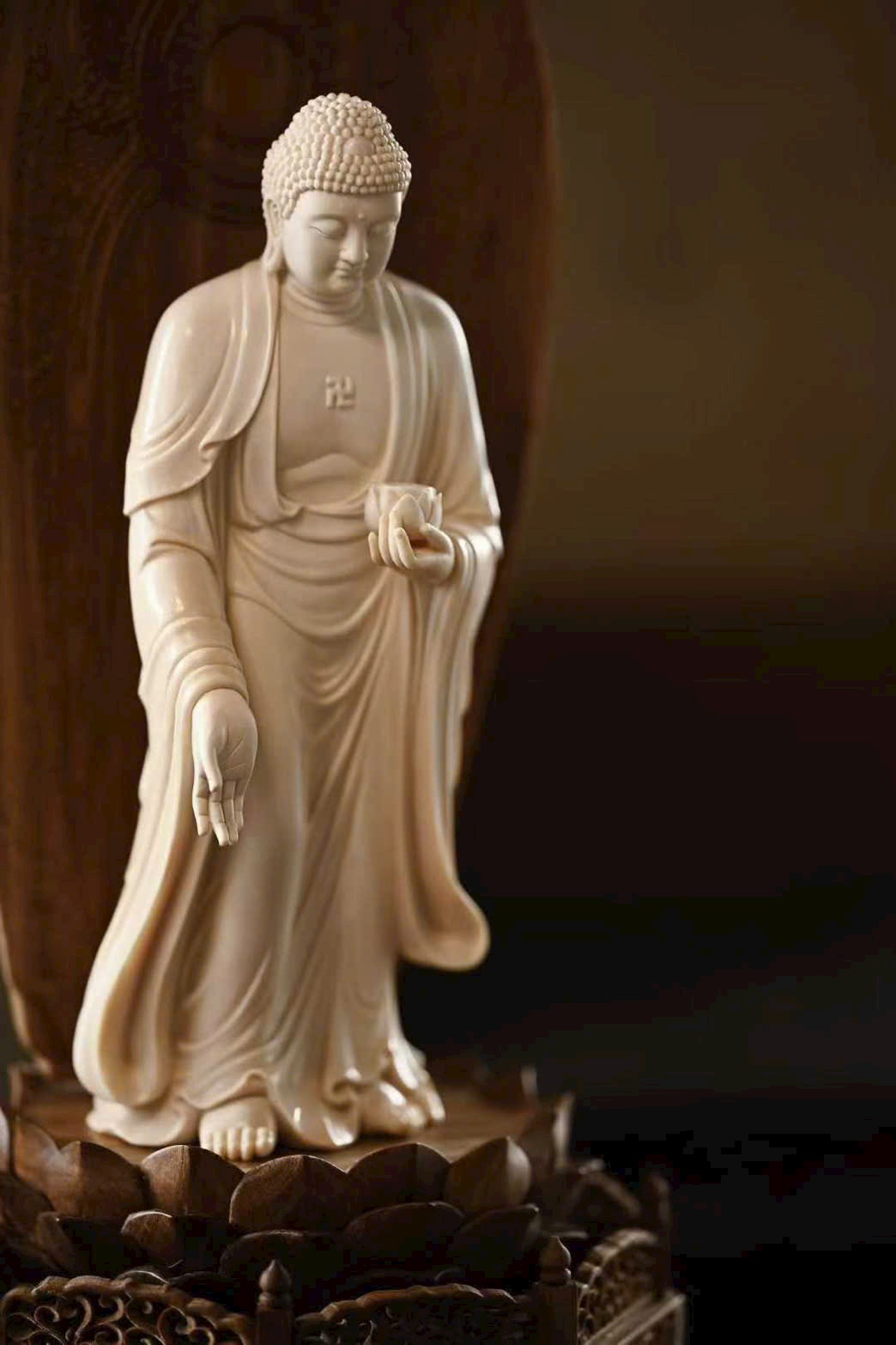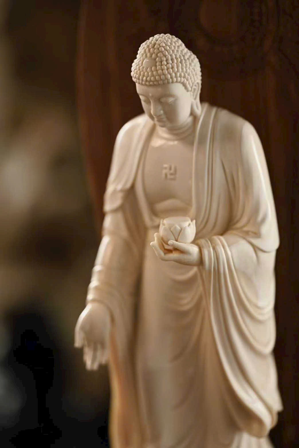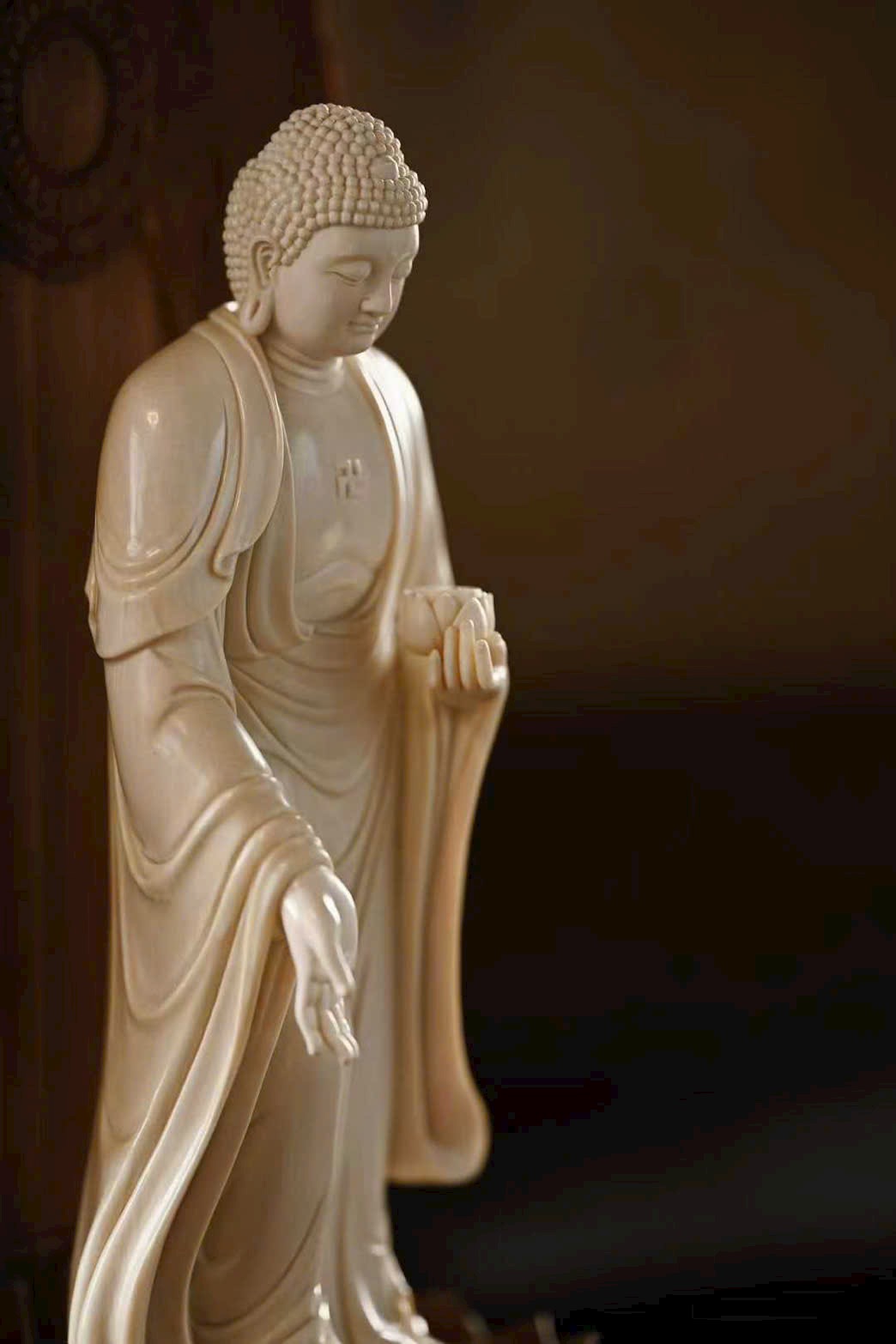 Tượng A Di Đà Phật có búi tóc cao đầy đặn, khuôn mặt viên mãn, lông mày thanh mảnh, đôi mắt dài hiền hòa. Tay trái nâng hoa sen, tay phải buông xuống kết ấn, pháp y rủ nhẹ ôm thân, đường nét mềm mại. Dáng đứng chân trần, thân hình cân đối, toát lên vẻ đẹp tĩnh tại, từ bi và trang nghiêm, thấm đẫm mỹ cảm Phật giáo.