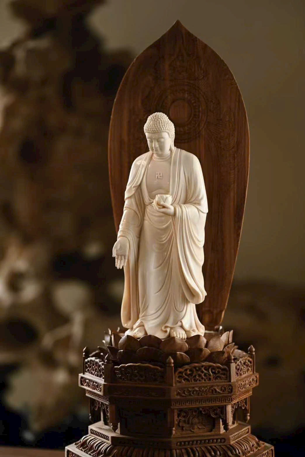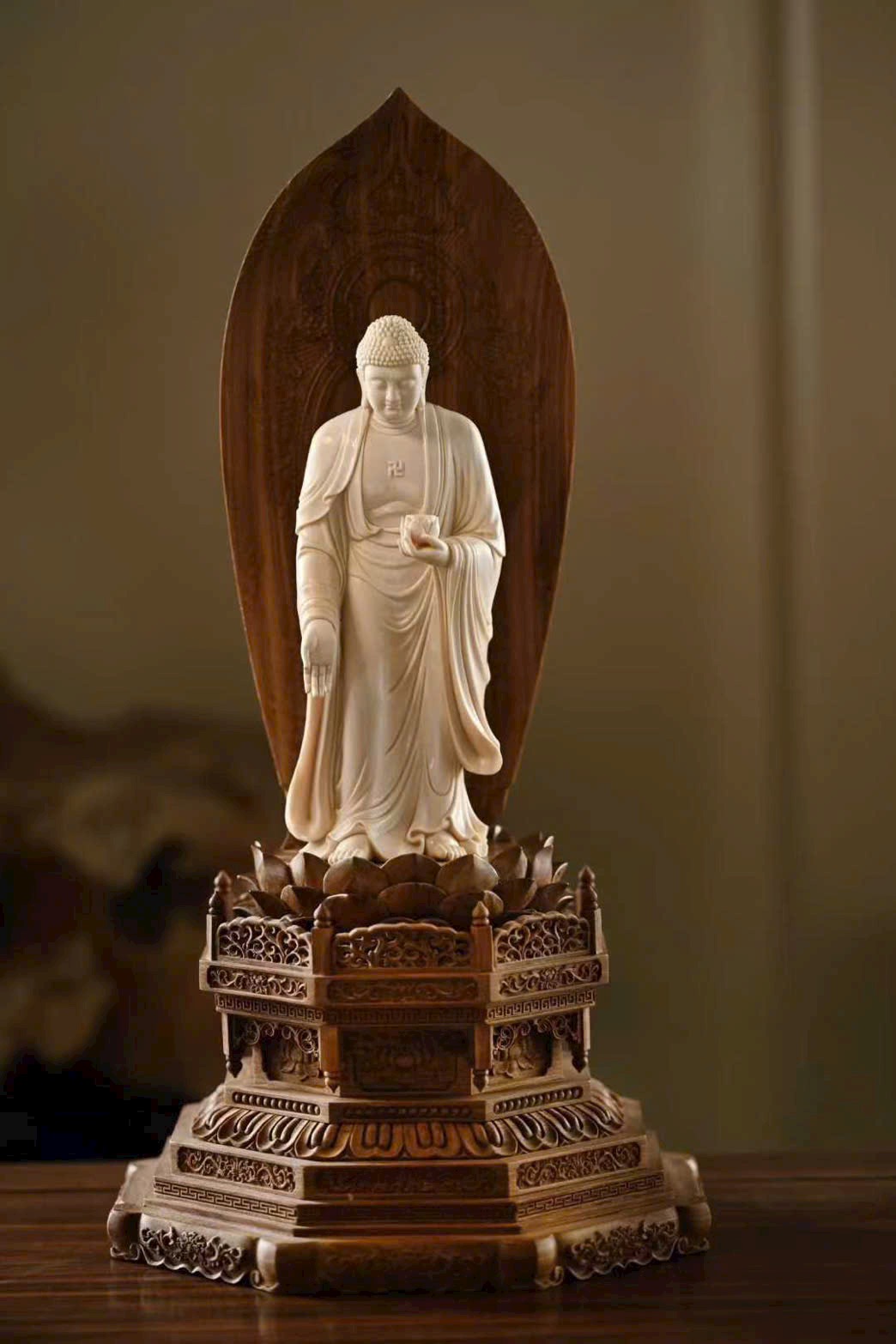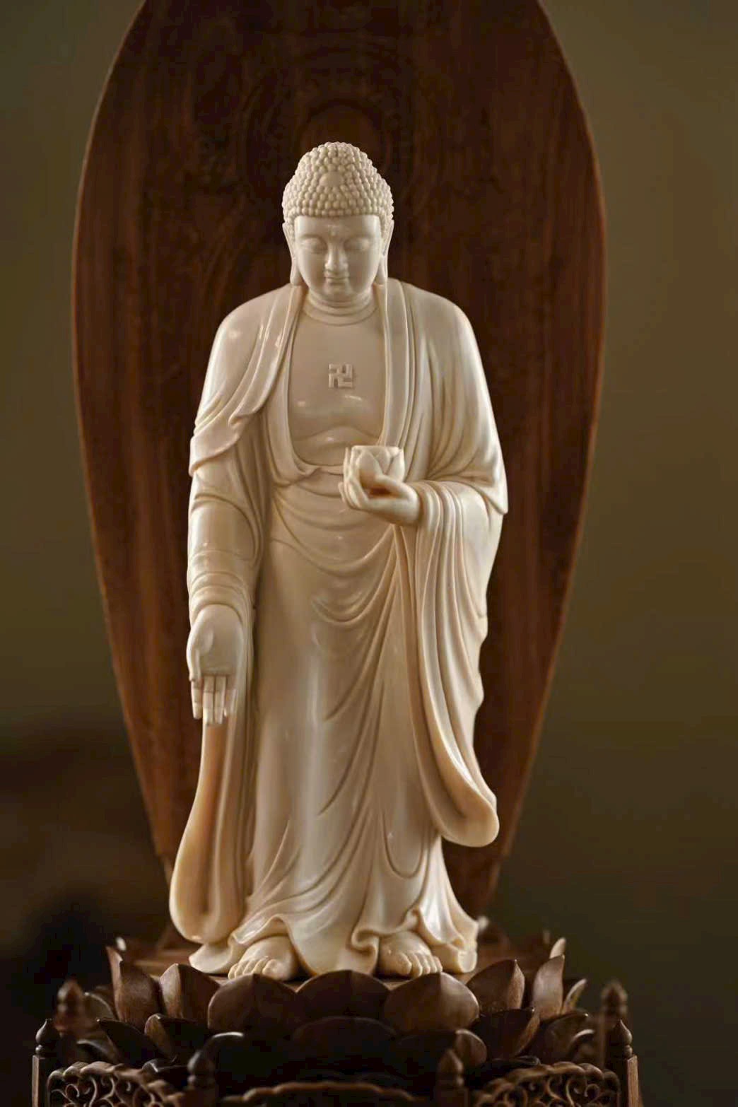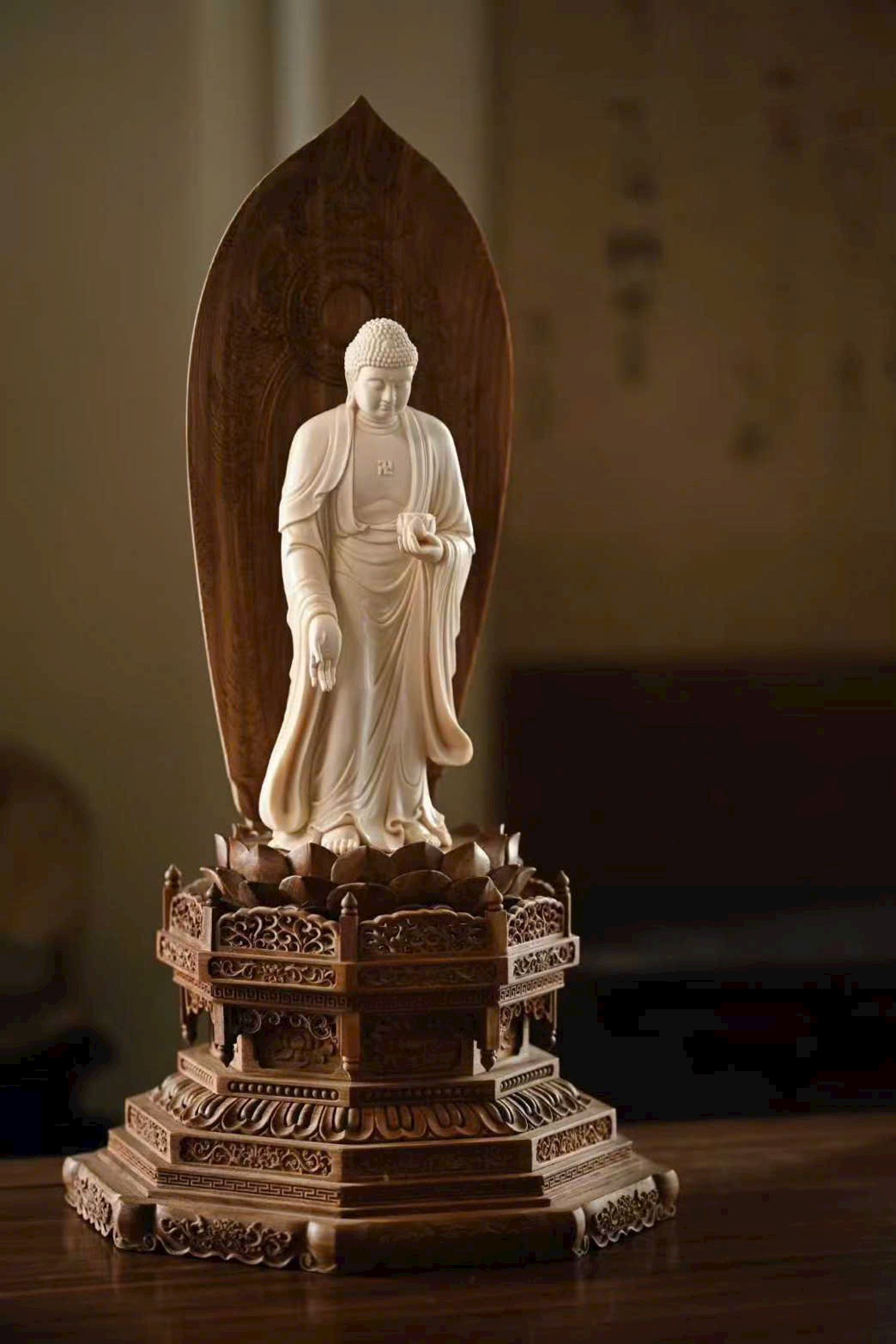 Tượng A Di Đà Phật có búi tóc cao đầy đặn, khuôn mặt viên mãn, lông mày thanh mảnh, đôi mắt dài hiền hòa. Tay trái nâng hoa sen, tay phải buông xuống kết ấn, pháp y rủ nhẹ ôm thân, đường nét mềm mại. Dáng đứng chân trần, thân hình cân đối, toát lên vẻ đẹp tĩnh tại, từ bi và trang nghiêm, thấm đẫm mỹ cảm Phật giáo.