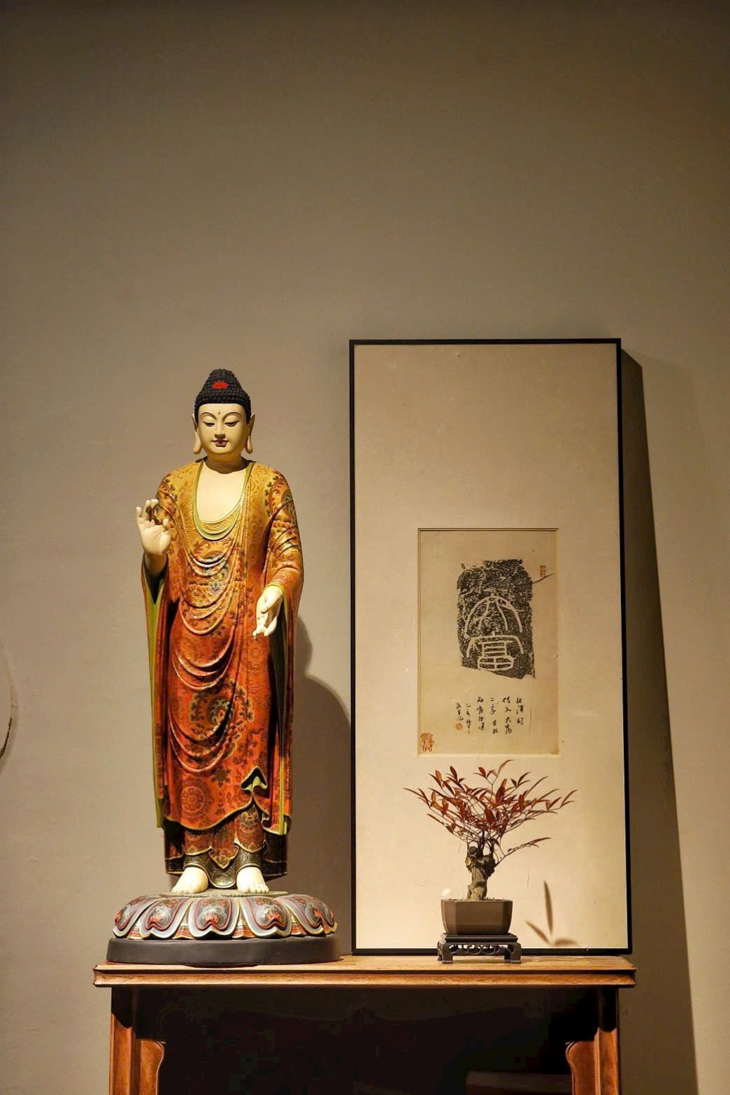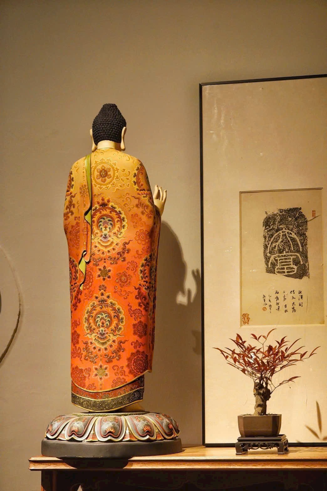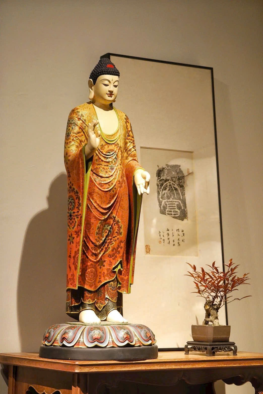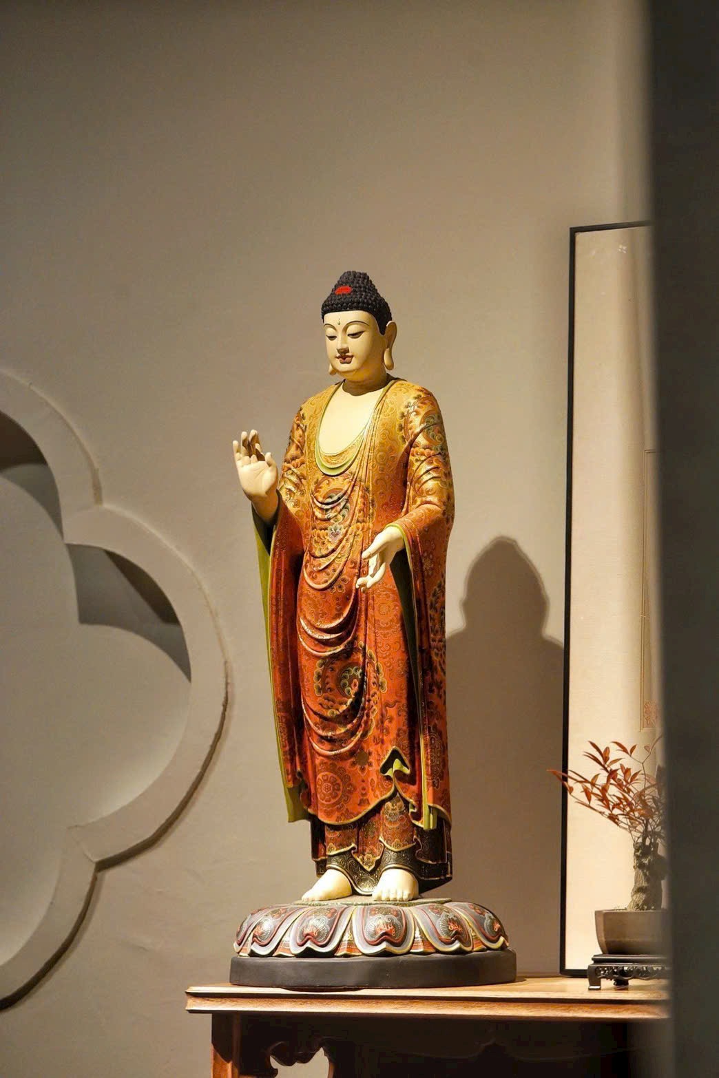 Tôn tượng A Di Đà Phật được chạm khắc tinh xảo từ gỗ long não, toàn thân tô vẽ màu sắc trang nghiêm. Y phục Phật nhiều lớp hoa văn tinh mỹ, lấy tông vàng cam làm chủ đạo, toát lên vẻ tôn nghiêm và cao quý. Gương mặt Phật từ bi, an nhiên, ấn tướng và pháp tướng thù thắng, mang ý nghĩa gia hộ bình an và giác ngộ. Đây là tác phẩm giá trị cho việc chiêm bái – thờ phụng cũng như sưu tầm, thưởng lãm.