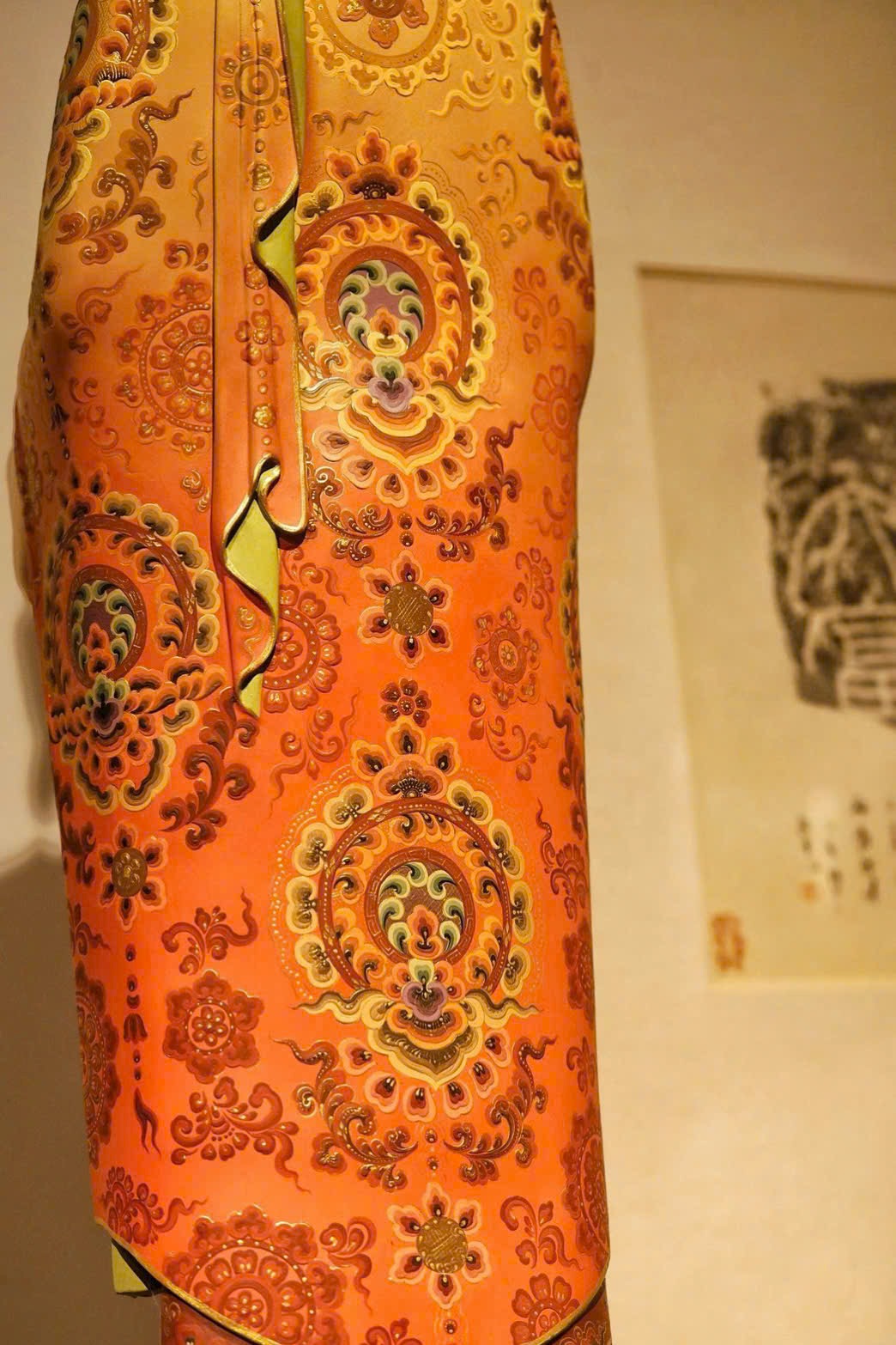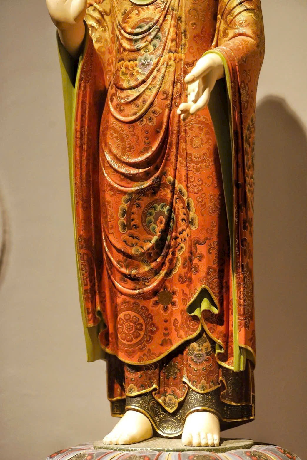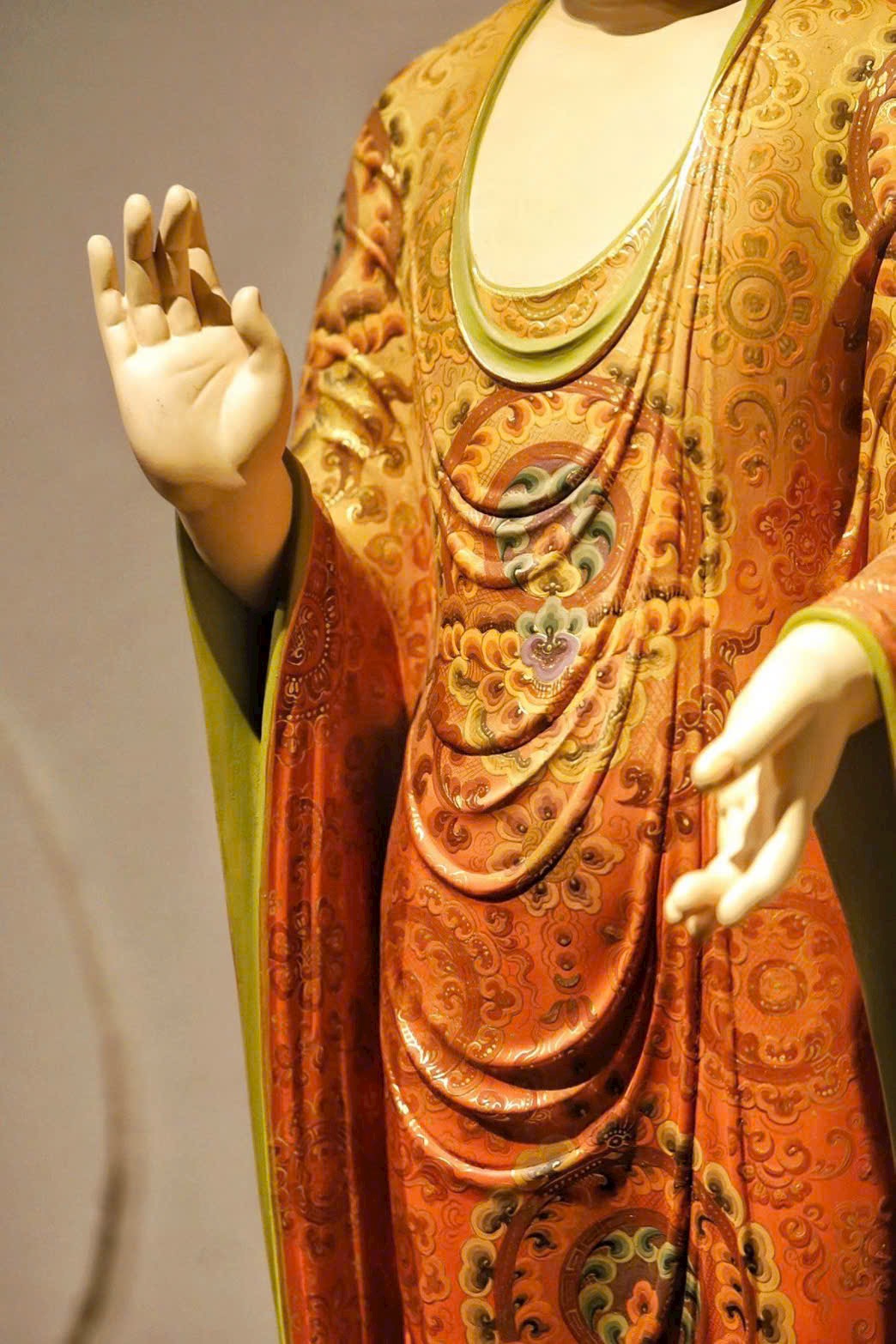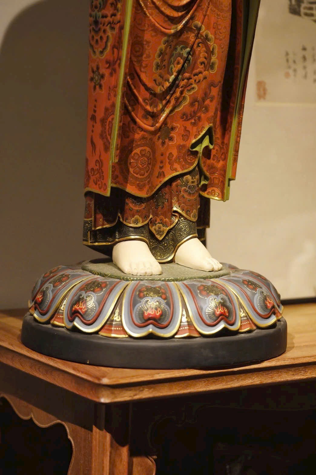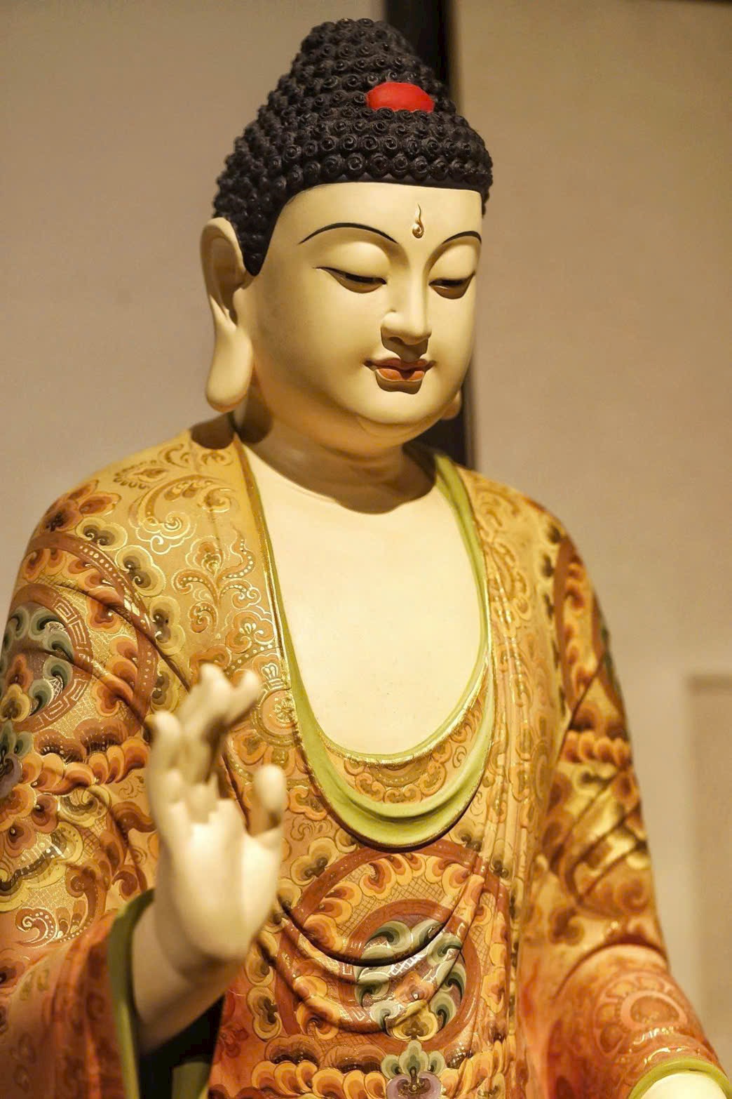 Tôn tượng A Di Đà Phật được chạm khắc tinh xảo từ gỗ long não, toàn thân tô vẽ màu sắc trang nghiêm. Y phục Phật nhiều lớp hoa văn tinh mỹ, lấy tông vàng cam làm chủ đạo, toát lên vẻ tôn nghiêm và cao quý. Gương mặt Phật từ bi, an nhiên, ấn tướng và pháp tướng thù thắng, mang ý nghĩa gia hộ bình an và giác ngộ. Đây là tác phẩm giá trị cho việc chiêm bái – thờ phụng cũng như sưu tầm, thưởng lãm.