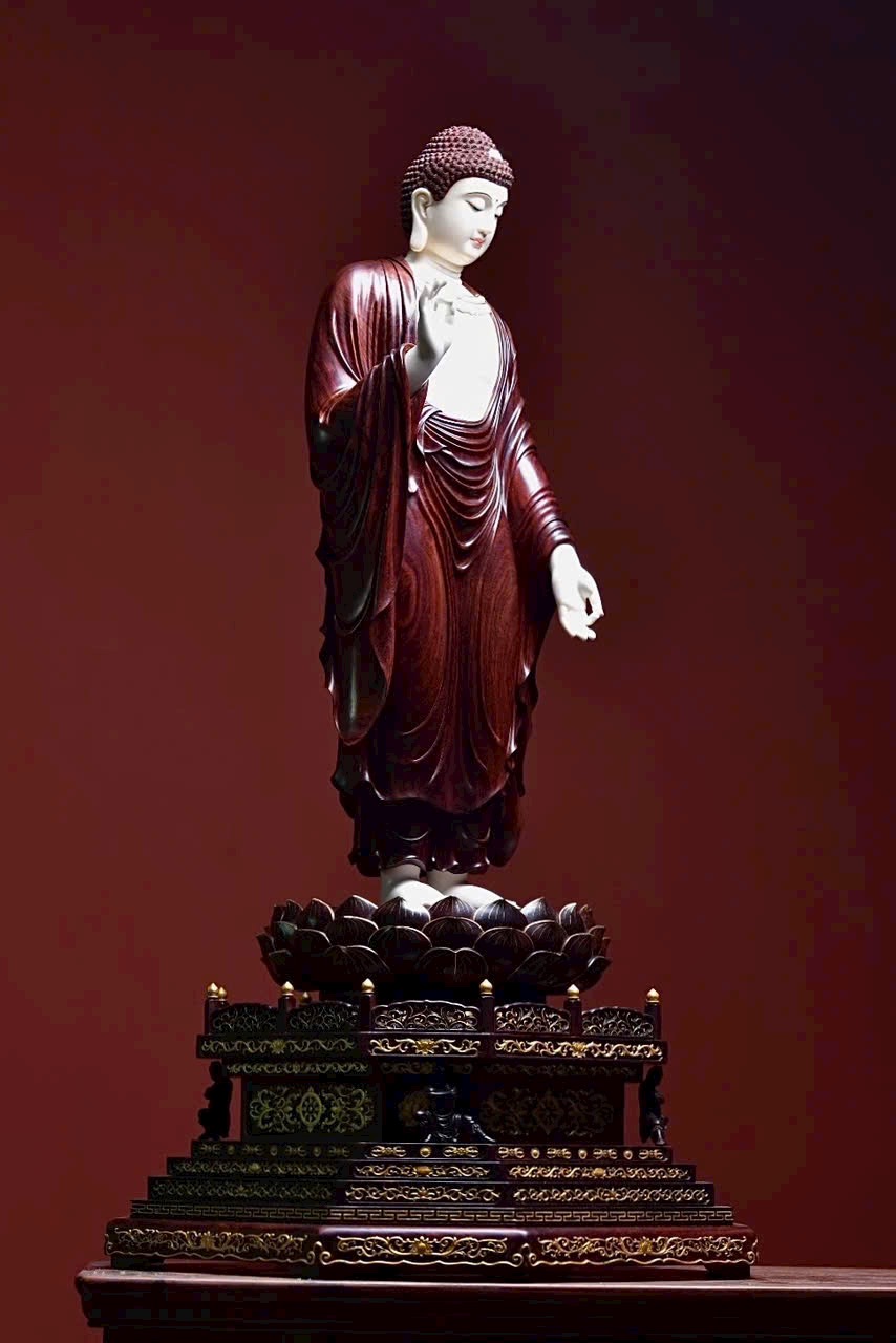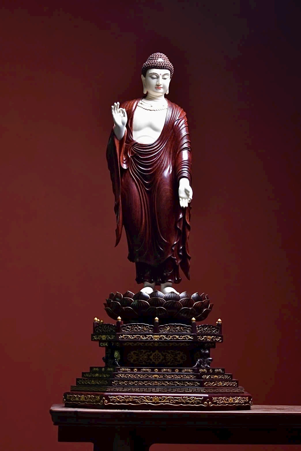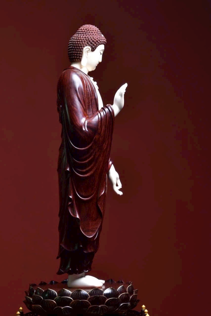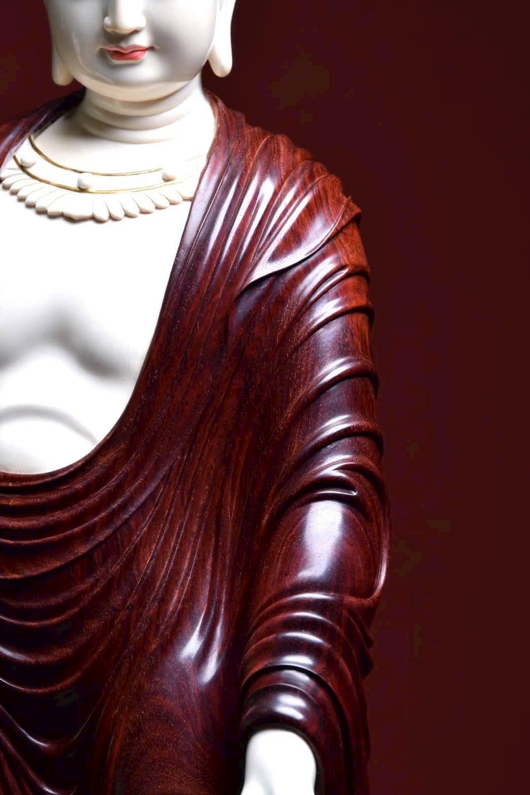 Tượng Phật được khắc họa với dáng vẻ an nhiên, tĩnh tại, hình dáng sống động đầy thần thái. Đầu búi tròn đầy, khuôn mặt rộng mở, tai dài chạm vai, toát lên nét từ hòa hiền hậu. Đôi mắt khép hờ, khoác pháp y trùm cả hai vai, các nếp áo được chạm thành từng lớp tinh tế, hiếm có. Tác phẩm sử dụng gỗ tử đàn nhỏ lá Ấn Độ làm nền, khảm n.gà voi ma mút nhằm tôn vinh sự tôn quý của đức Phật.
