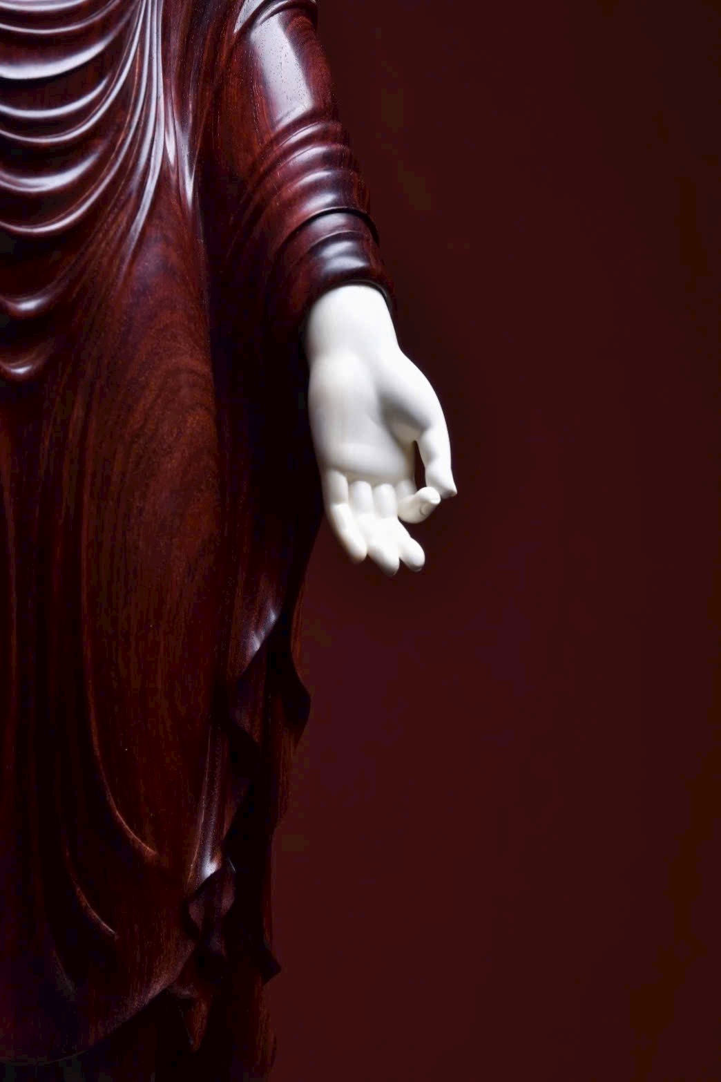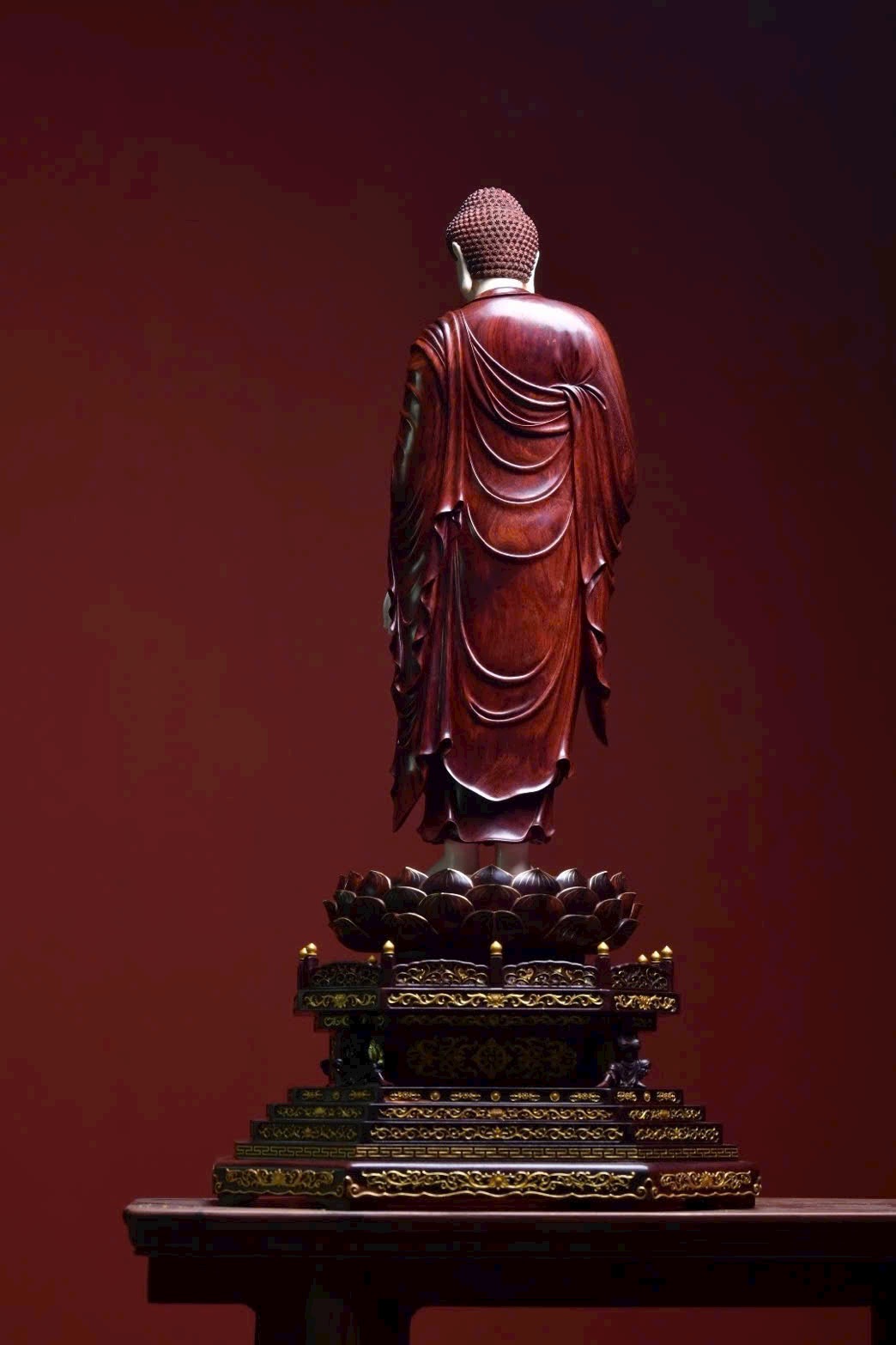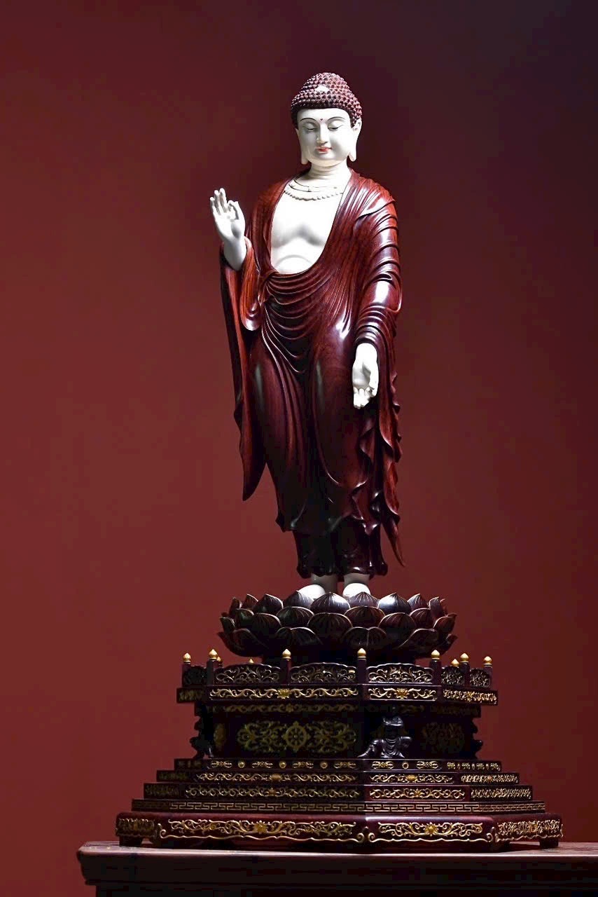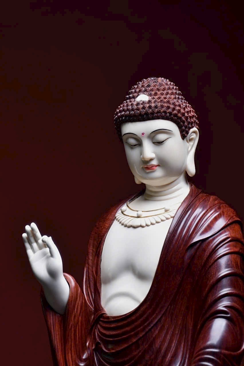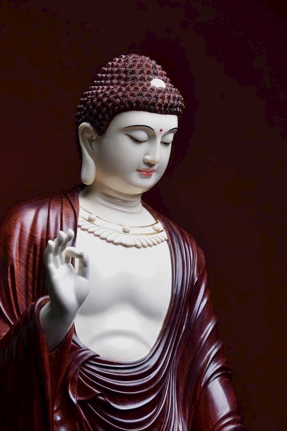 Tượng Phật được khắc họa với dáng vẻ an nhiên, tĩnh tại, hình dáng sống động đầy thần thái. Đầu búi tròn đầy, khuôn mặt rộng mở, tai dài chạm vai, toát lên nét từ hòa hiền hậu. Đôi mắt khép hờ, khoác pháp y trùm cả hai vai, các nếp áo được chạm thành từng lớp tinh tế, hiếm có. Tác phẩm sử dụng gỗ tử đàn nhỏ lá Ấn Độ làm nền, khảm n.gà voi ma mút nhằm tôn vinh sự tôn quý của đức Phật.