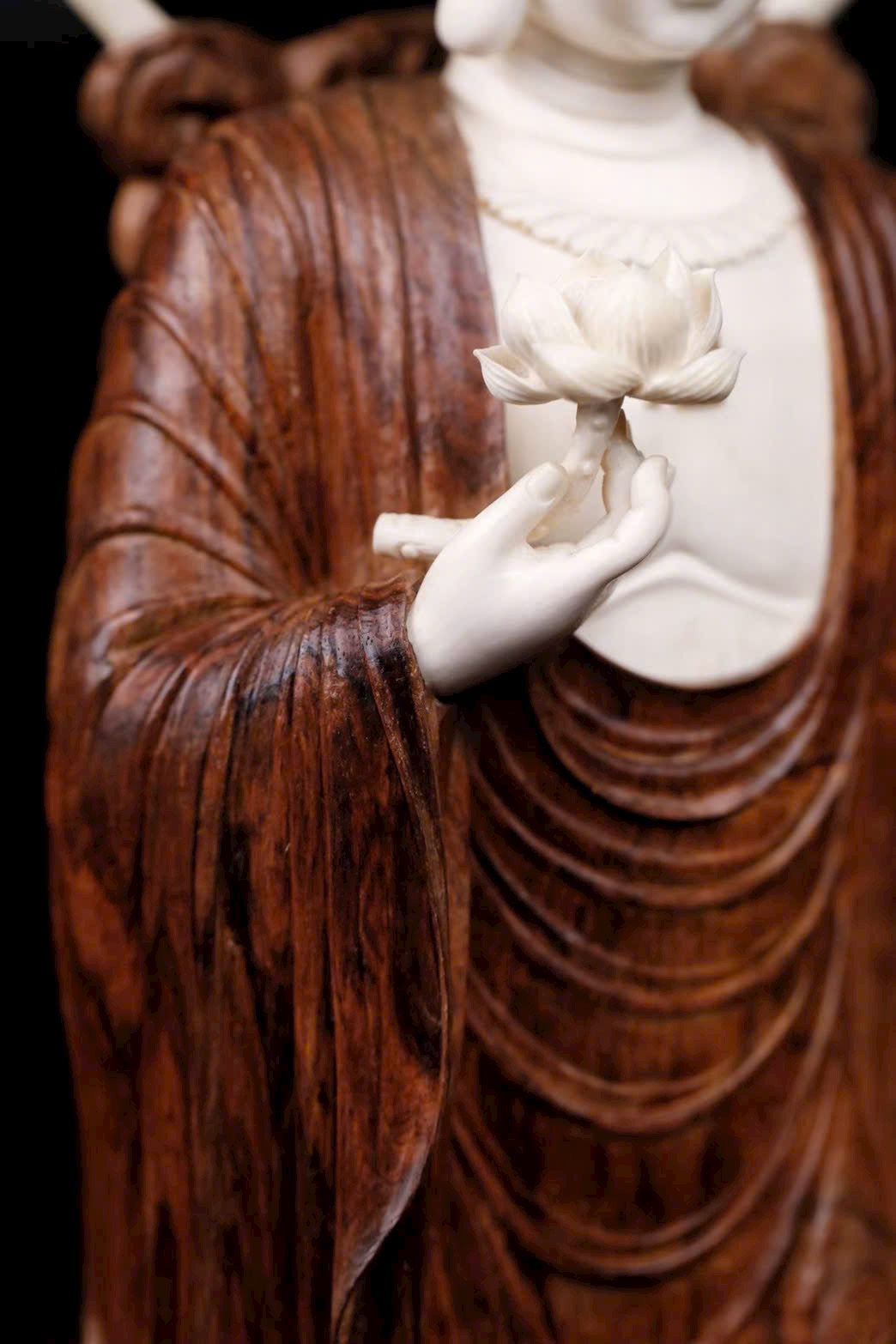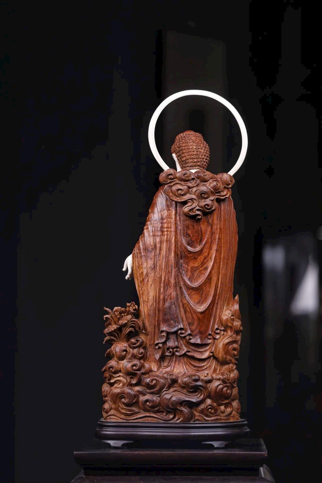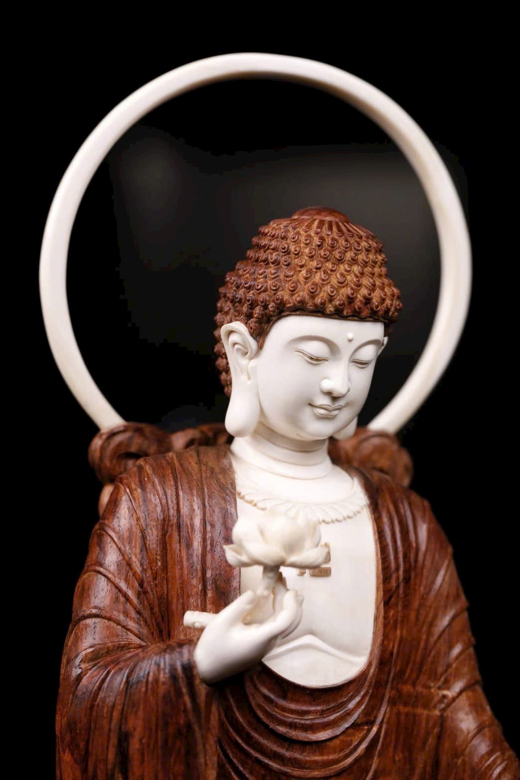 Tác phẩm kết hợp gỗ Hoàng Hải Nam với mamut vạn năm tinh tế, tạo nên hình tượng Phật A Di Đà trang nghiêm.
