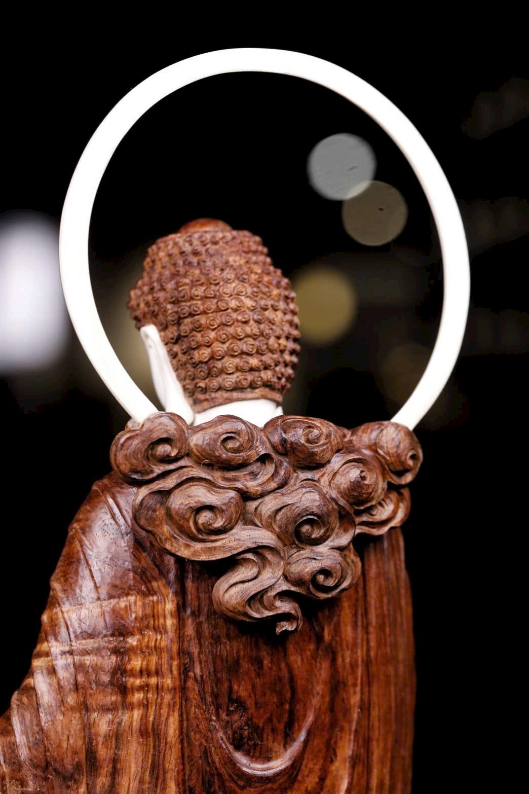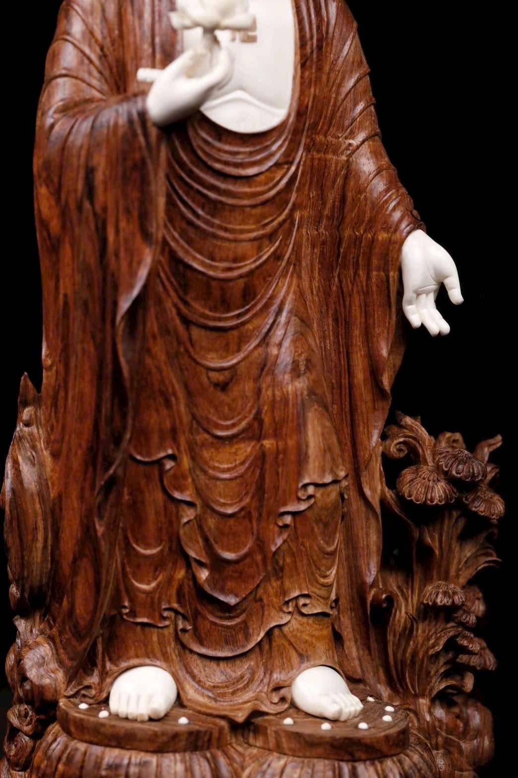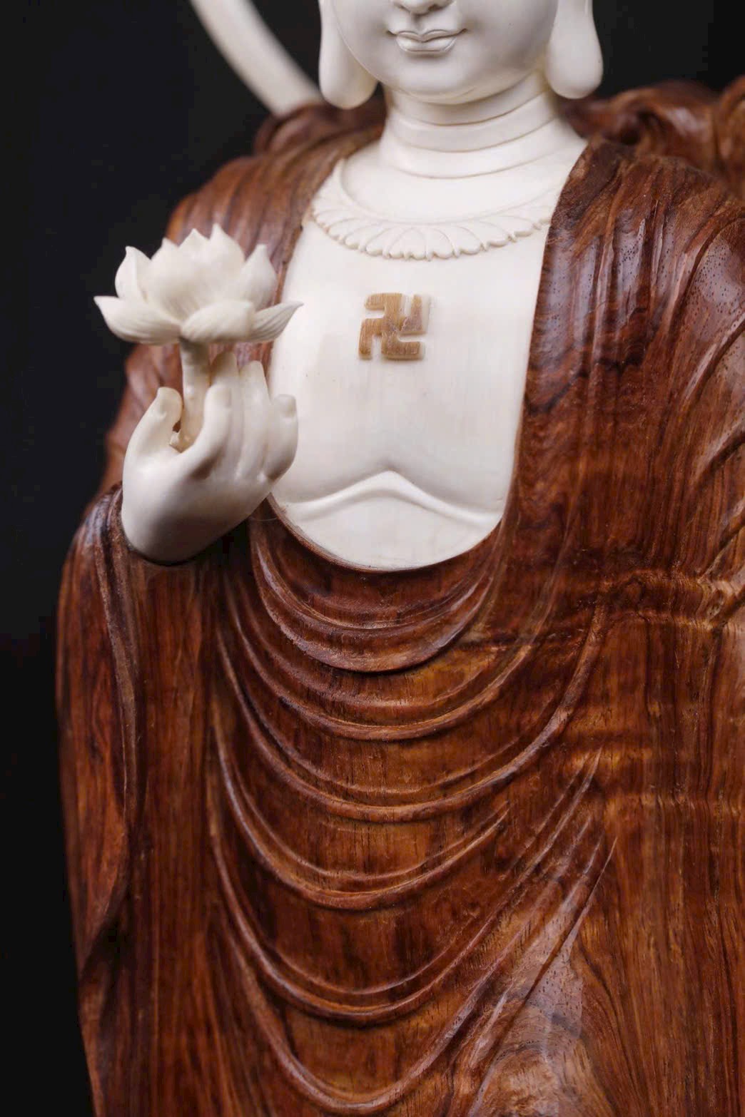 Tác phẩm kết hợp gỗ Hoàng Hải Nam với mamut vạn năm tinh tế, tạo nên hình tượng Phật A Di Đà trang nghiêm.
