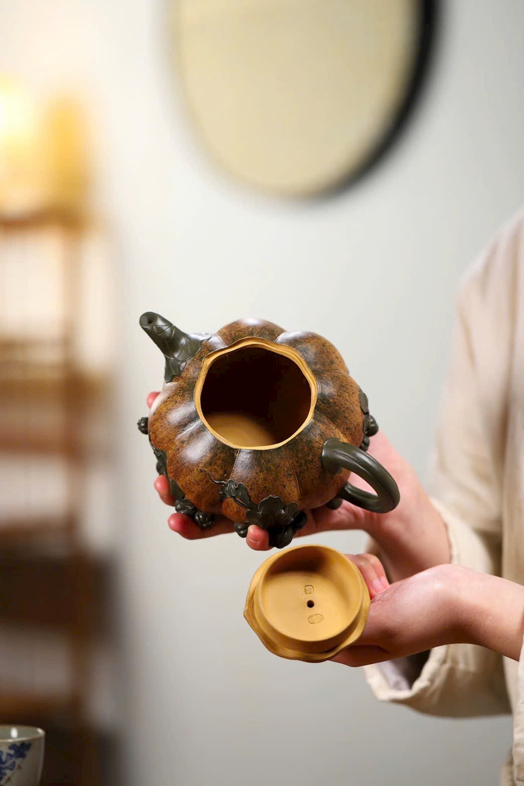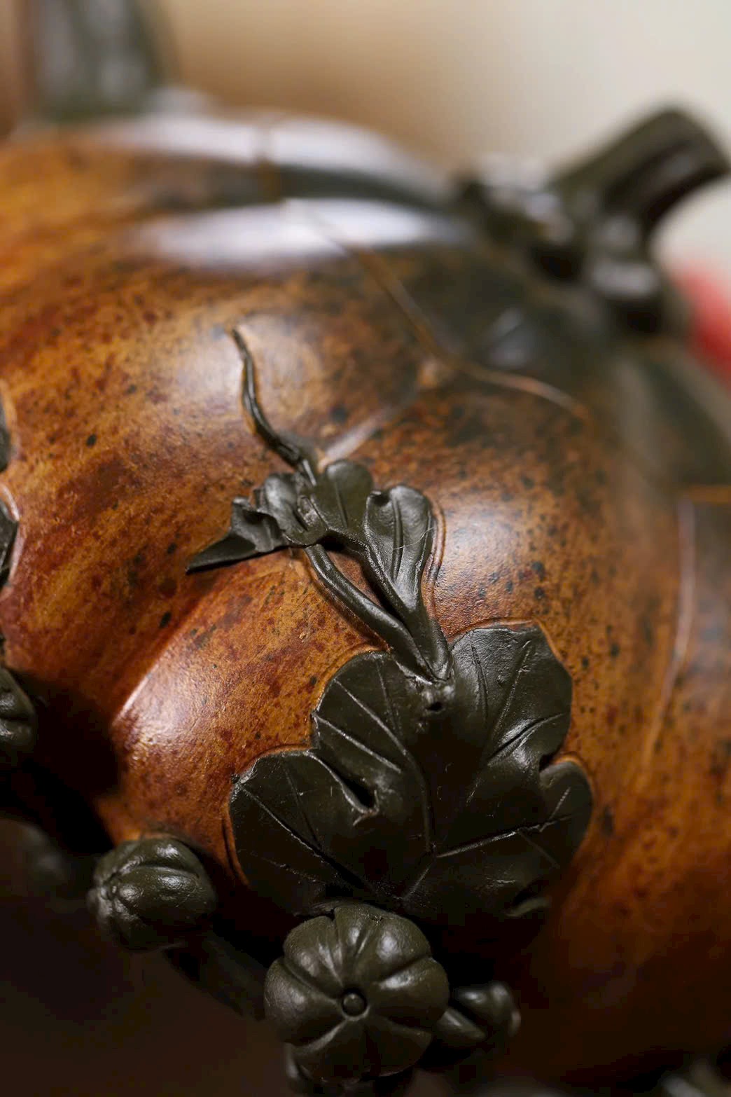 Thân ấm được điểm xuyết bằng đoạn nê với nhiều sắc độ khác nhau, tái hiện kết cấu sần tự nhiên của vỏ bí.