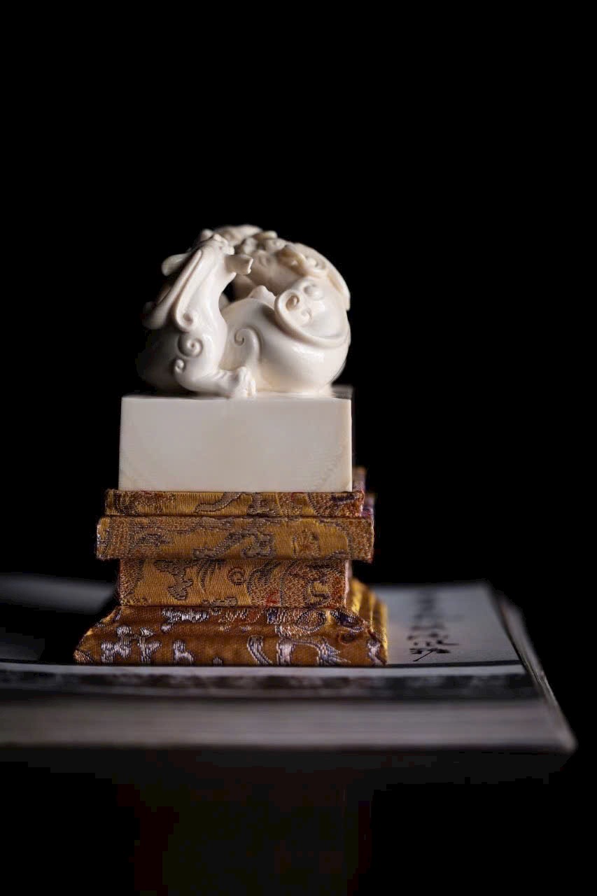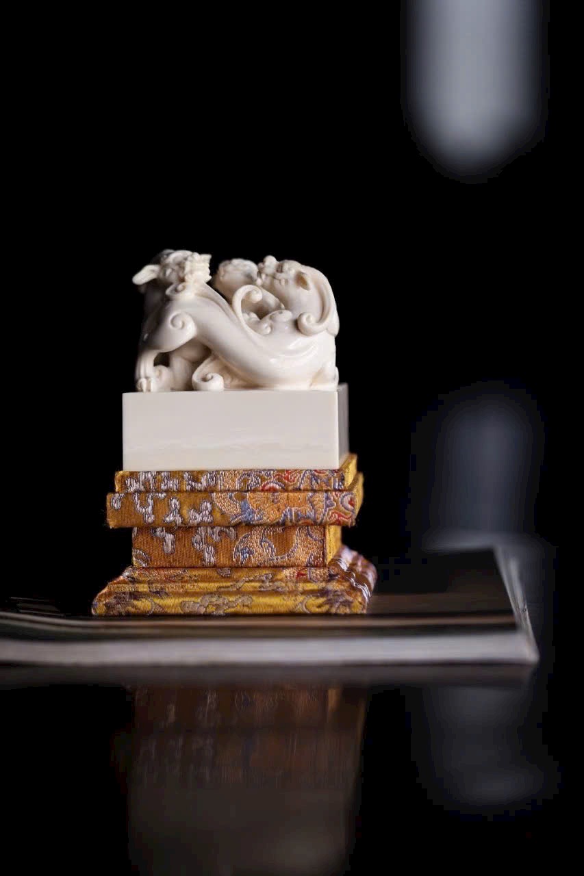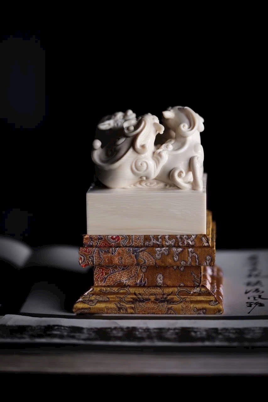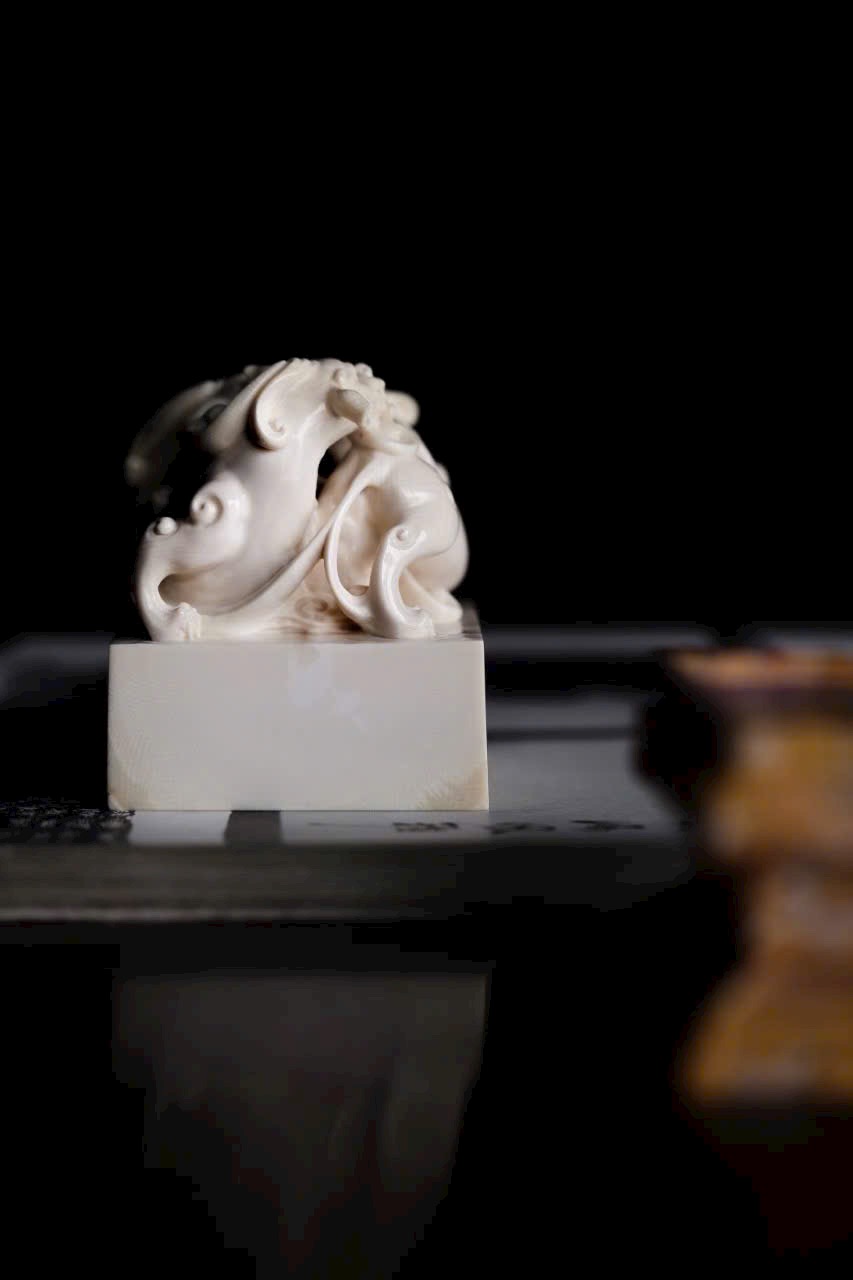 Chất ng.à trắng bóng như mỡ, núm ấn khắc hình tì long uốn mình chiếm giữ. Thân rồng khỏe khoắn, vảy vuốt tung bay, đôi mắt sáng rực toát ra uy thế. Đế ấn vuông vắn, khi in dấu chu sa, tựa như mây lành phá giấy hiện ra, khiến thư phòng bừng khí thế rồng hổ.
