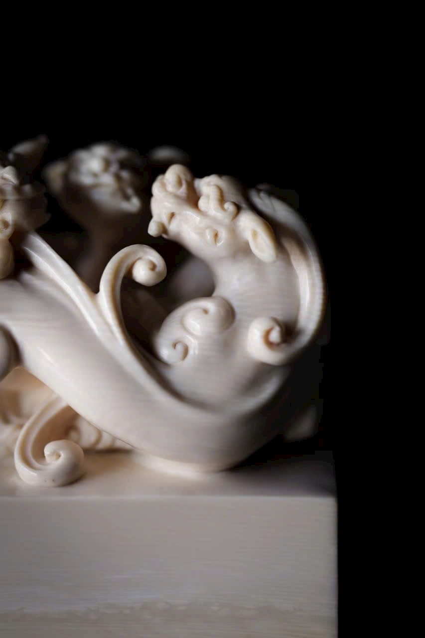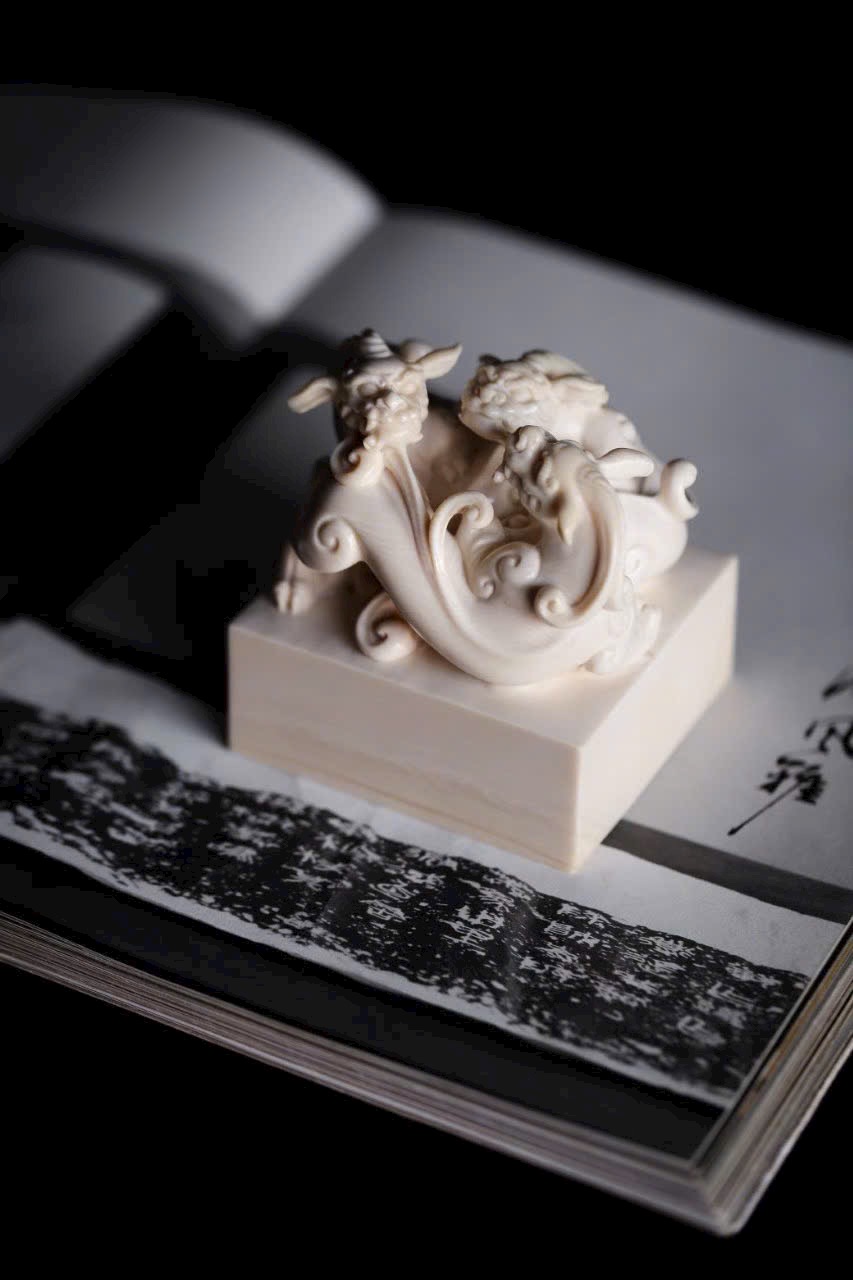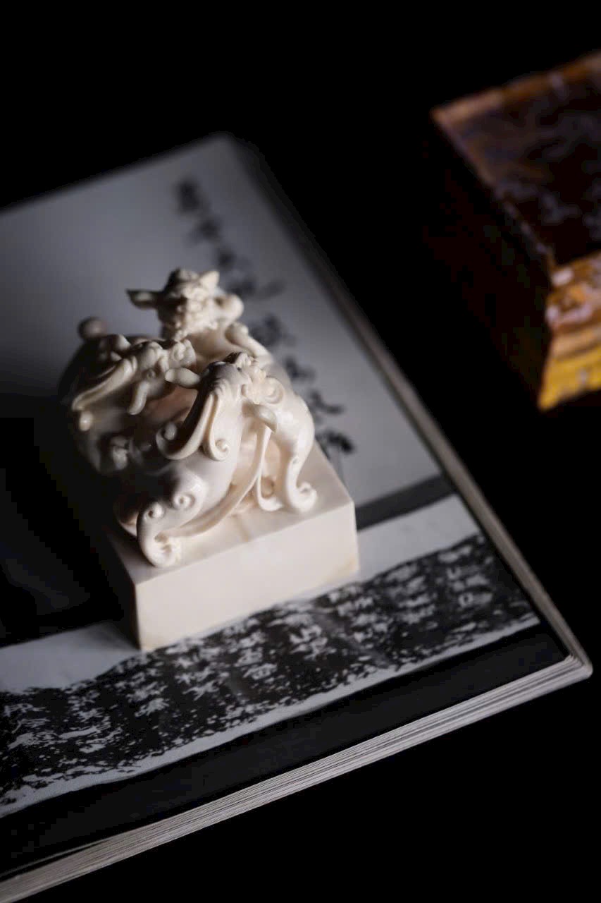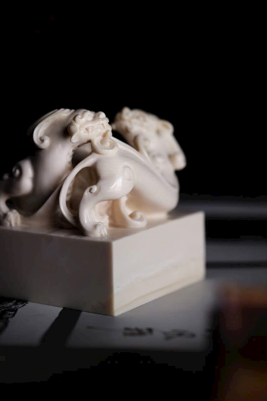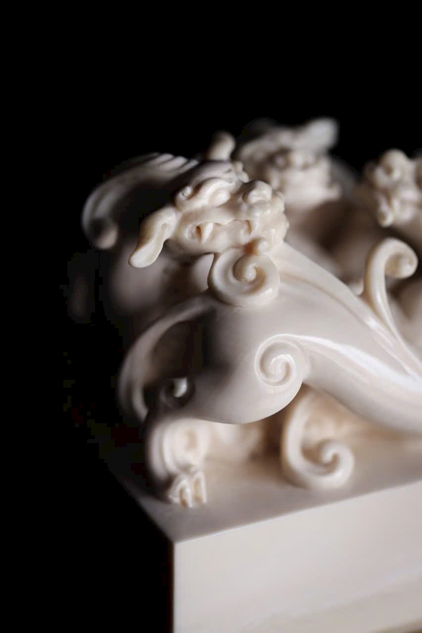 Chất ng.à trắng bóng như mỡ, núm ấn khắc hình tì long uốn mình chiếm giữ. Thân rồng khỏe khoắn, vảy vuốt tung bay, đôi mắt sáng rực toát ra uy thế. Đế ấn vuông vắn, khi in dấu chu sa, tựa như mây lành phá giấy hiện ra, khiến thư phòng bừng khí thế rồng hổ.