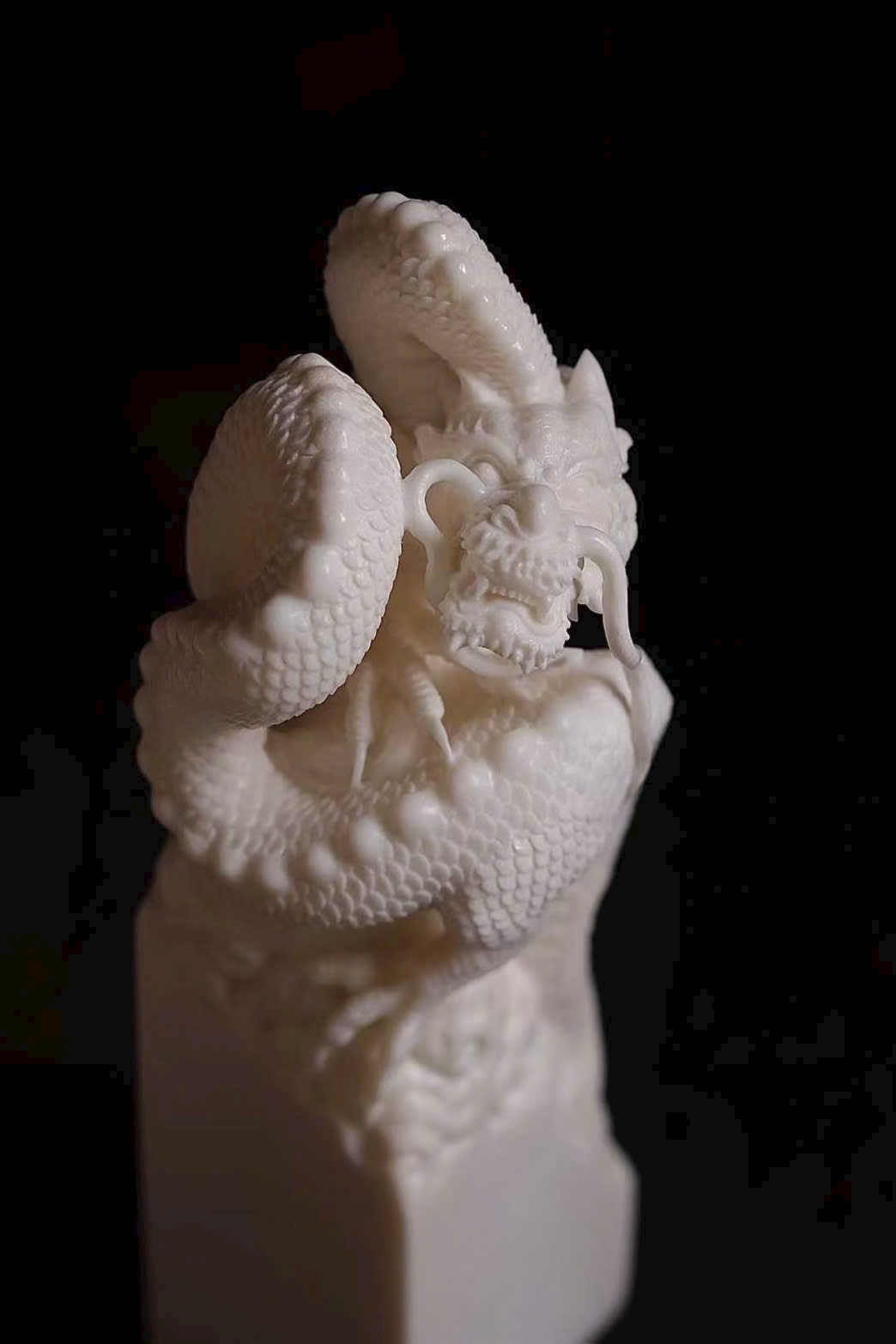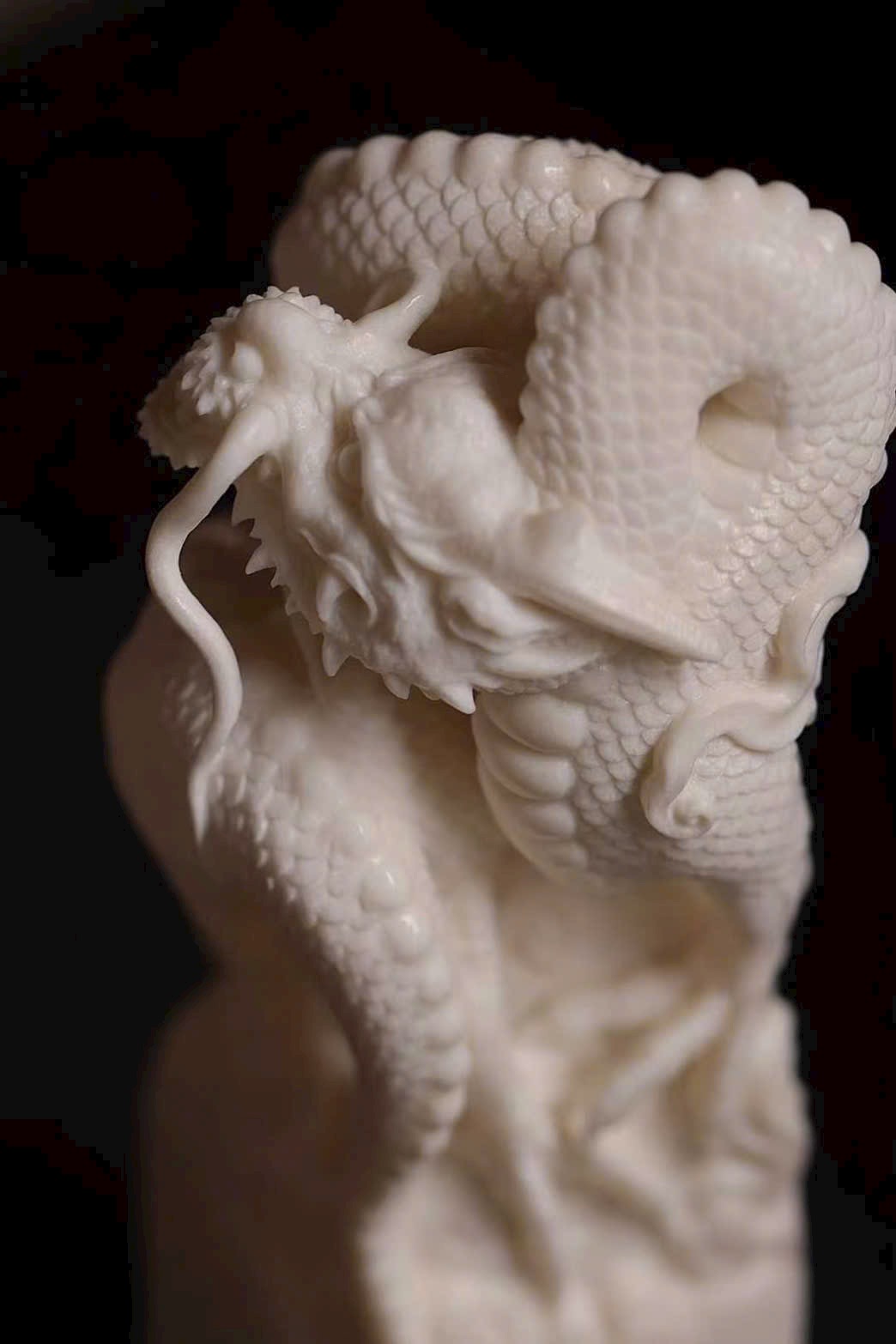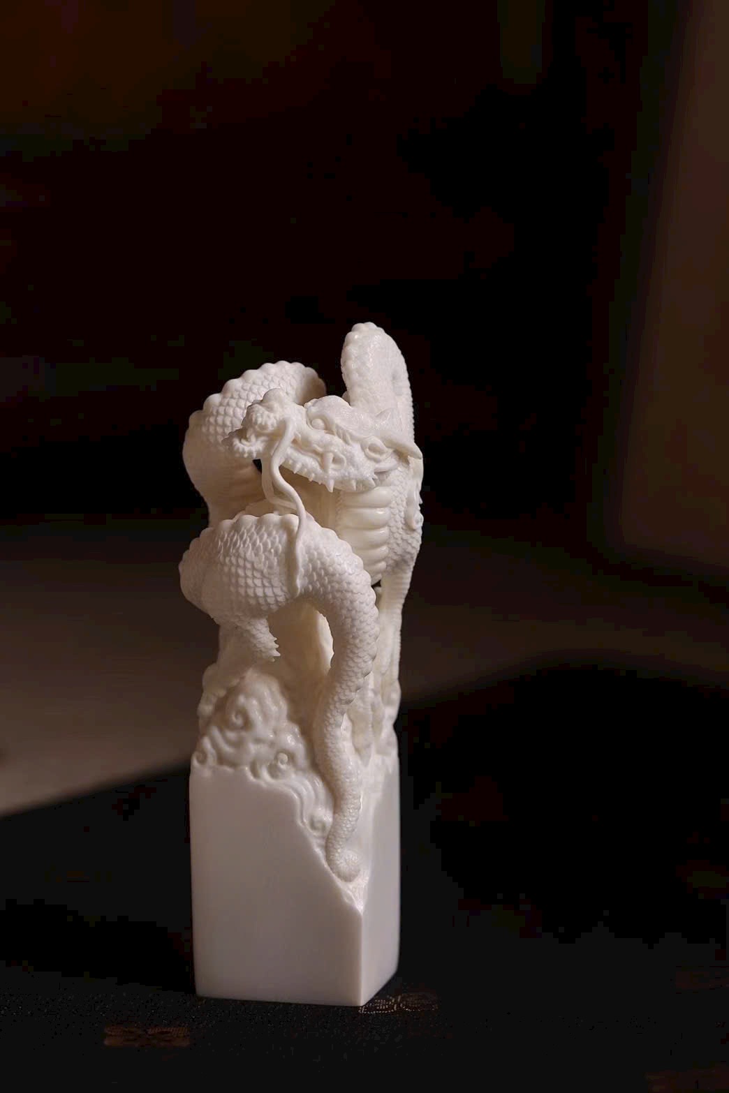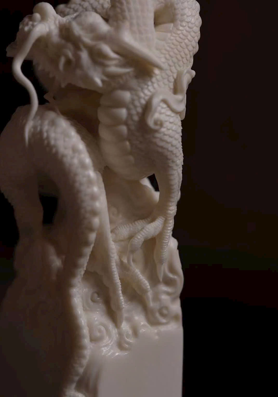 Chất liệu dày dặn, đường dao uyển chuyển linh hoạt, chạm khắc rồng lành uốn lượn thăng vút, sinh động đầy sức mạnh. Rồng tung bờm, mắt giận trừng sáng, bốn vuốt sắc bén mạnh mẽ, khí thế hiên ngang. Thân hình xoắn lượn giữa mây mù, xuyên qua núi đá, đạp trên sóng cả cuộn trào, tạo cảm giác lập thể rõ nét cùng sức căng thị giác mạnh mẽ. Tác phẩm vừa phóng khoáng vừa tinh tế, thích hợp cầm chơi thưởng lãm, nổi bật rực rỡ, mang ý nghĩa “phẳng lặng mà bước lên mây xanh, công danh thuận lợi”.