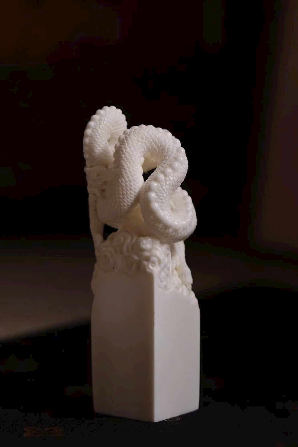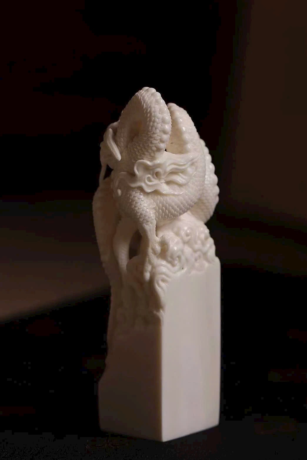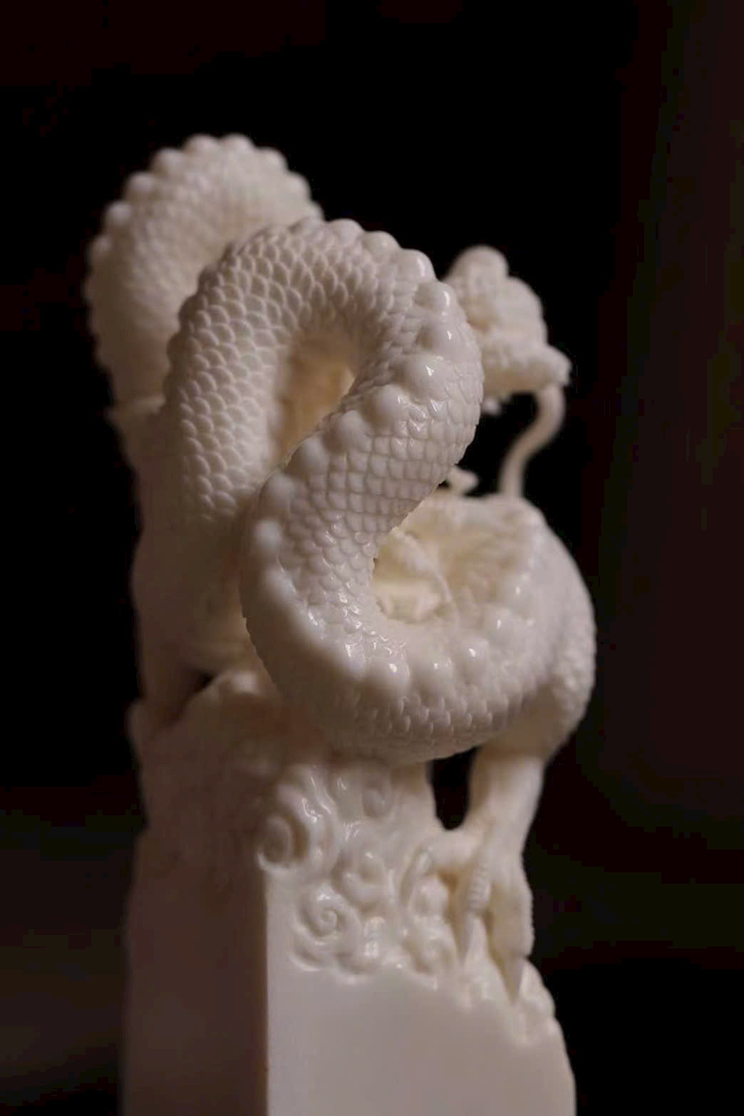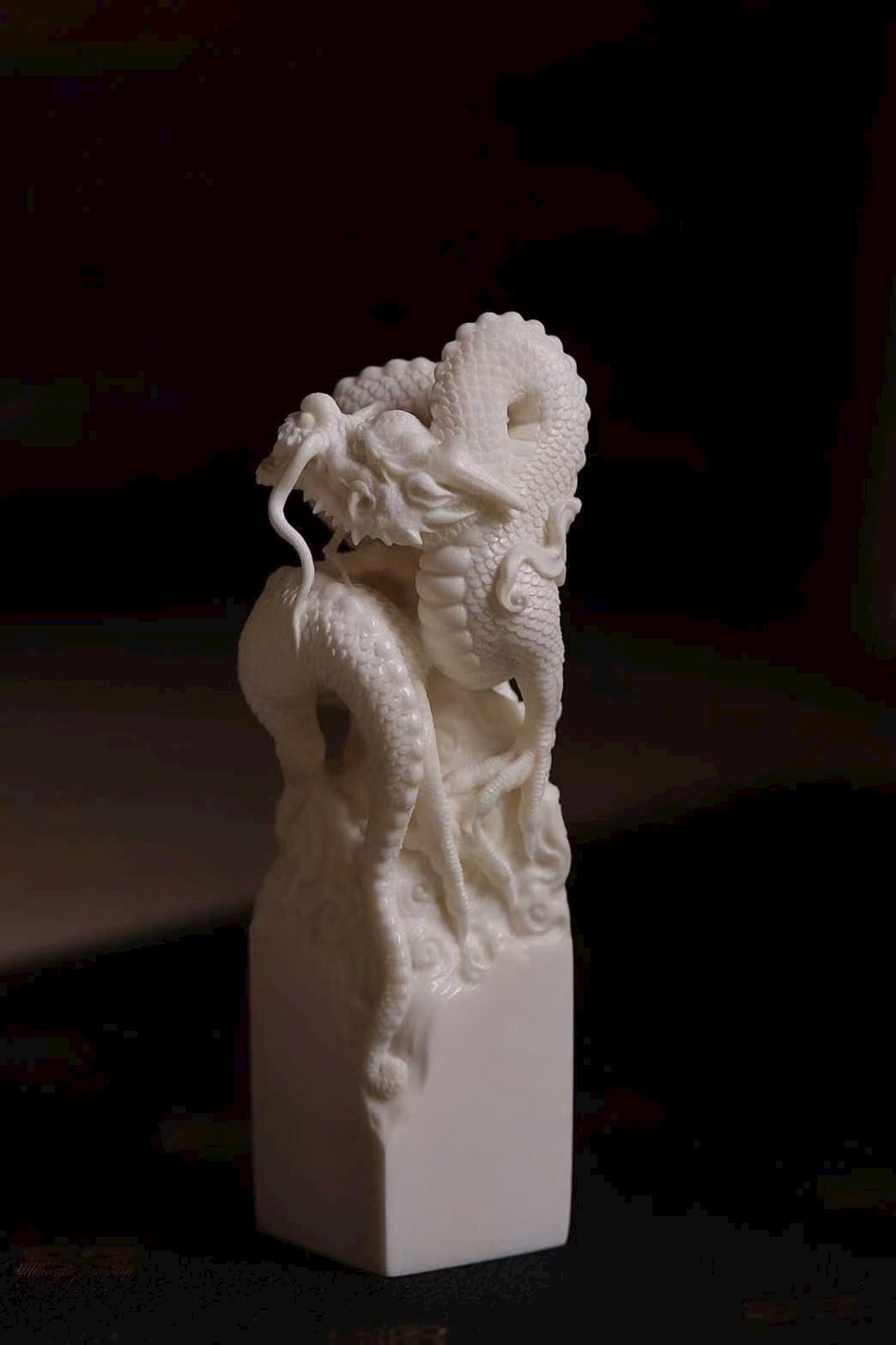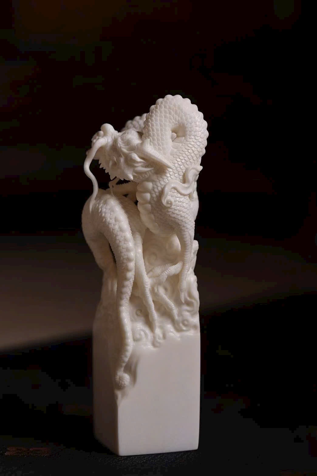 Chất liệu dày dặn, đường dao uyển chuyển linh hoạt, chạm khắc rồng lành uốn lượn thăng vút, sinh động đầy sức mạnh. Rồng tung bờm, mắt giận trừng sáng, bốn vuốt sắc bén mạnh mẽ, khí thế hiên ngang. Thân hình xoắn lượn giữa mây mù, xuyên qua núi đá, đạp trên sóng cả cuộn trào, tạo cảm giác lập thể rõ nét cùng sức căng thị giác mạnh mẽ. Tác phẩm vừa phóng khoáng vừa tinh tế, thích hợp cầm chơi thưởng lãm, nổi bật rực rỡ, mang ý nghĩa “phẳng lặng mà bước lên mây xanh, công danh thuận lợi”.