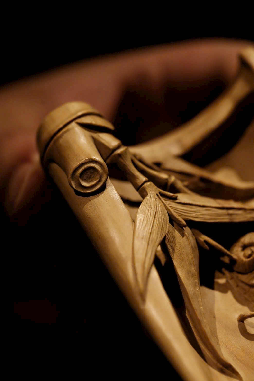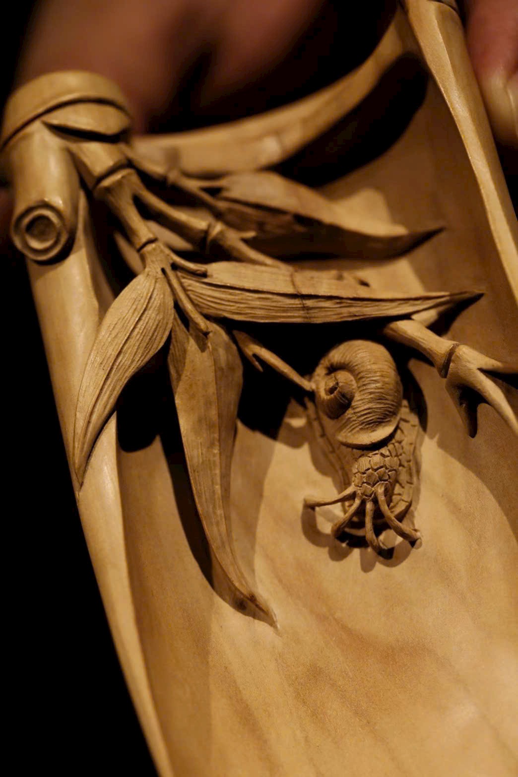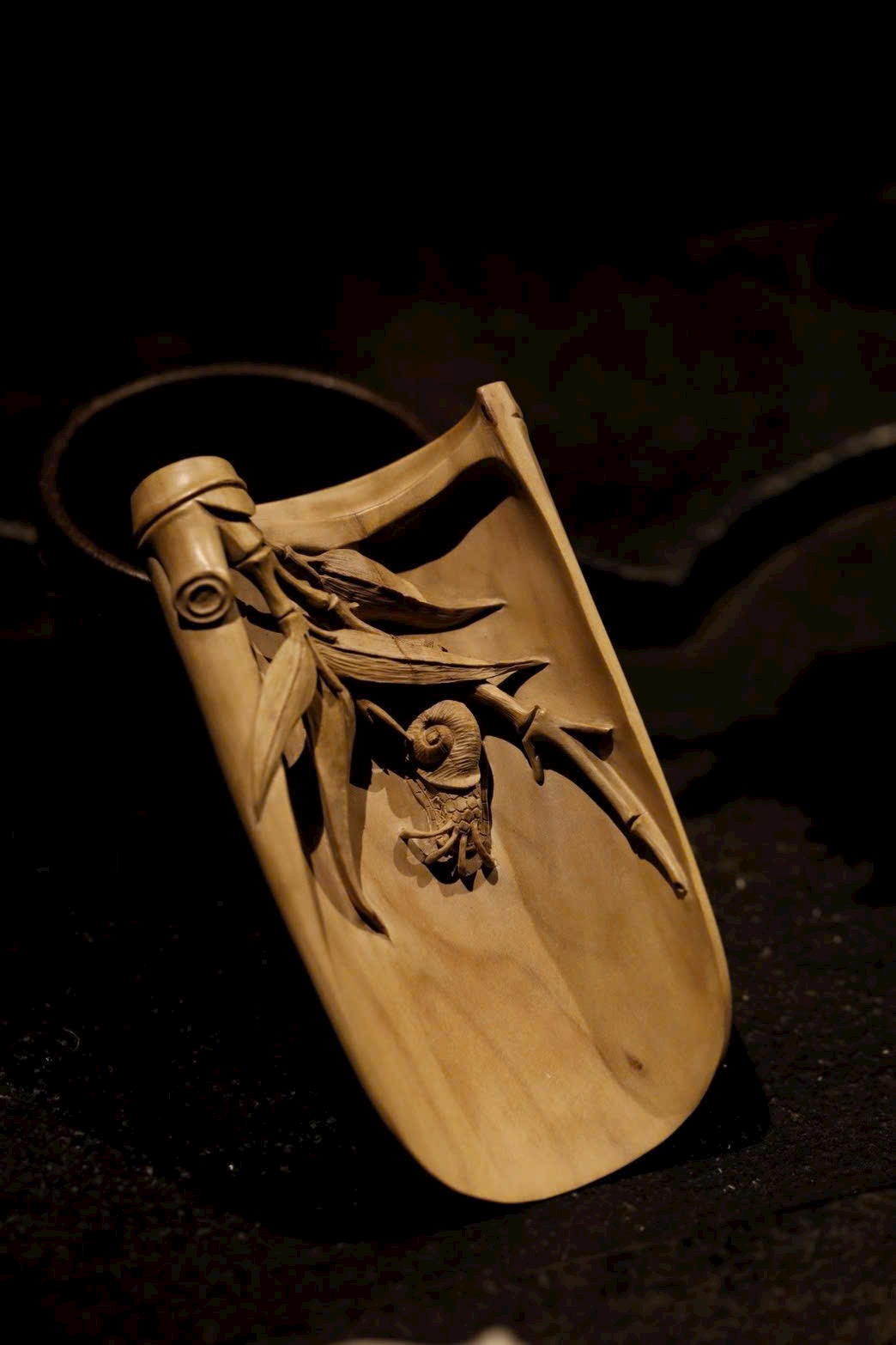 Trà tắc được chạm khắc tinh xảo, tạo hình cành trúc vươn dài, chú ốc nhỏ an cư trên đó, đường dao tỉ mỉ tinh vi. Khi lấy trà, hương gỗ quyện cùng hương trà, là món trà cụ nhỏ bé mà thanh nhã, gợi nên phong vị tao nhã trong nghệ sự thưởng trà.