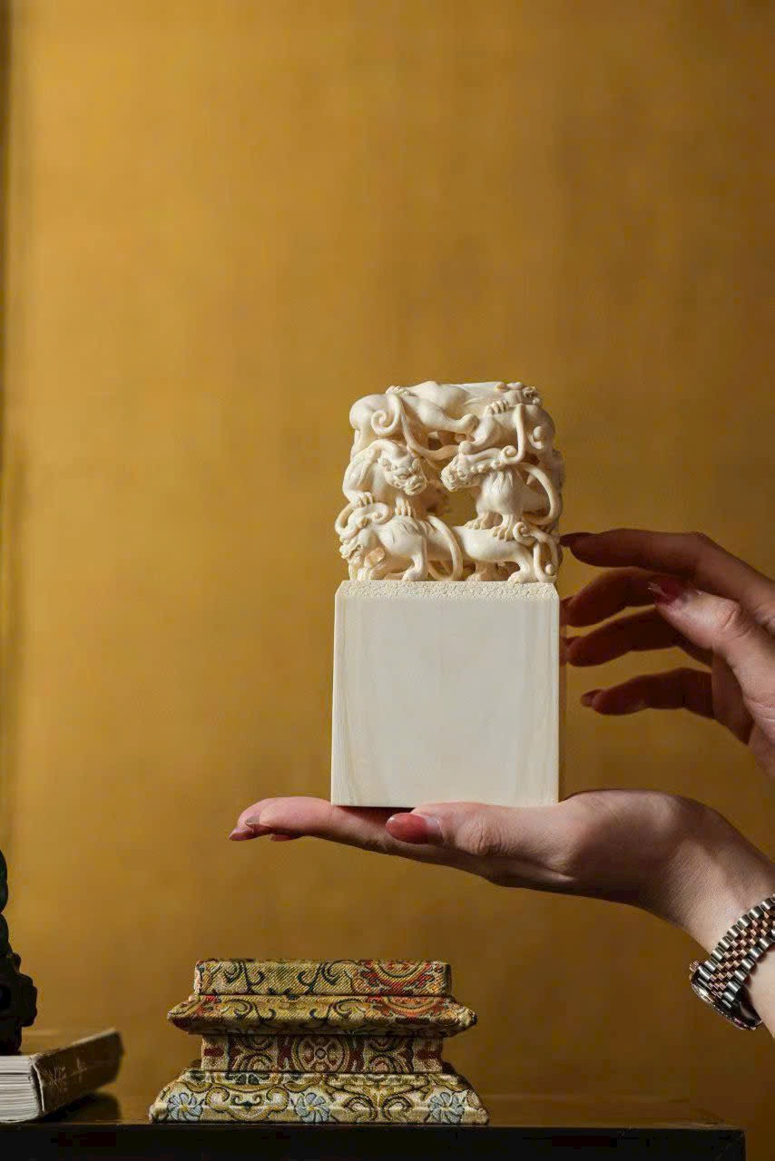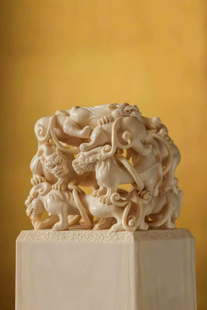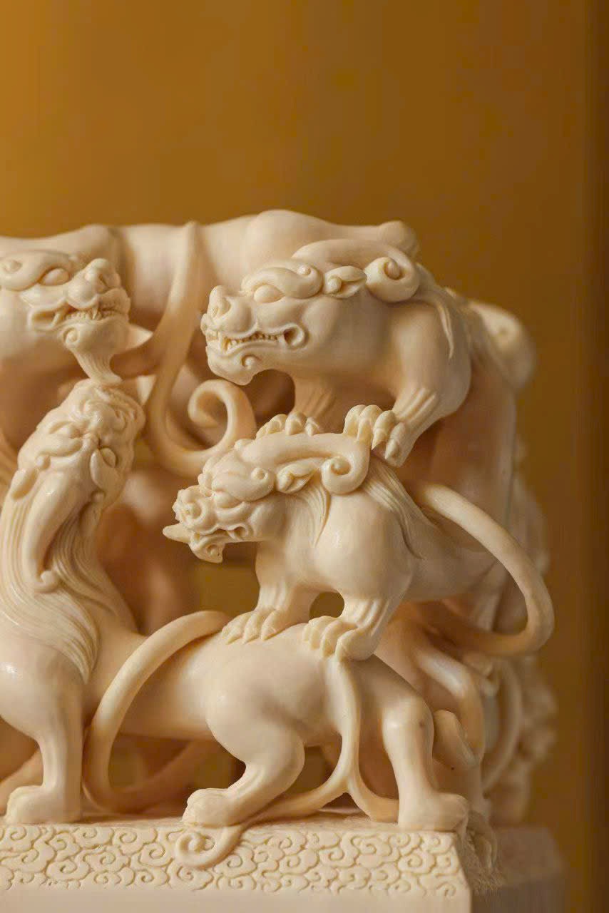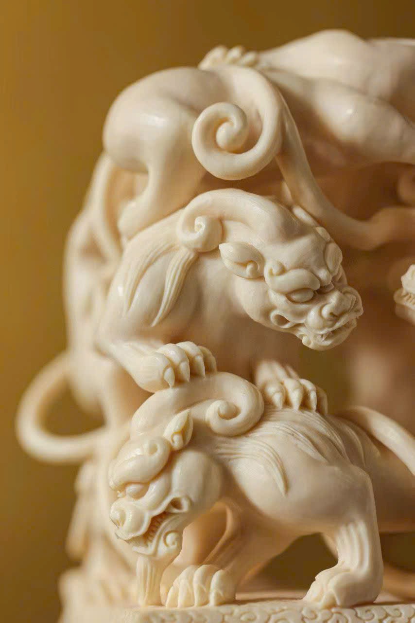 Tác phẩm chế tác từ ng.à ma mút tự nhiên, chất ngà ấm mịn như ngọc, đường vân thanh thoát. Đường dao khắc tinh tế, uyển chuyển và đầy sức sống. Phần chạm nổi long ly uốn lượn, thân hình cuộn xoắn linh hoạt, thần thái oai nghiêm mà sinh động.