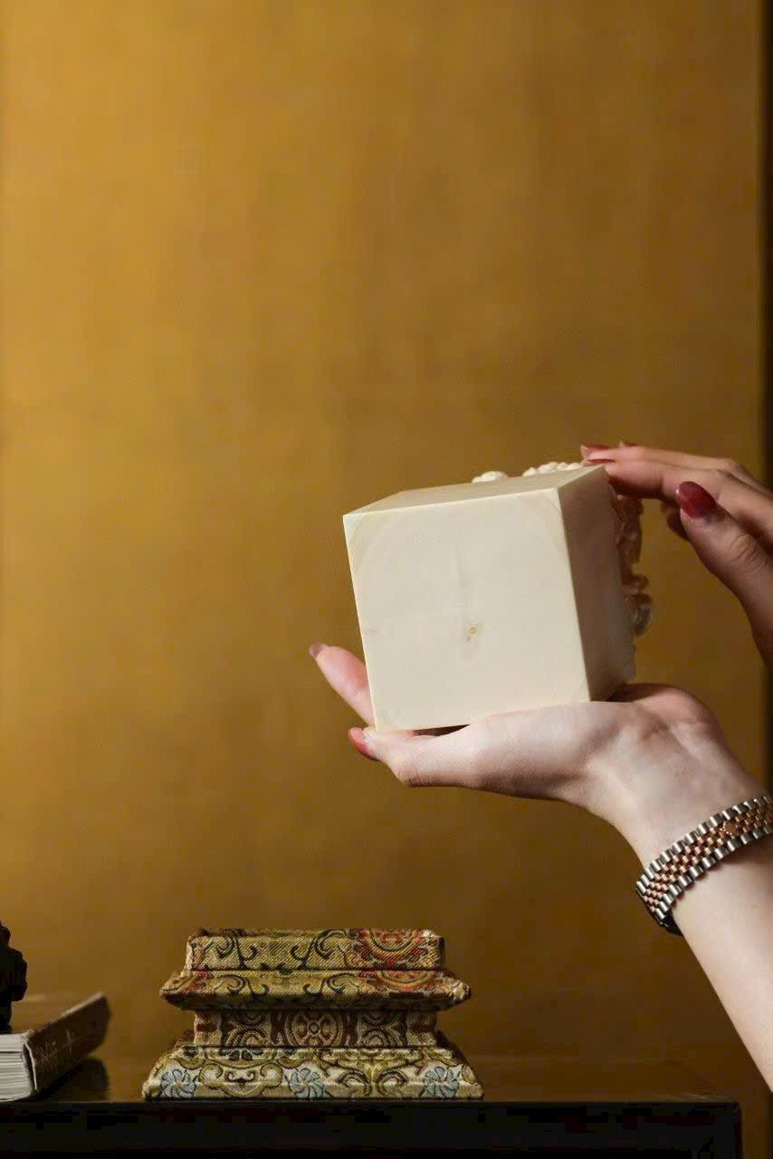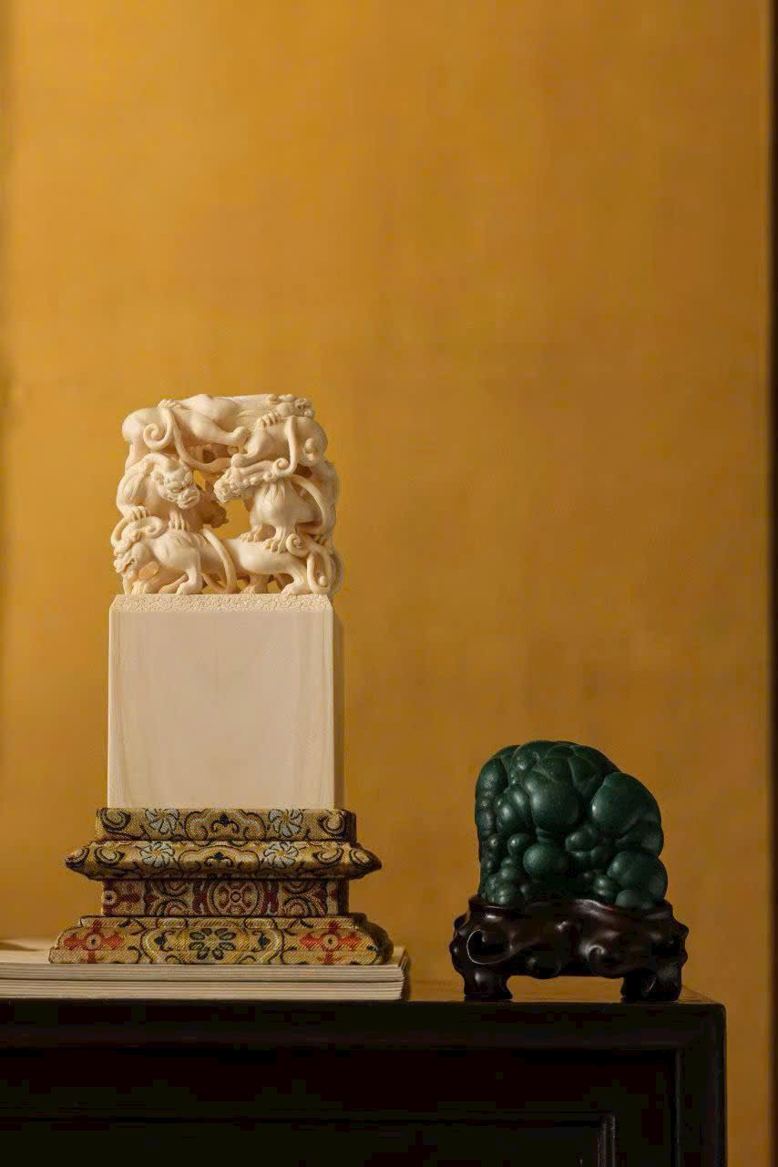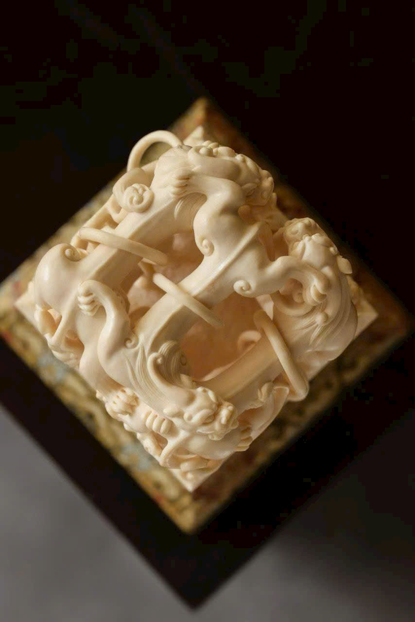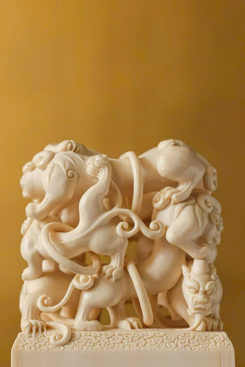 Tác phẩm chế tác từ ng.à ma mút tự nhiên, chất ngà ấm mịn như ngọc, đường vân thanh thoát. Đường dao khắc tinh tế, uyển chuyển và đầy sức sống. Phần chạm nổi long ly uốn lượn, thân hình cuộn xoắn linh hoạt, thần thái oai nghiêm mà sinh động.