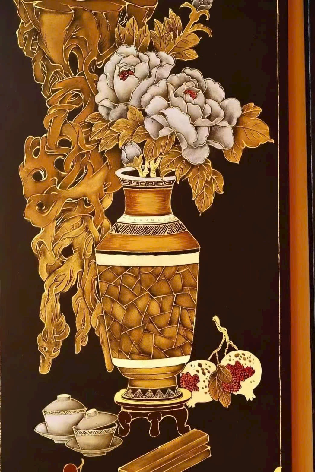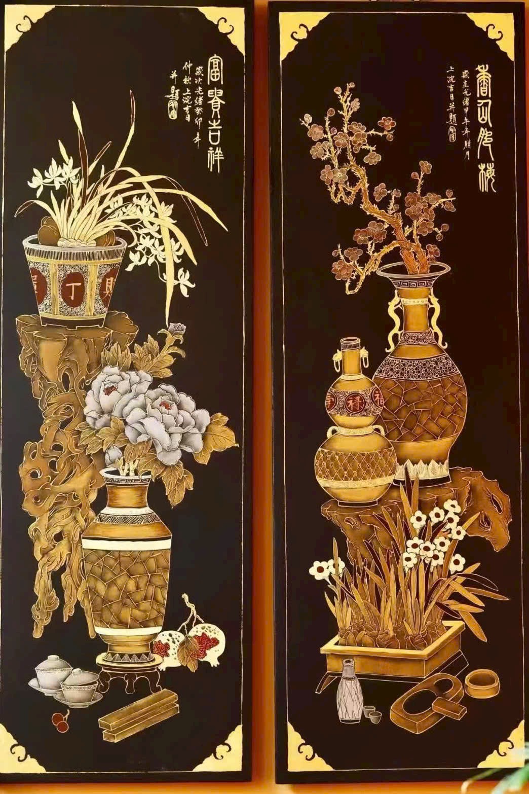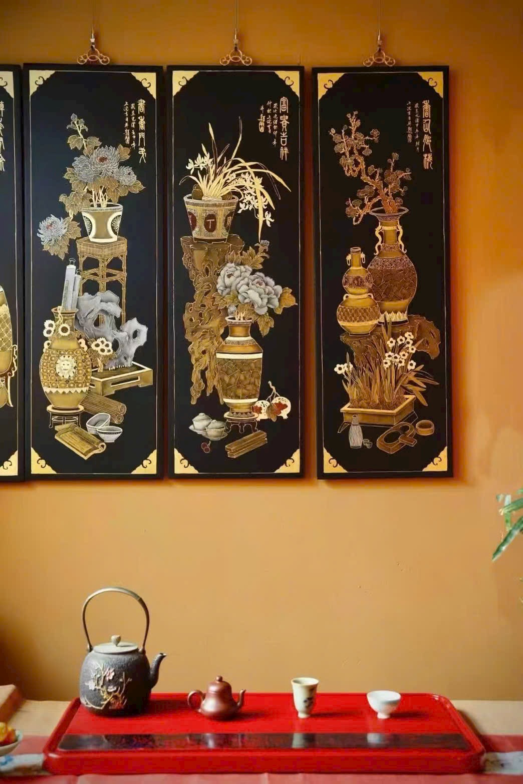 🌿 Lão nam mộc thủ công thếp vàng – 【Bác Cổ Tứ Điều Bình】