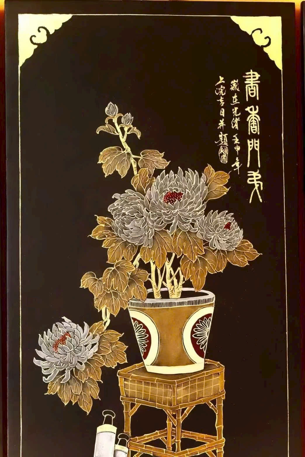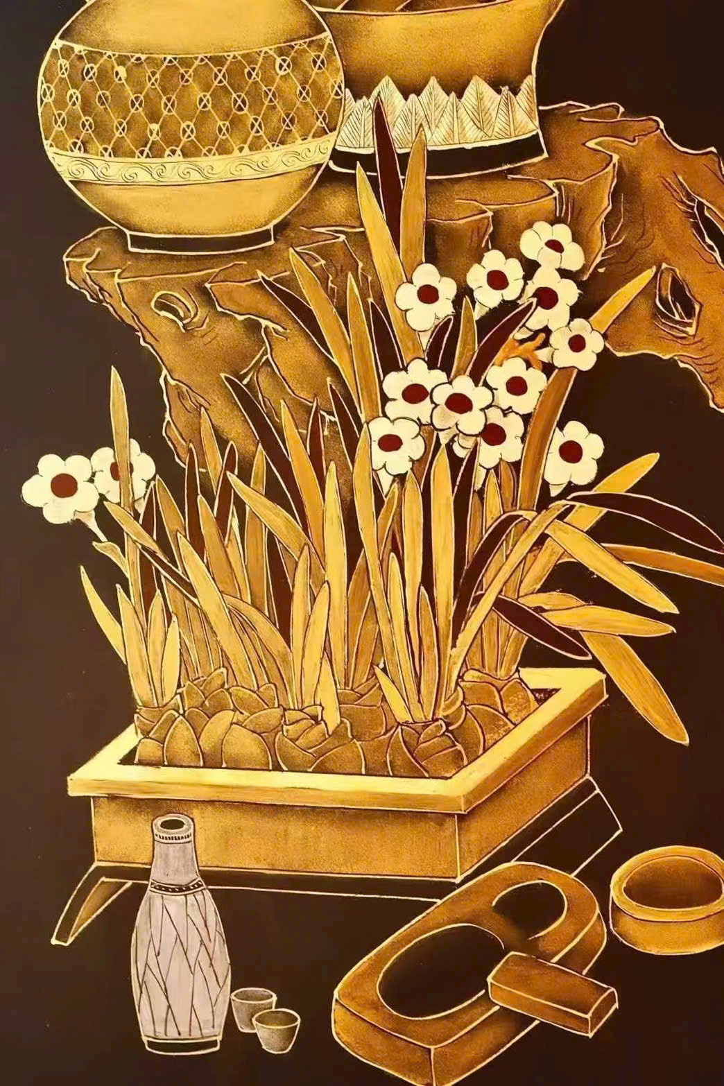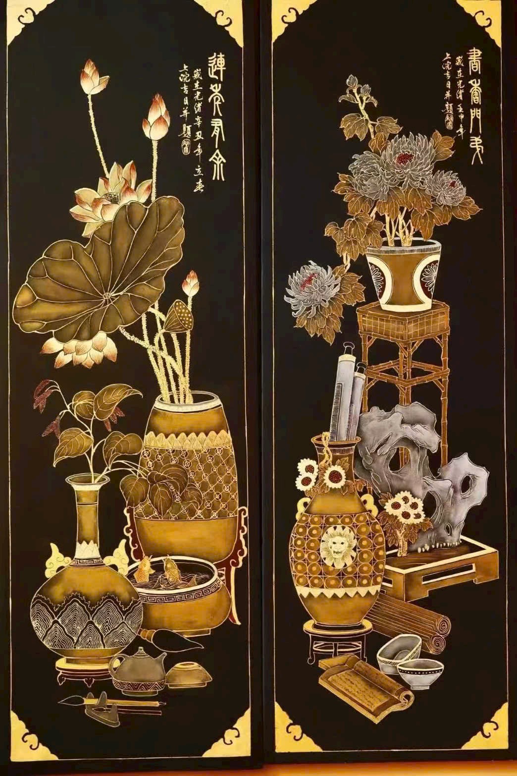 🌿 Lão nam mộc thủ công thếp vàng – 【Bác Cổ Tứ Điều Bình】