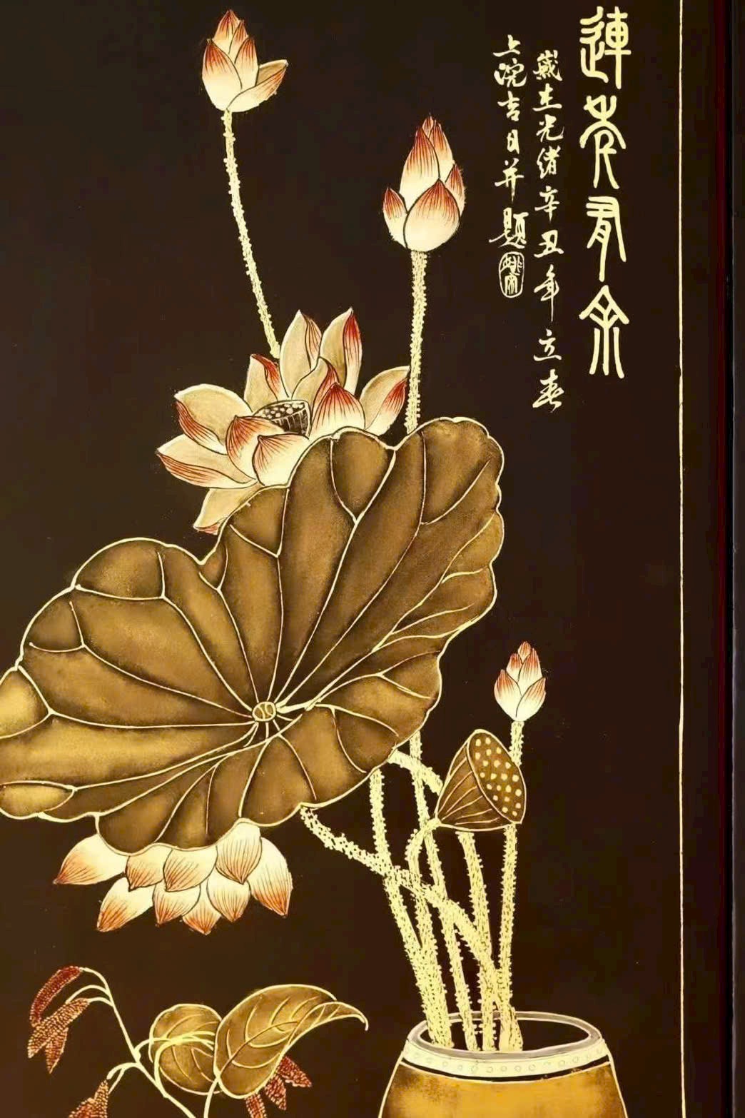 Kỹ thuật: Thuần thủ công miêu kim (vẽ & thếp vàng thủ công)