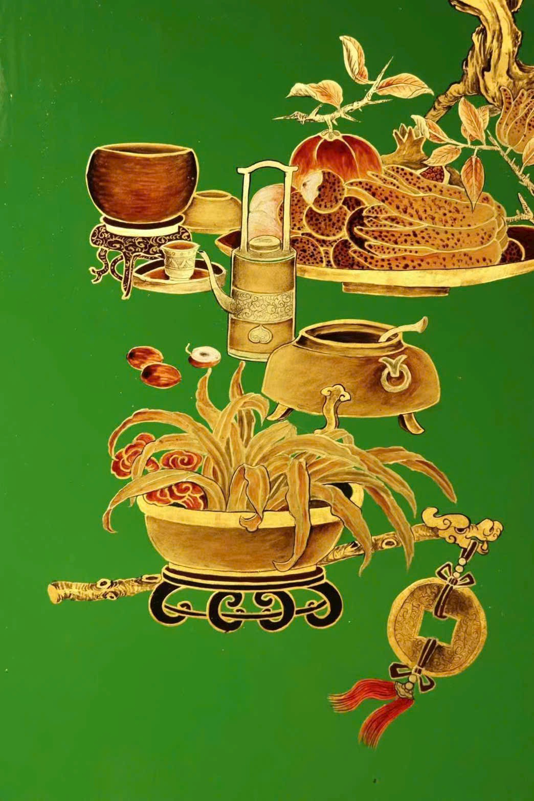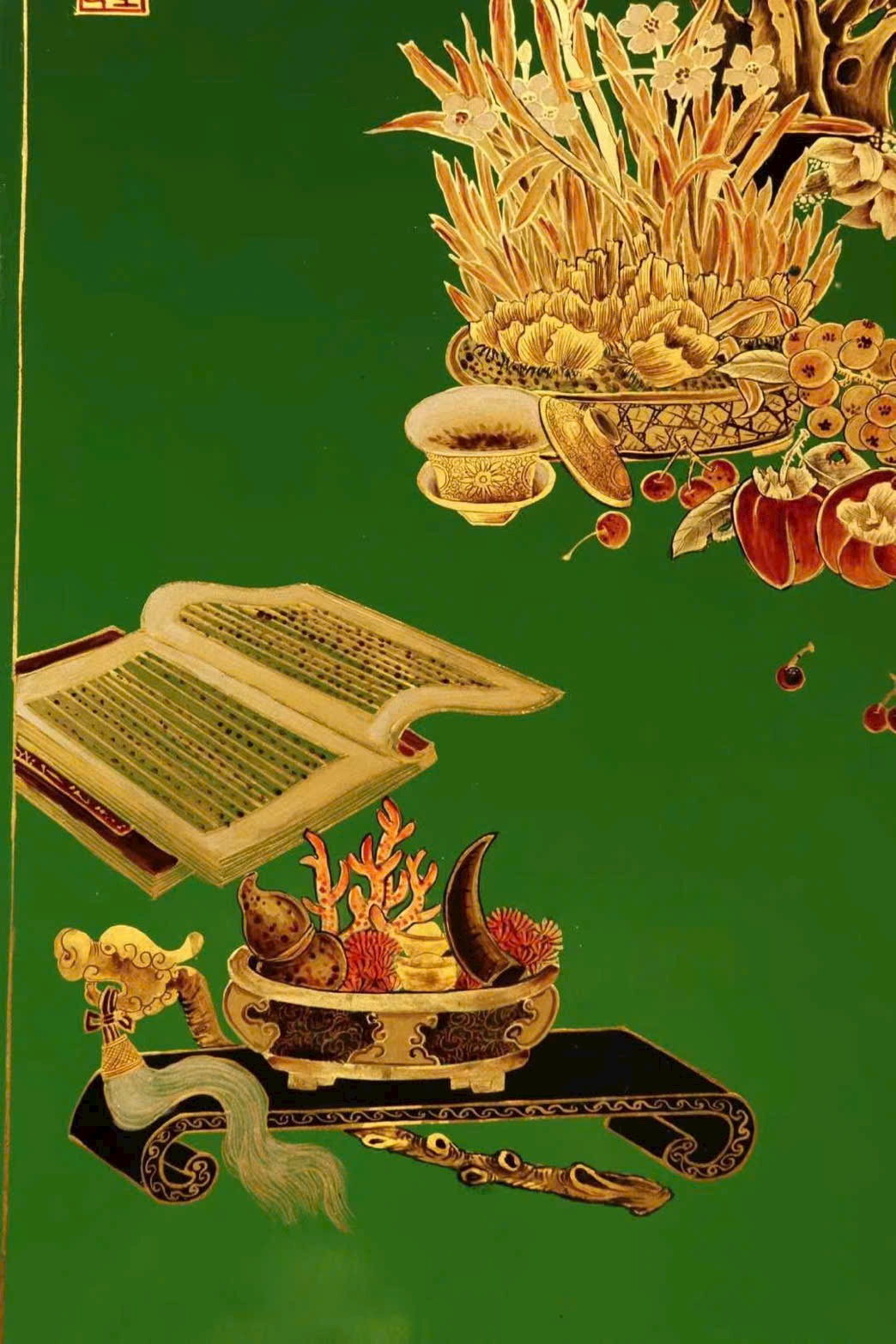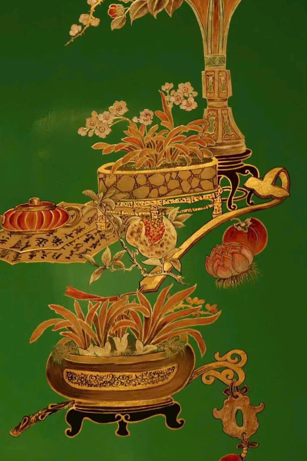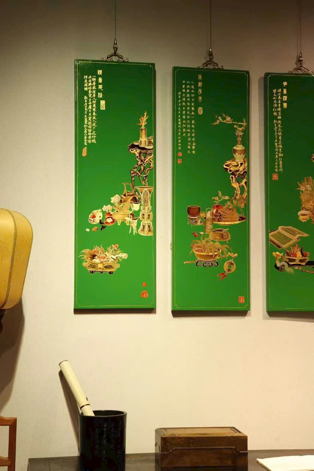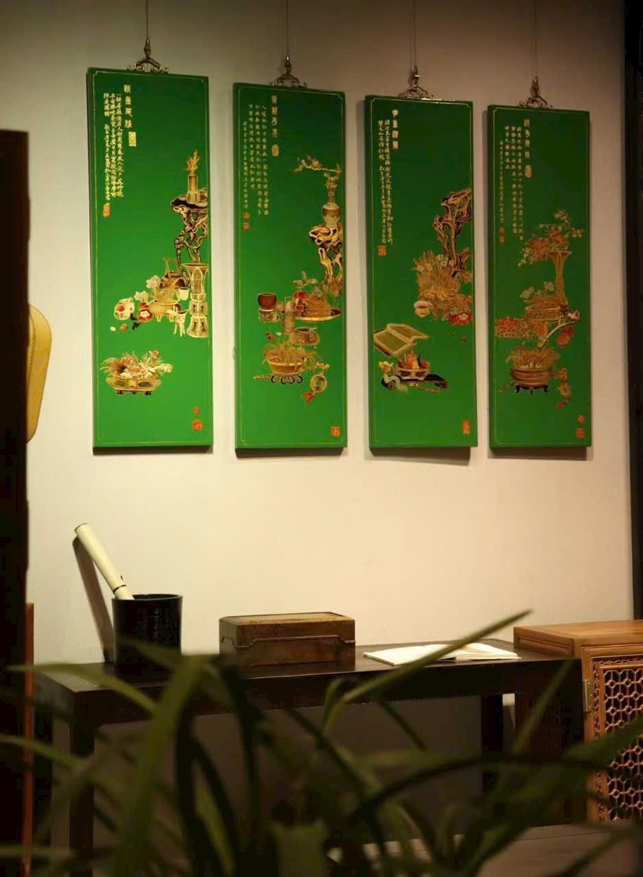 Bộ bốn bình phong thuần thủ công vẽ thếp vàng, thưởng lãm thanh nhã suốt bốn mùa. Đồ án Bác cổ với các cổ vật xưa gợi u hoài hoài cổ, gửi gắm kỳ vọng và lời chúc phúc từ xưa đến nay, mang ý nghĩa cát tường – bình an – như ý.