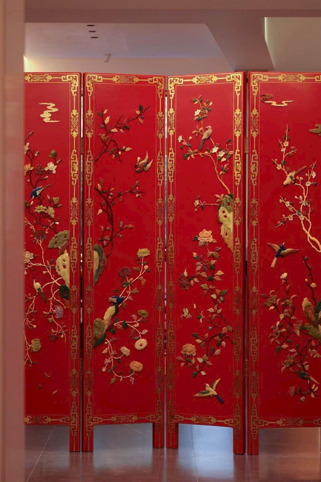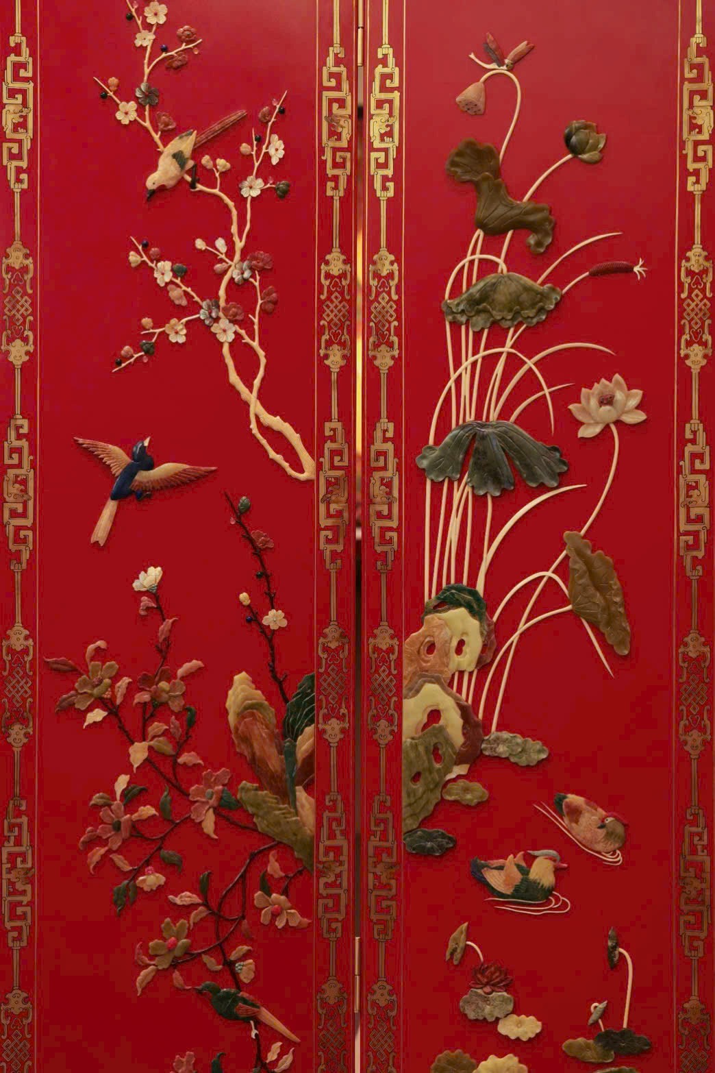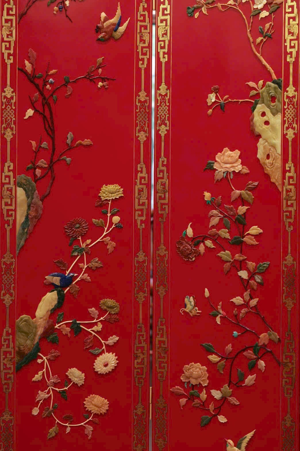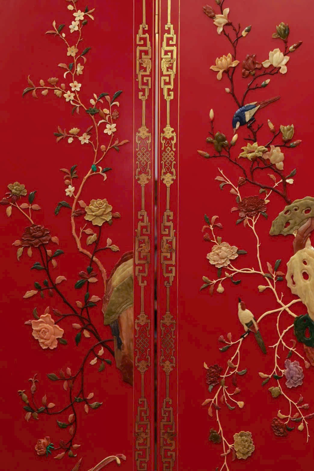Hoa điểu uyển chuyển linh động, phảng phất tiên khí lượn quanh. Trung tâm bình phong nền đỏ son rực rỡ, dùng bách bảo kết thành tranh: ngọc thạch làm hoa, chim hoa sống động như đang nô đùa trên cành.