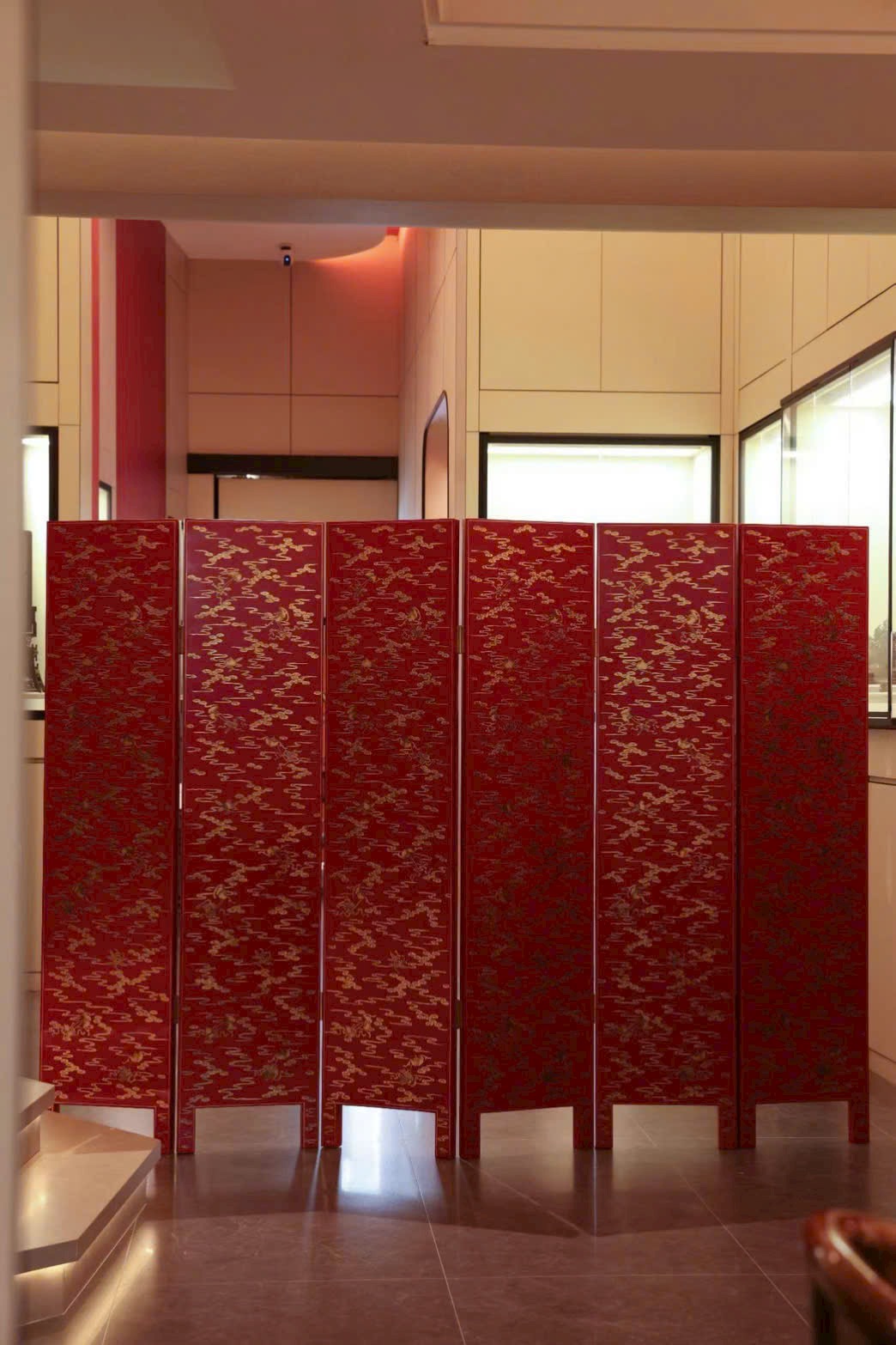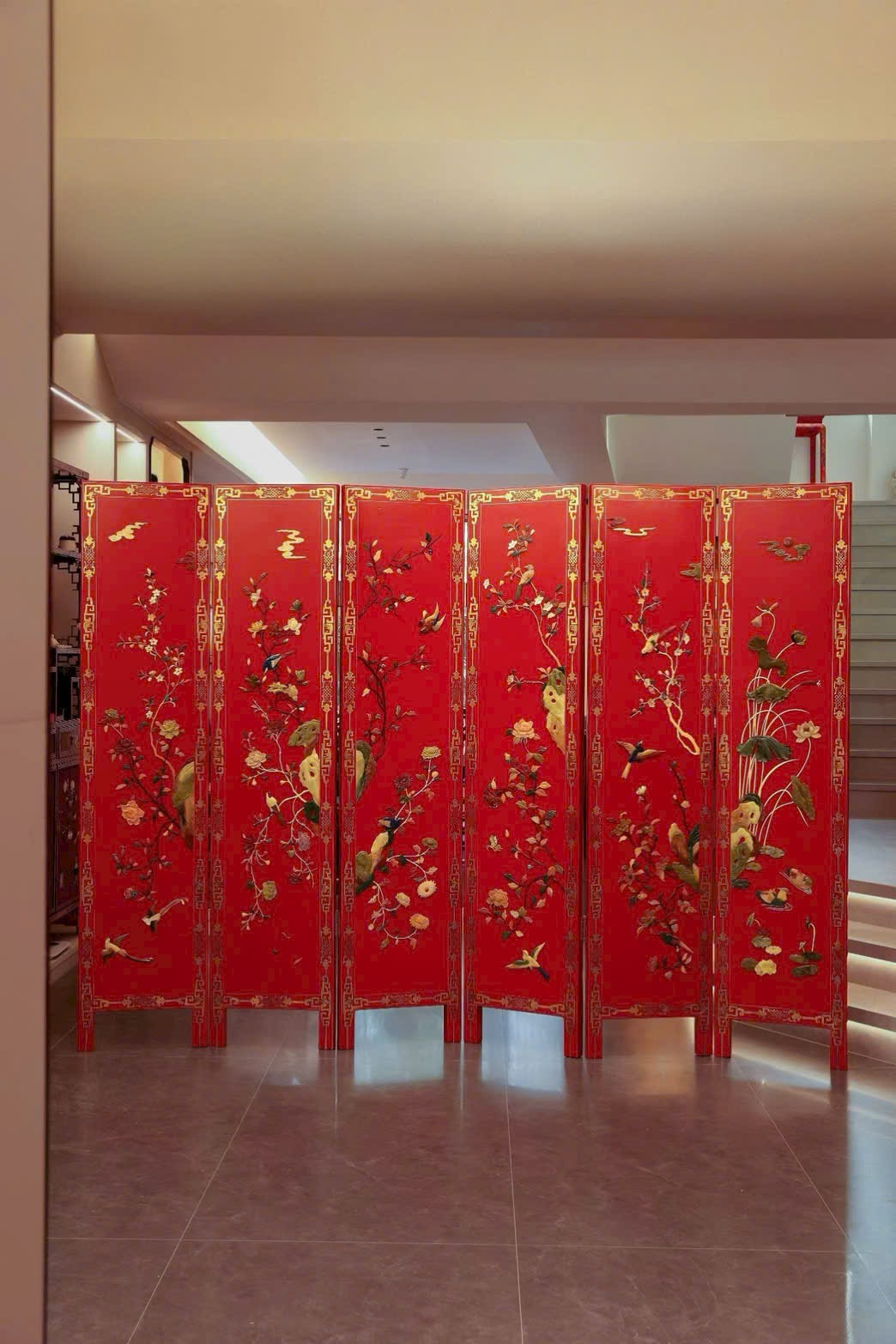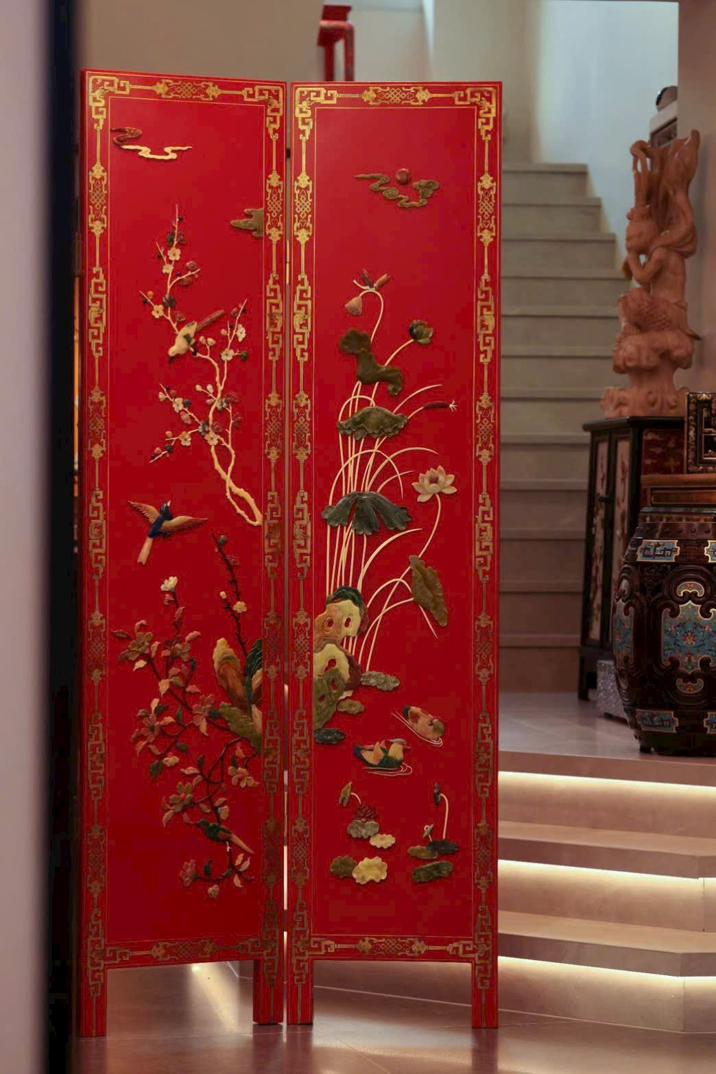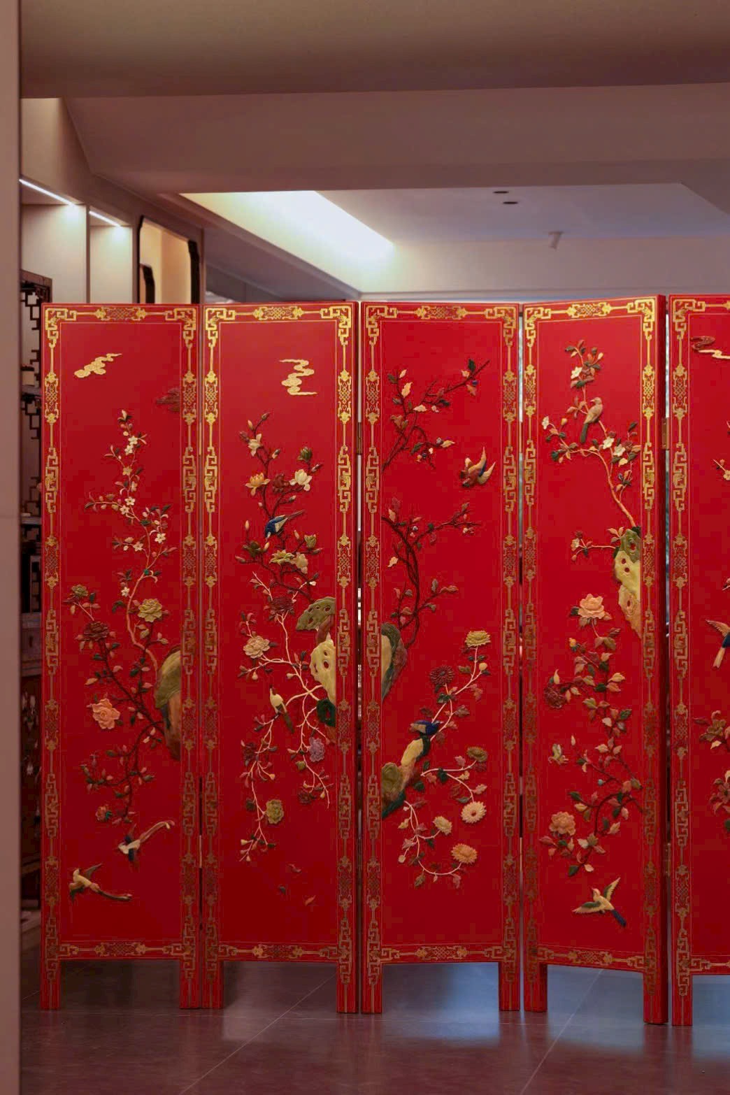 Hoa điểu uyển chuyển linh động, phảng phất tiên khí lượn quanh. Trung tâm bình phong nền đỏ son rực rỡ, dùng bách bảo kết thành tranh: ngọc thạch làm hoa, chim hoa sống động như đang nô đùa trên cành.