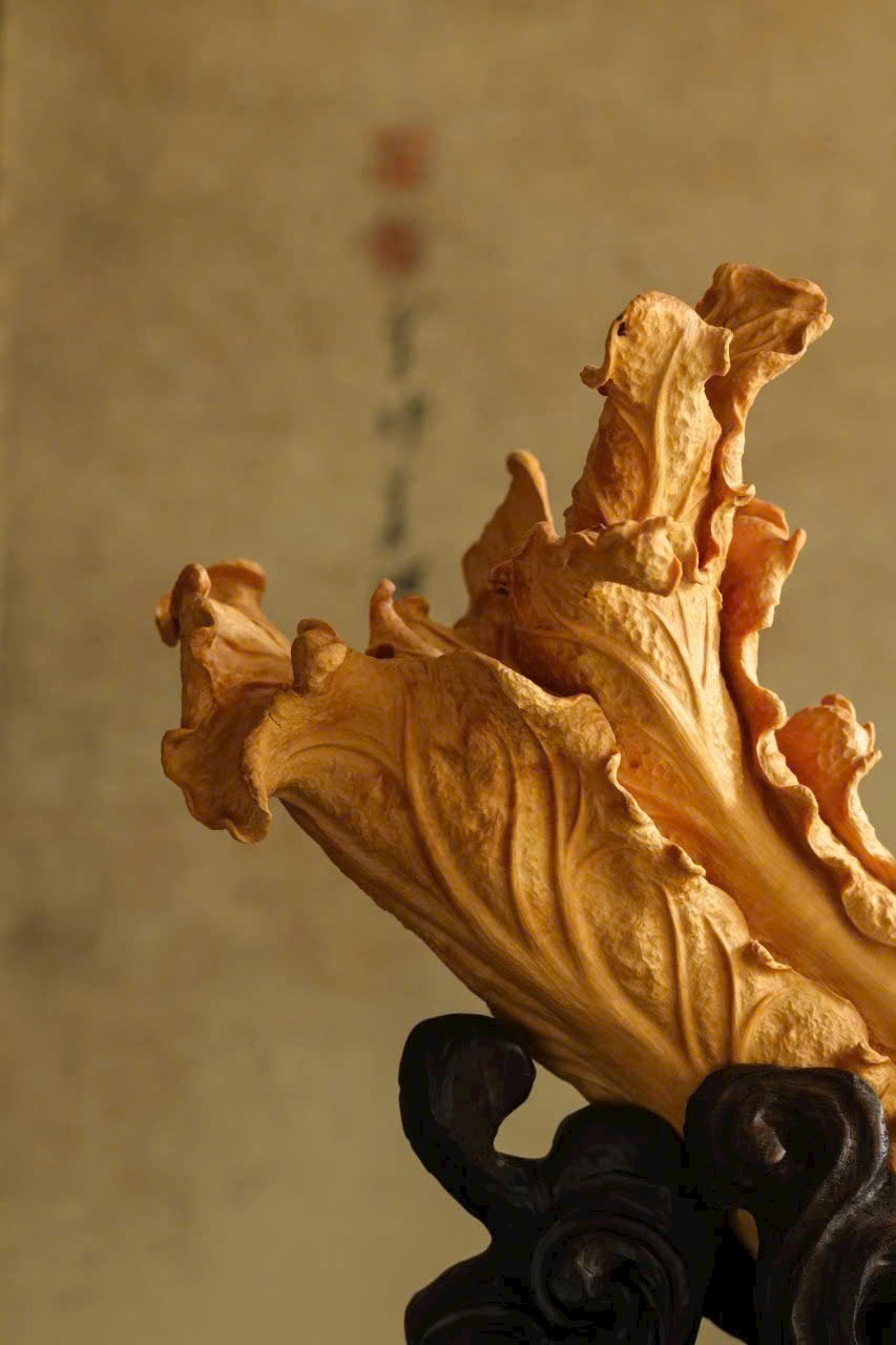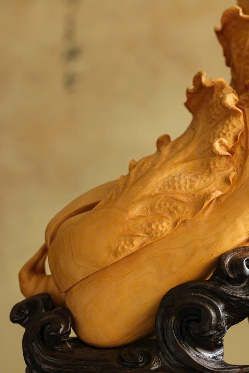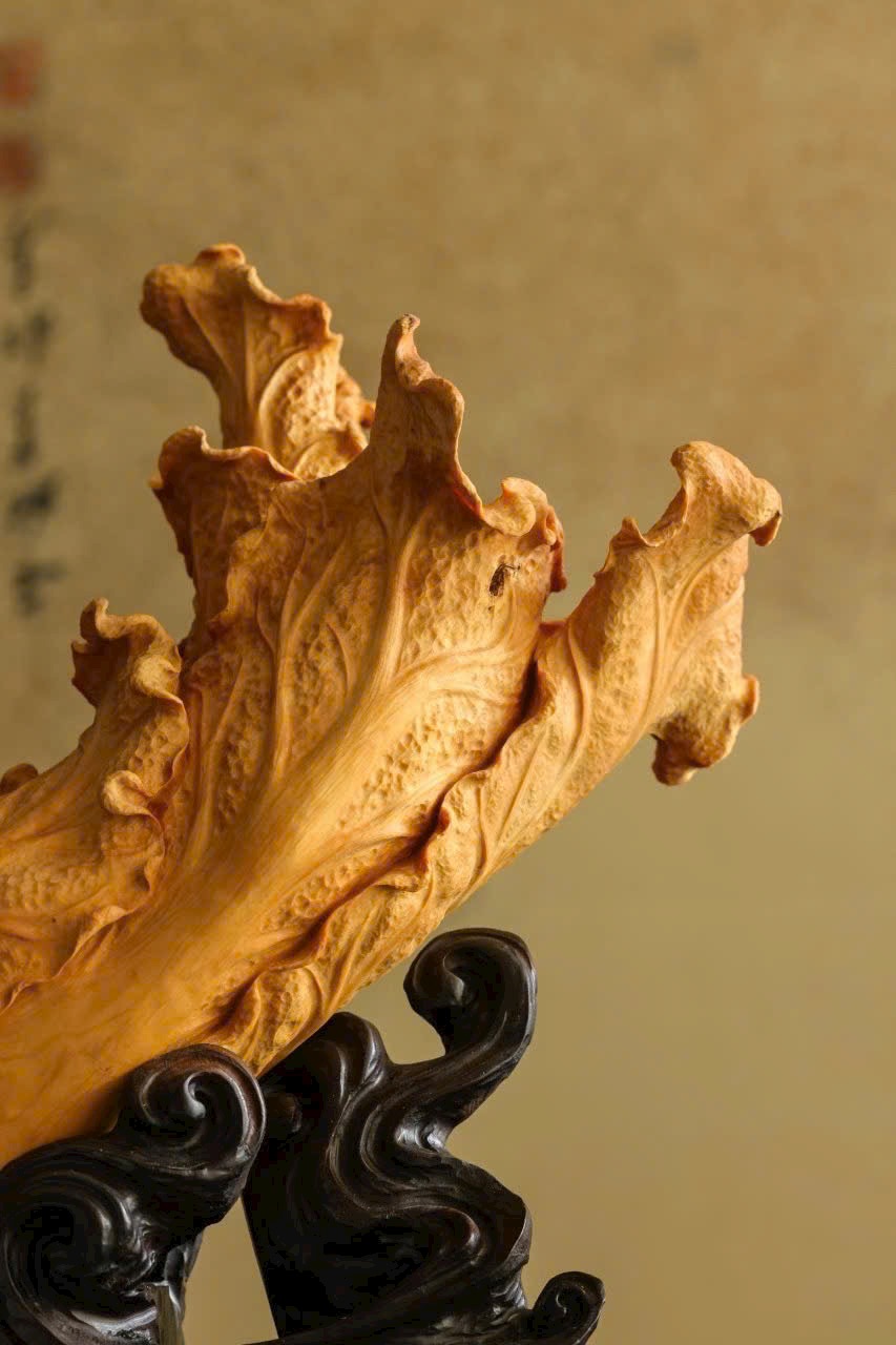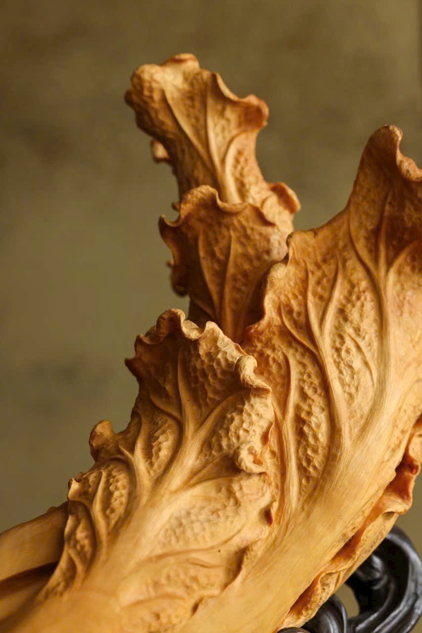 Chất gỗ sạch, sắc vàng óng như kim, chạm khắc tinh xảo và chân thực. Kết cấu lá cải rõ nét, từng phiến uốn lượn tự nhiên, dáng vẻ đầy đặn, biểu tượng cho phú quý dồi dào. Tràn đầy sức sống thanh tao, thích hợp bày nơi thư án, gửi gắm lời chúc “bách tài lâm môn”.