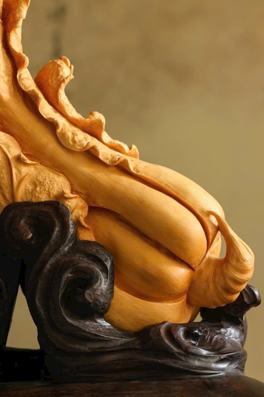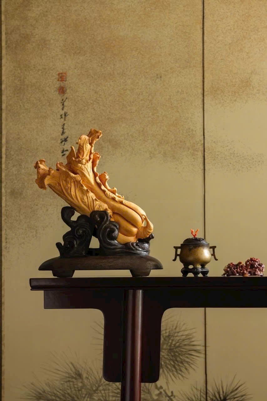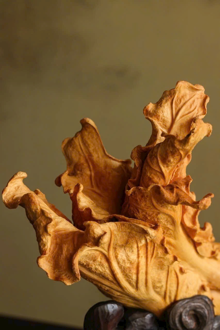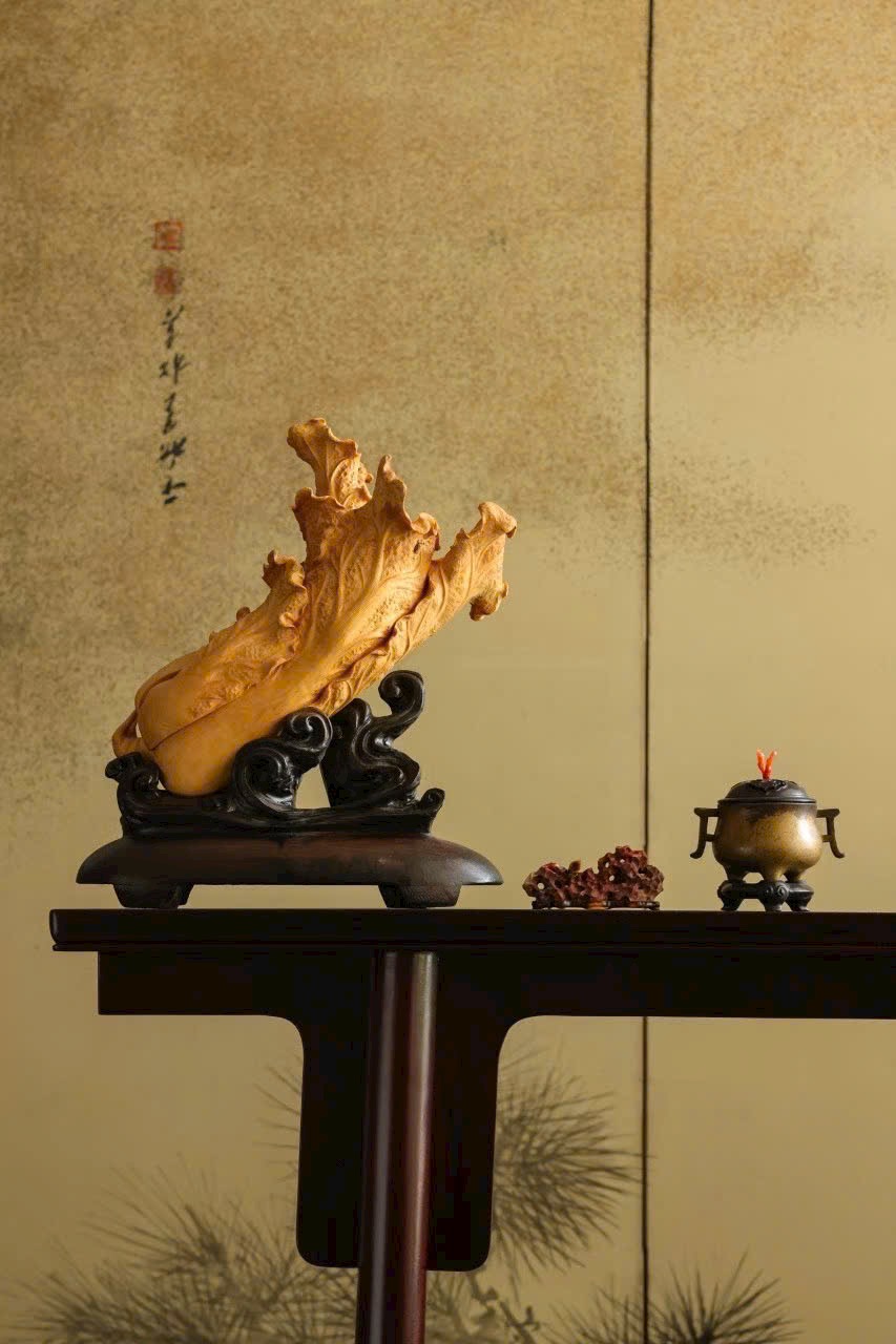 Chất gỗ sạch, sắc vàng óng như kim, chạm khắc tinh xảo và chân thực. Kết cấu lá cải rõ nét, từng phiến uốn lượn tự nhiên, dáng vẻ đầy đặn, biểu tượng cho phú quý dồi dào. Tràn đầy sức sống thanh tao, thích hợp bày nơi thư án, gửi gắm lời chúc “bách tài lâm môn”.