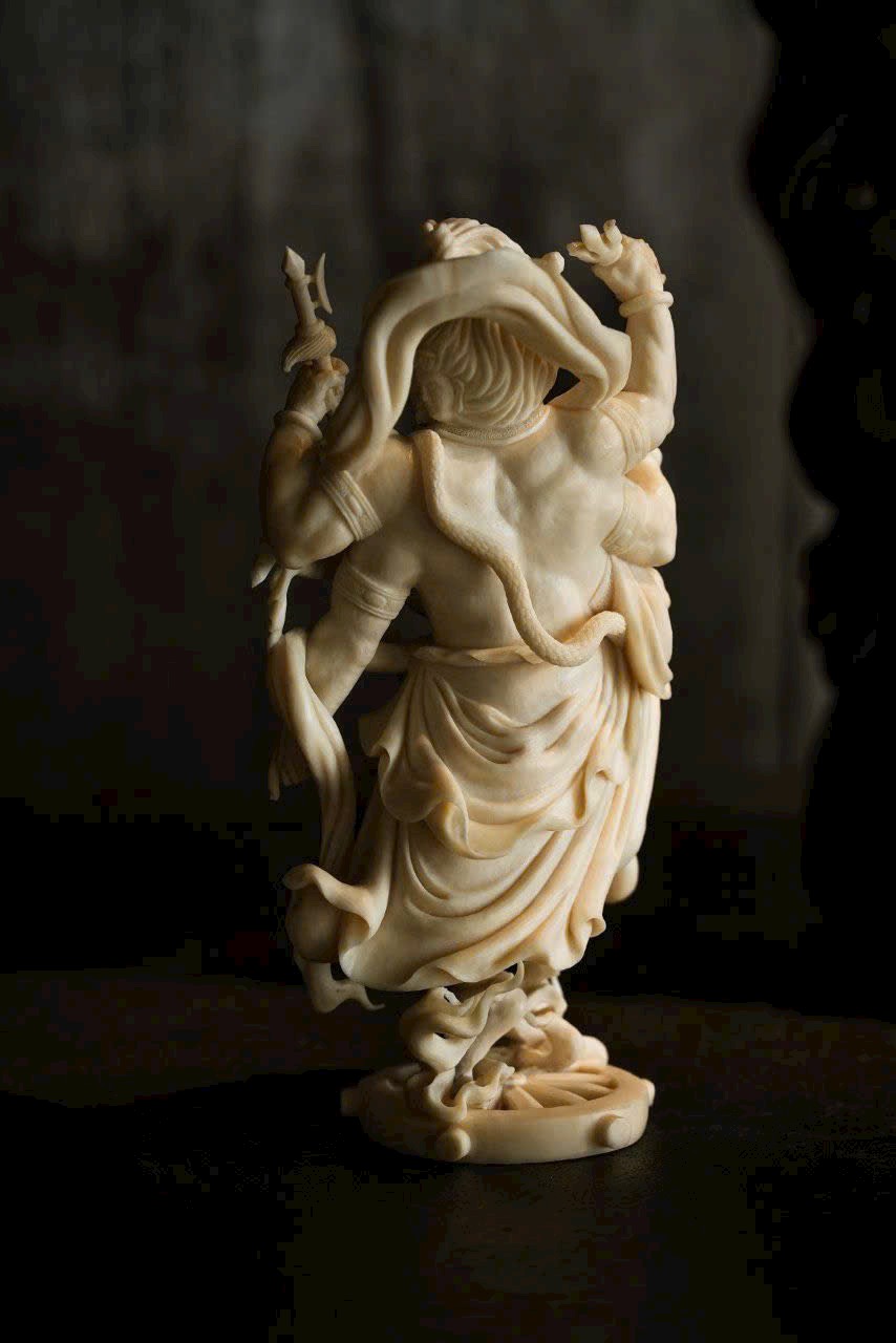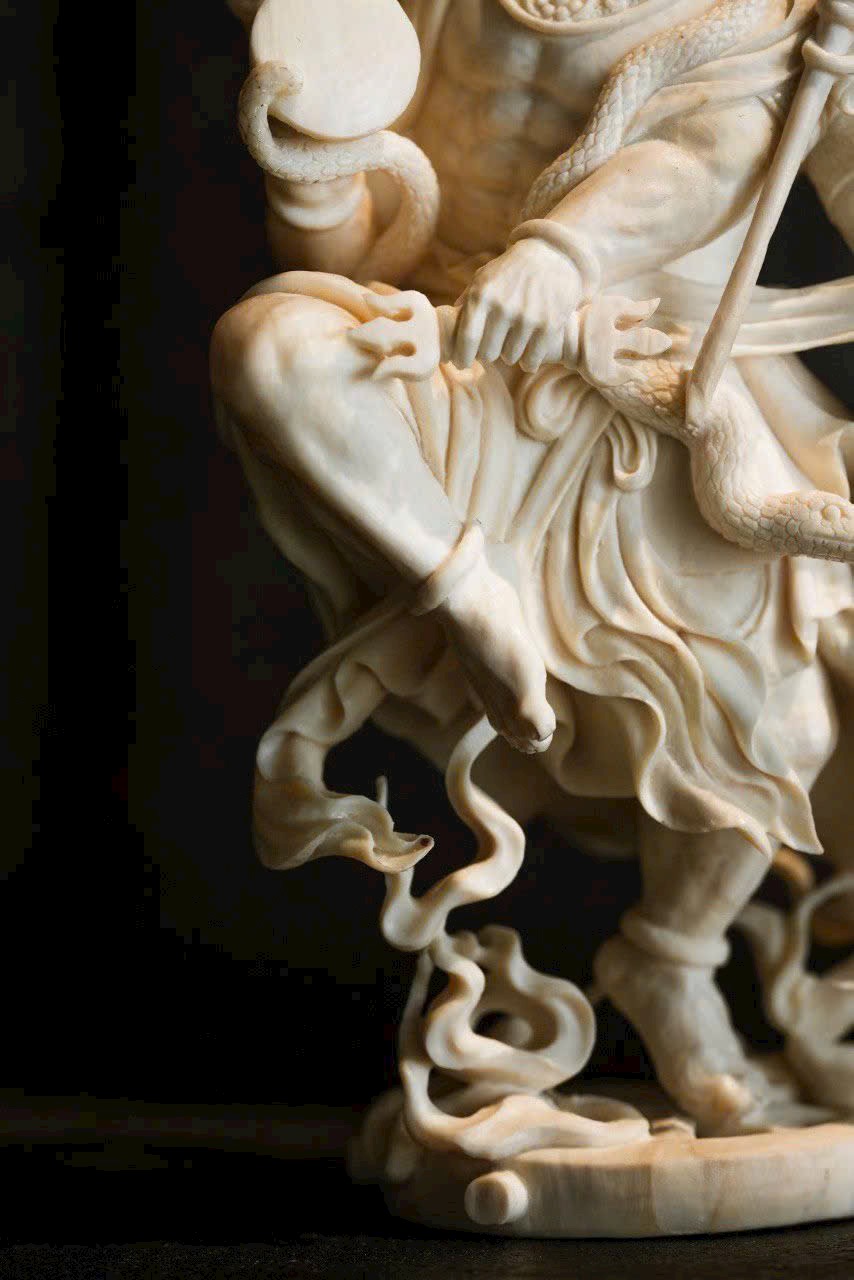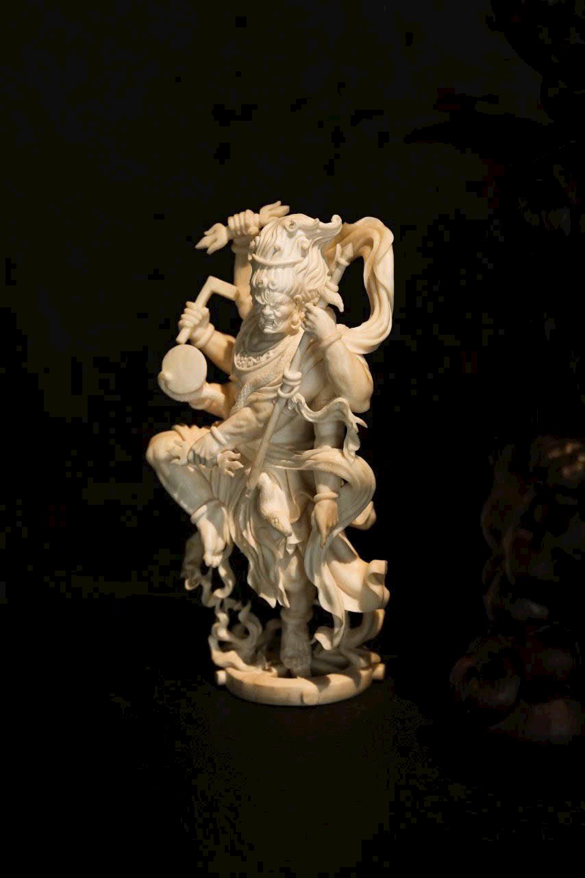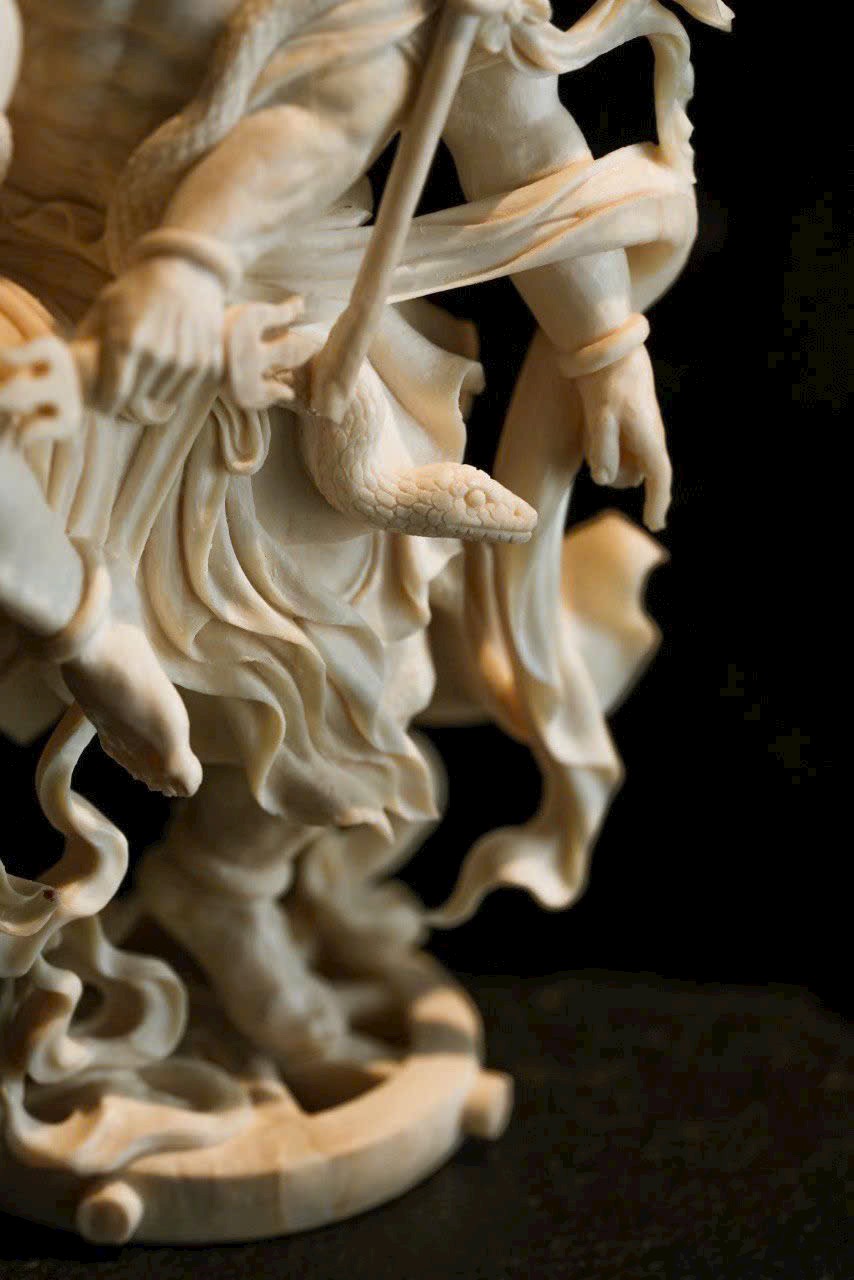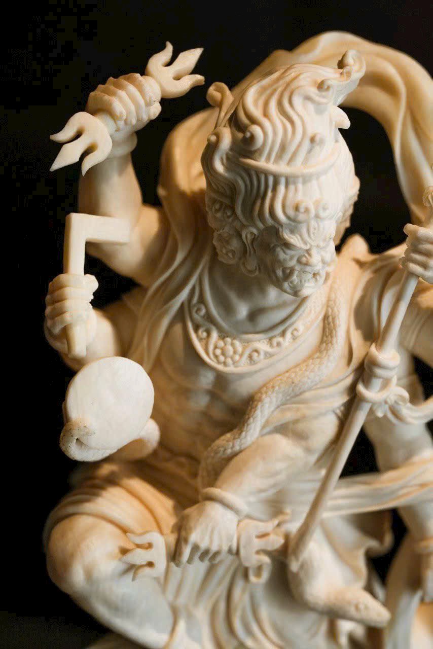 Tay cầm pháp khí Kim Cang, dáng ngồi vững chãi, toàn thân toát ra khí thế uy nghi, bất khả xâm phạm. Các chi tiết được khắc họa sắc nét, đường dao dứt khoát mà mạnh mẽ, thể hiện tay nghề điêu khắc thuần thục và tinh thần hộ pháp kiên định.