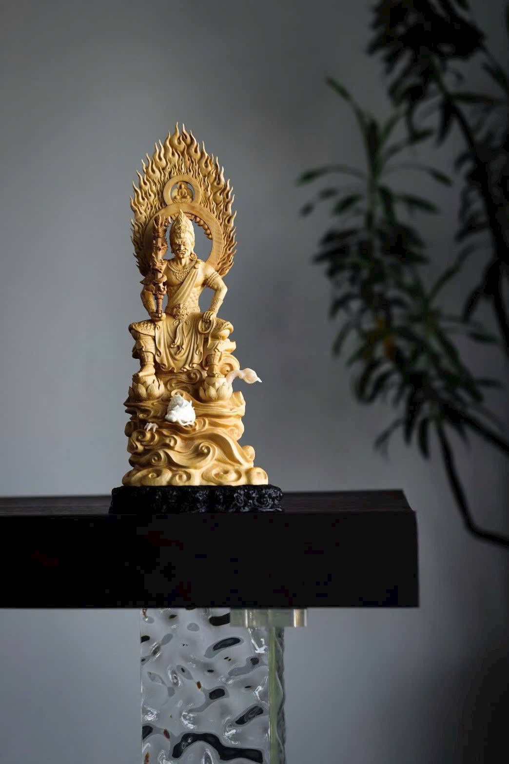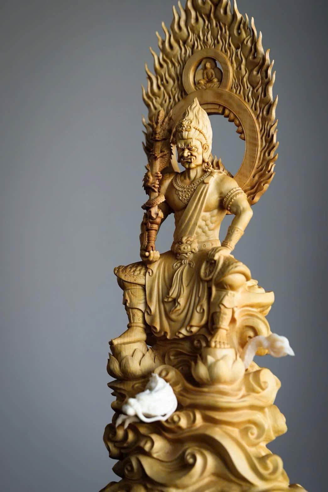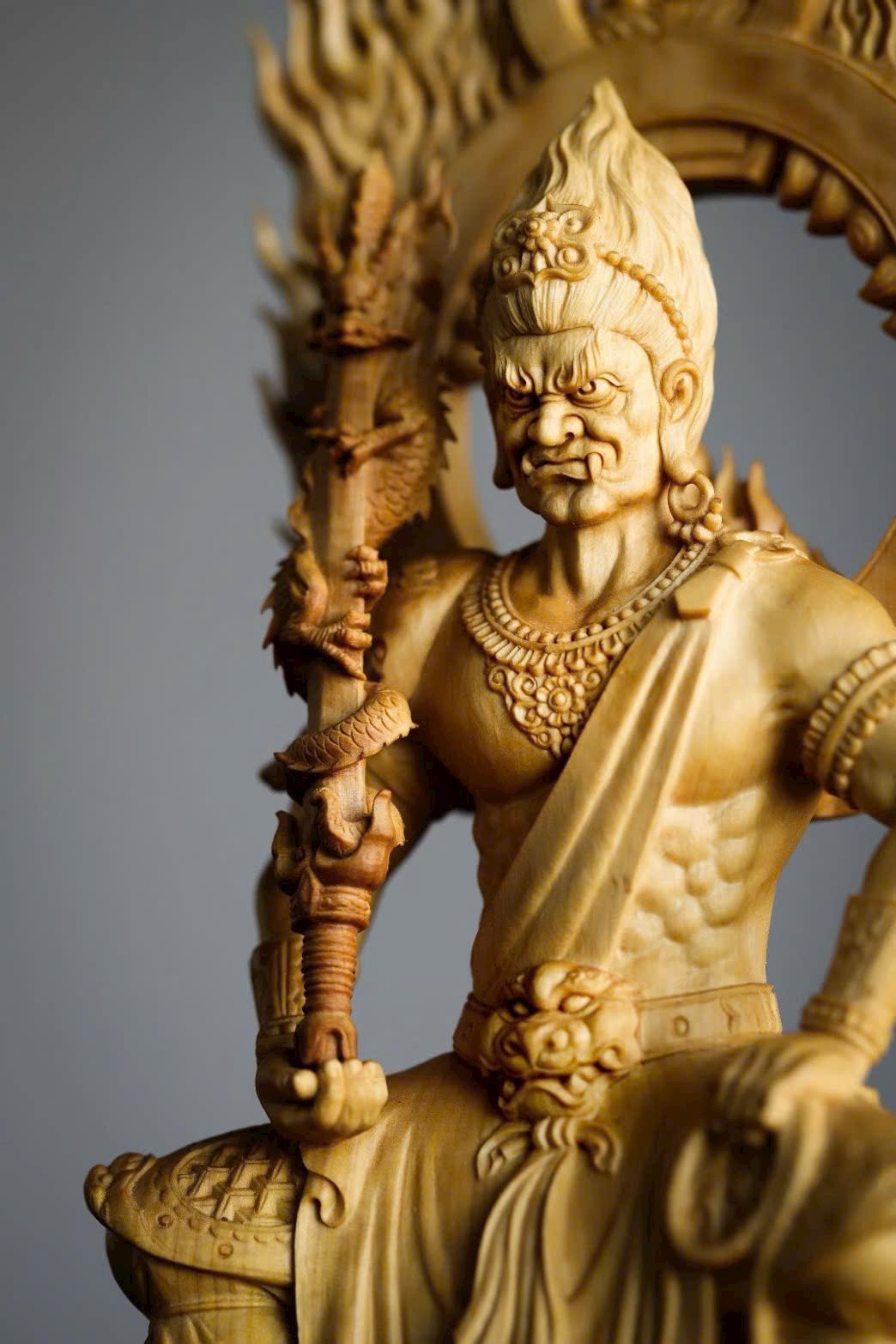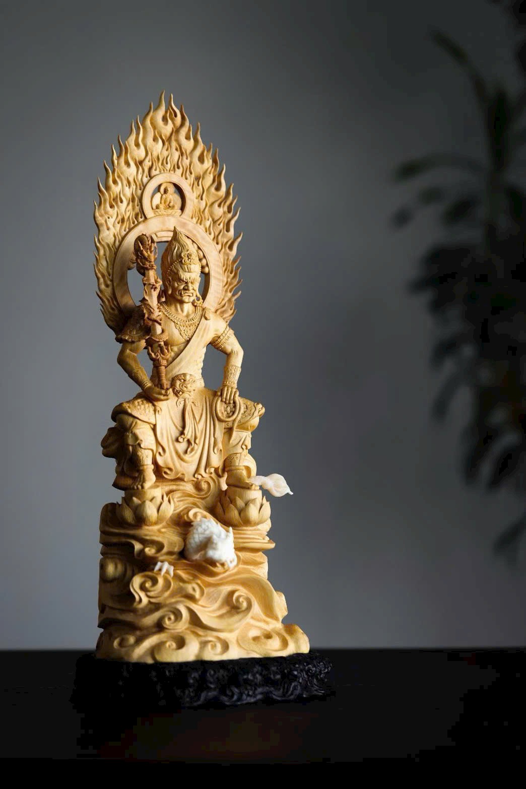 Màu gỗ vàng trong như hồ thu tĩnh lặng, Minh Vương giận mắt uy nghi, trấn giữ tam giới. Tay nâng kiếm và chùy hướng trời, hàng phục ma chướng; tóc bốc lửa cuộn mây, lộ rõ đường đao tinh tế. Thớ gỗ mịn màng ánh lên sắc u huyền. Khi được an trí nơi án thờ, giữa oai nghi hiển lộ pháp tướng từ bi.