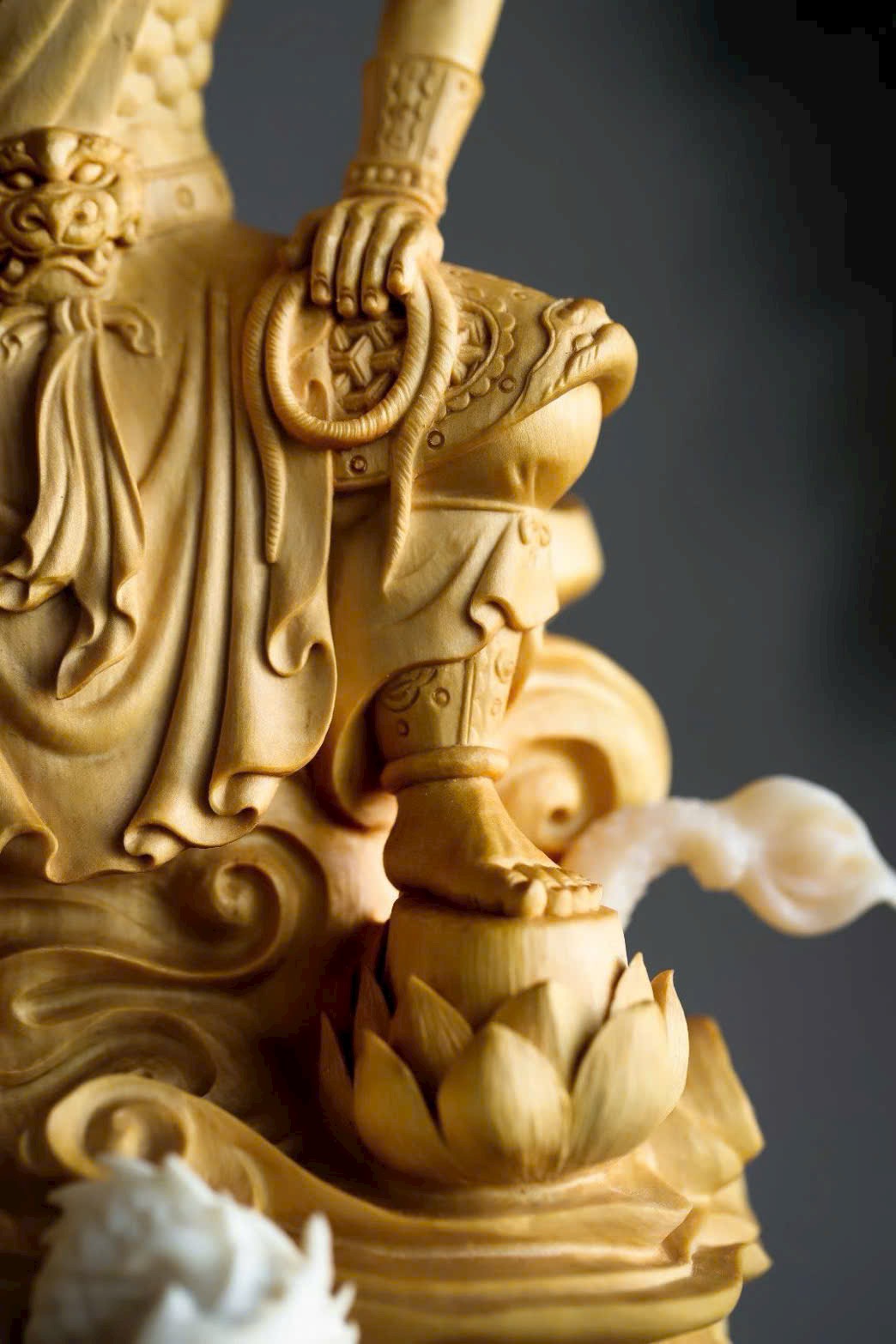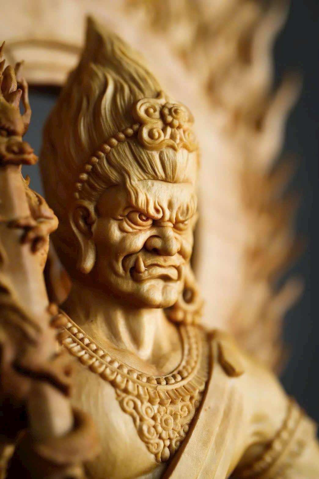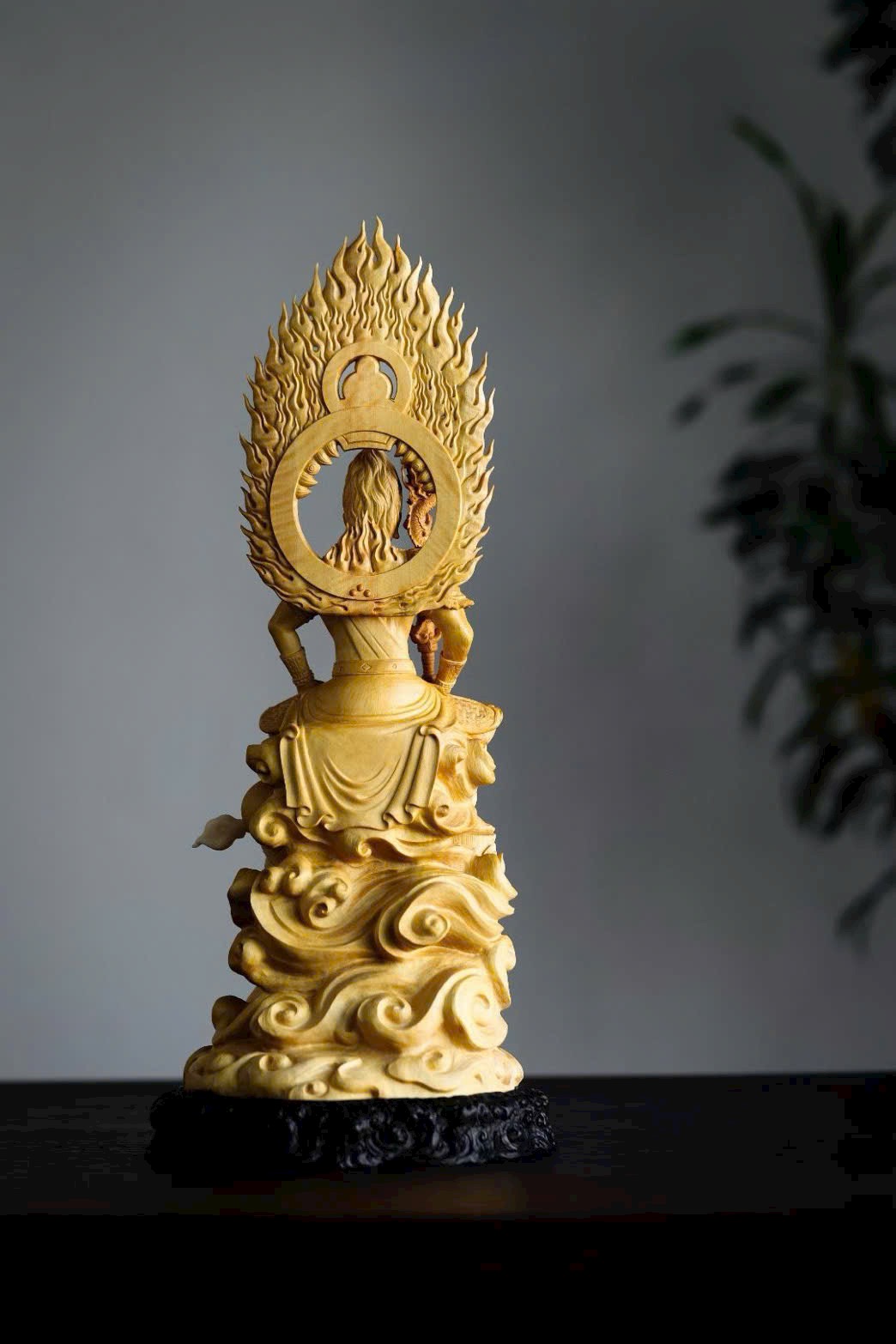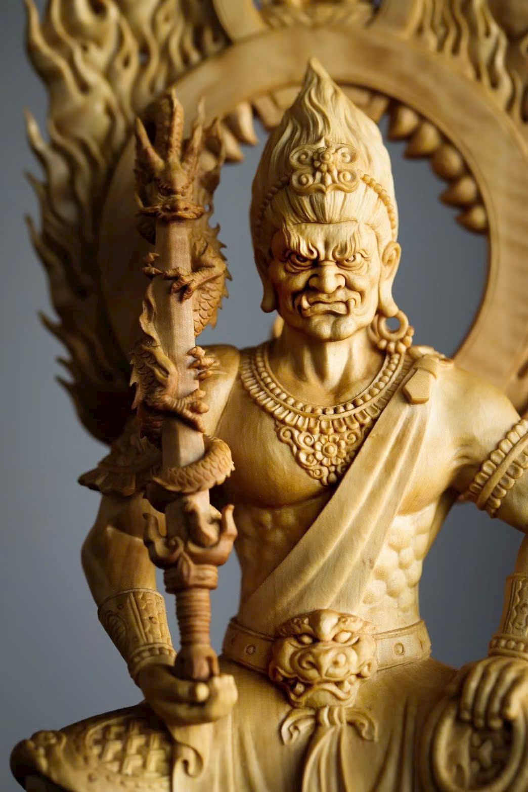 Màu gỗ vàng trong như hồ thu tĩnh lặng, Minh Vương giận mắt uy nghi, trấn giữ tam giới. Tay nâng kiếm và chùy hướng trời, hàng phục ma chướng; tóc bốc lửa cuộn mây, lộ rõ đường đao tinh tế. Thớ gỗ mịn màng ánh lên sắc u huyền. Khi được an trí nơi án thờ, giữa oai nghi hiển lộ pháp tướng từ bi.