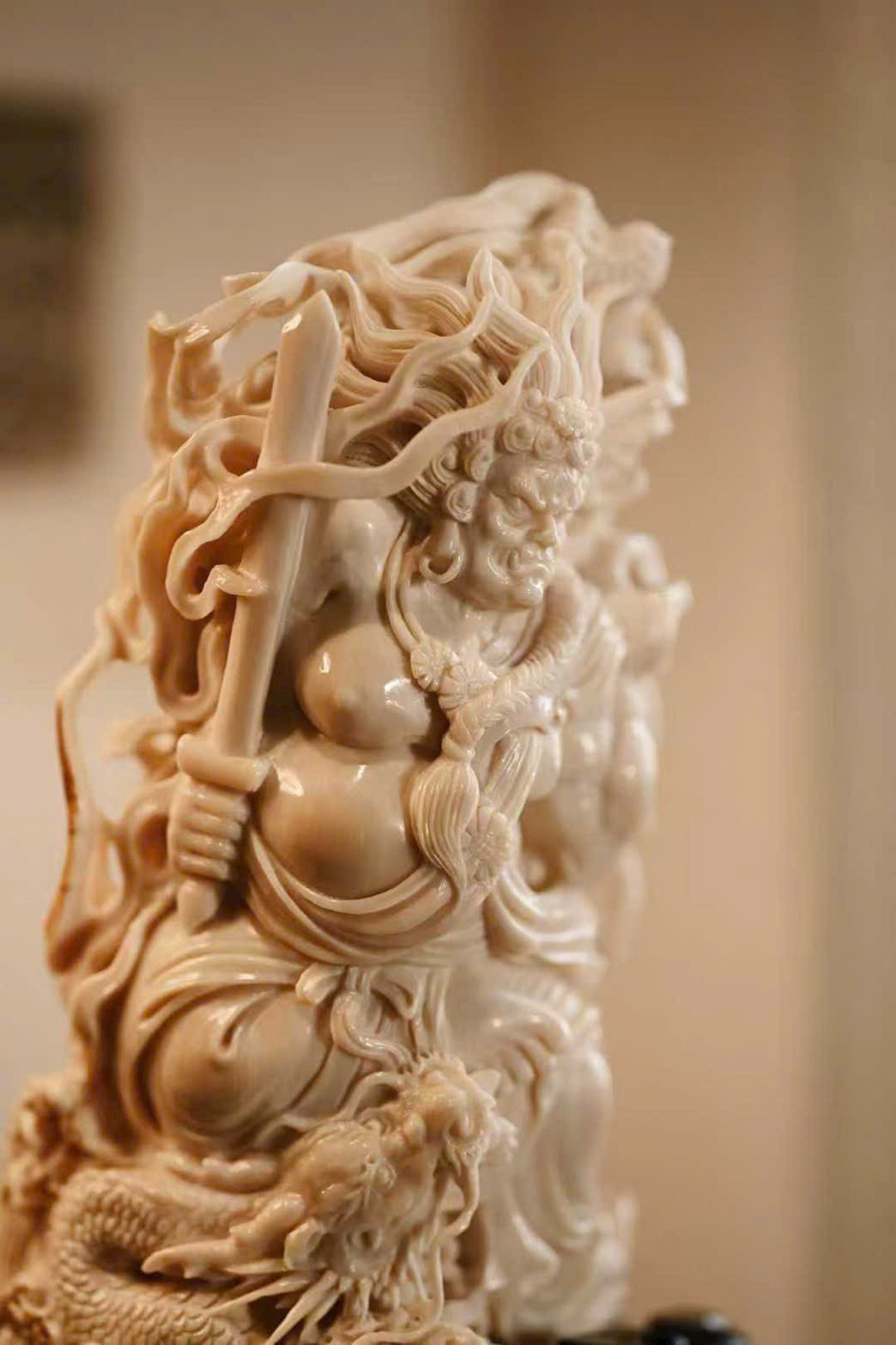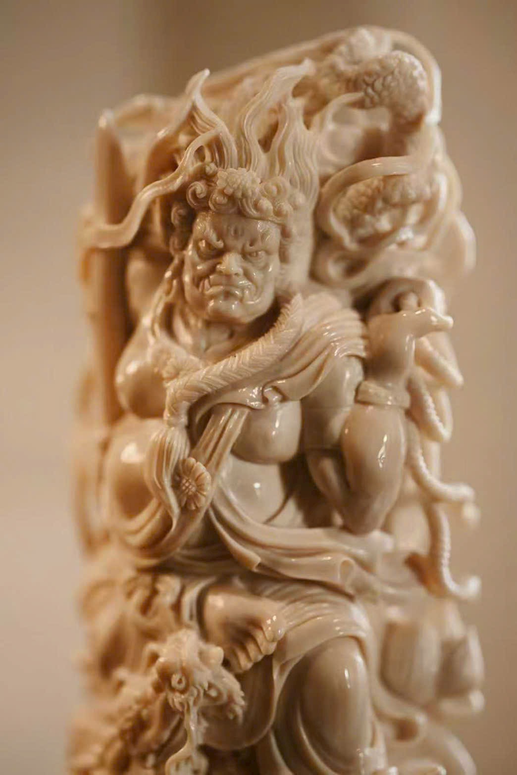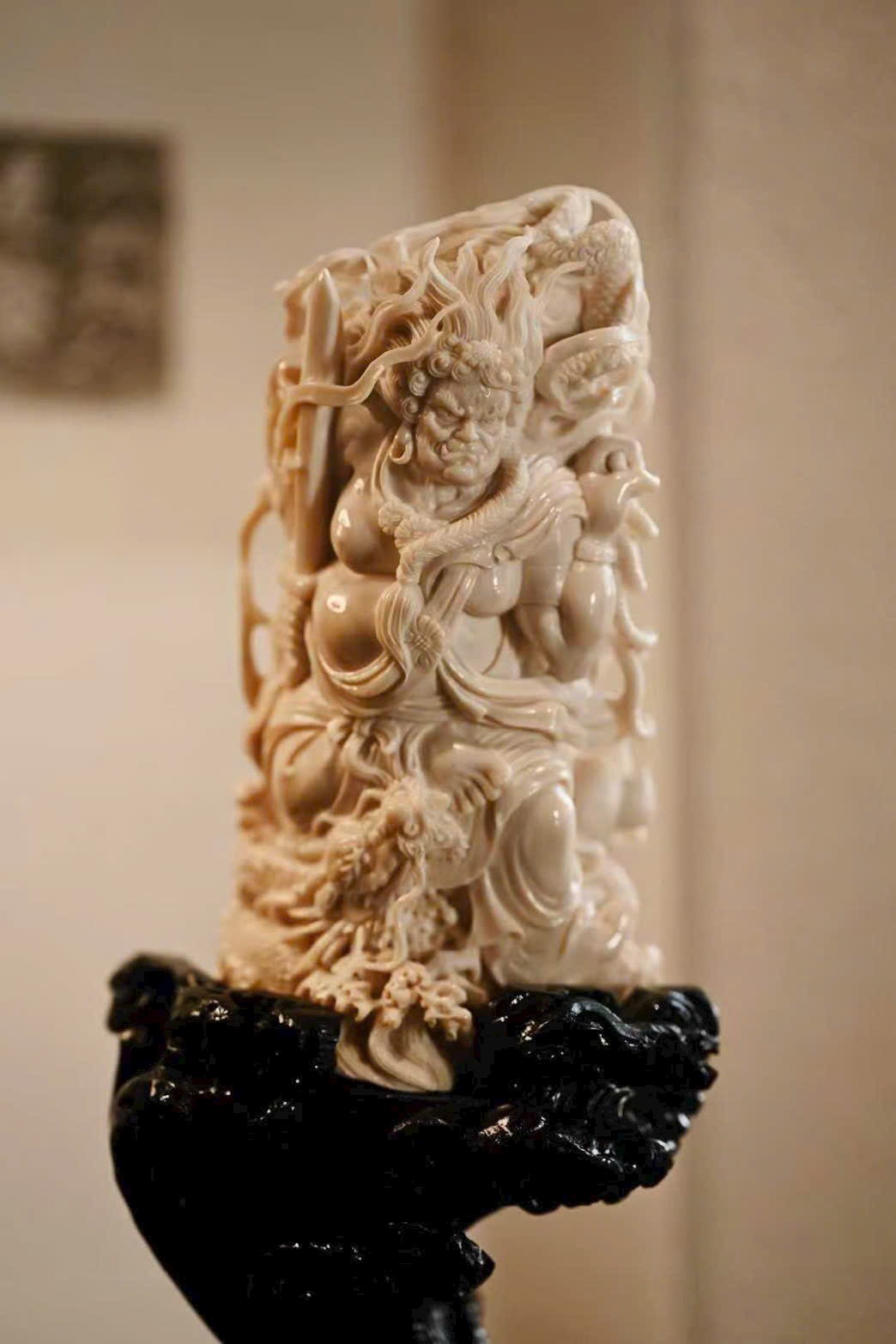 Chất liệu mịn màng, tinh tế; tượng khắc hình Bất Động Minh Vương với mái tóc mây búi cao, răng dưới cắn lên môi trên, biểu hiện tướng phẫn nộ.