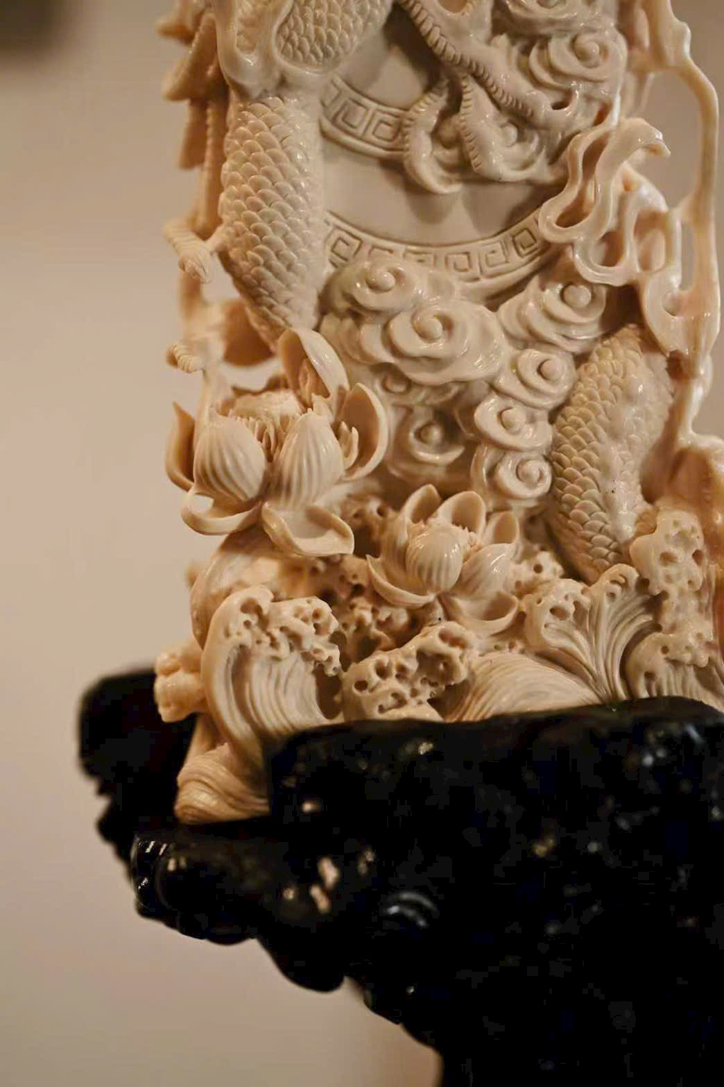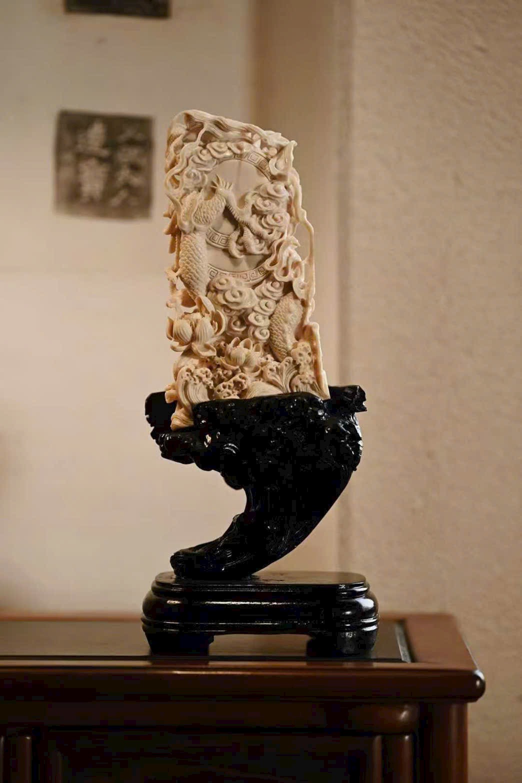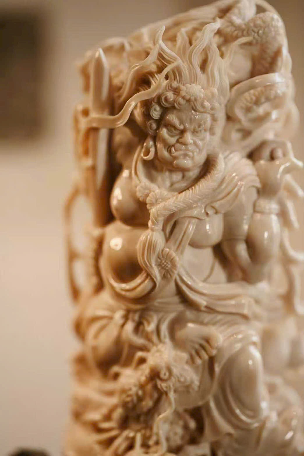 Chất liệu mịn màng, tinh tế; tượng khắc hình Bất Động Minh Vương với mái tóc mây búi cao, răng dưới cắn lên môi trên, biểu hiện tướng phẫn nộ.