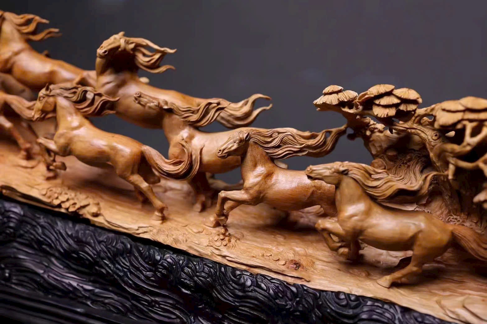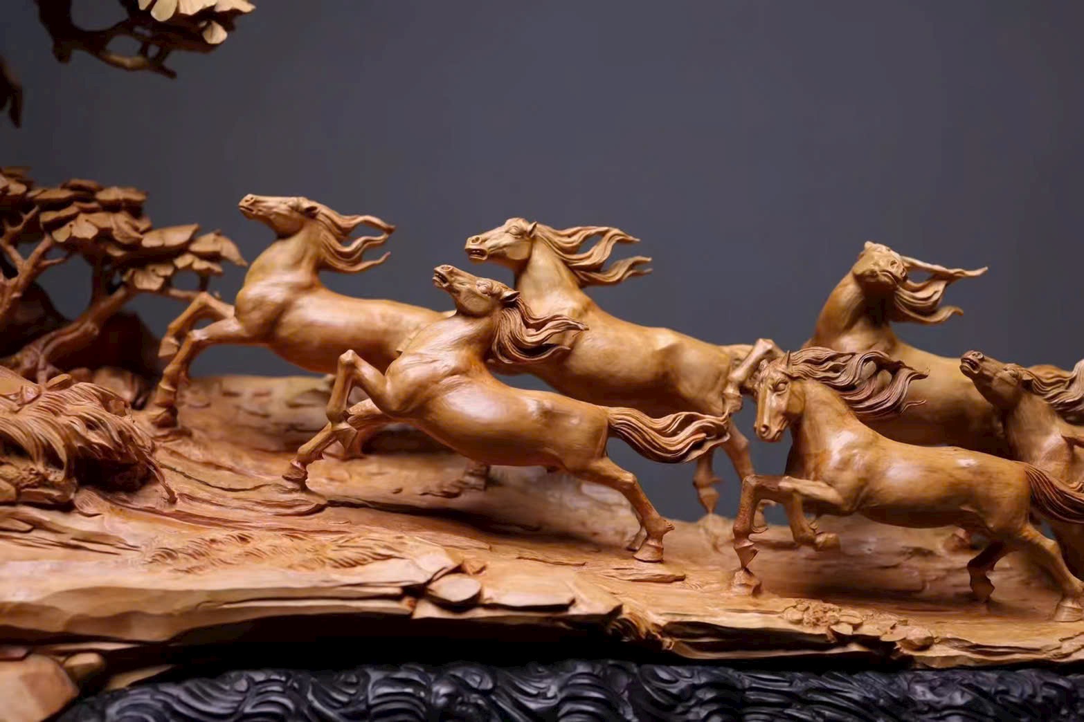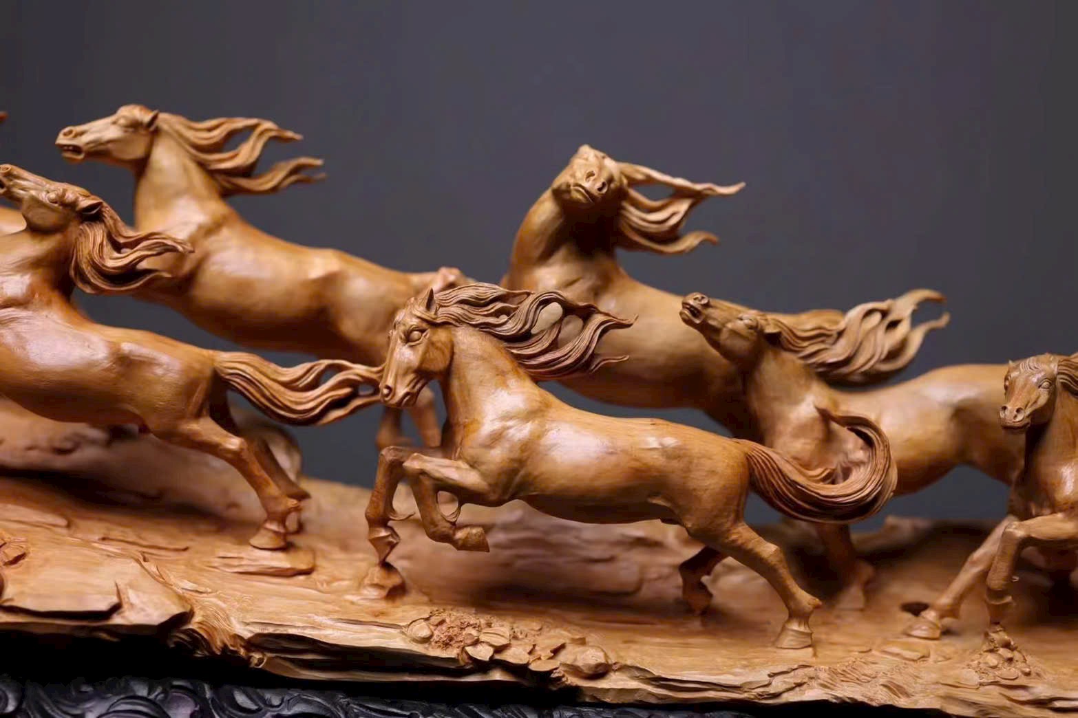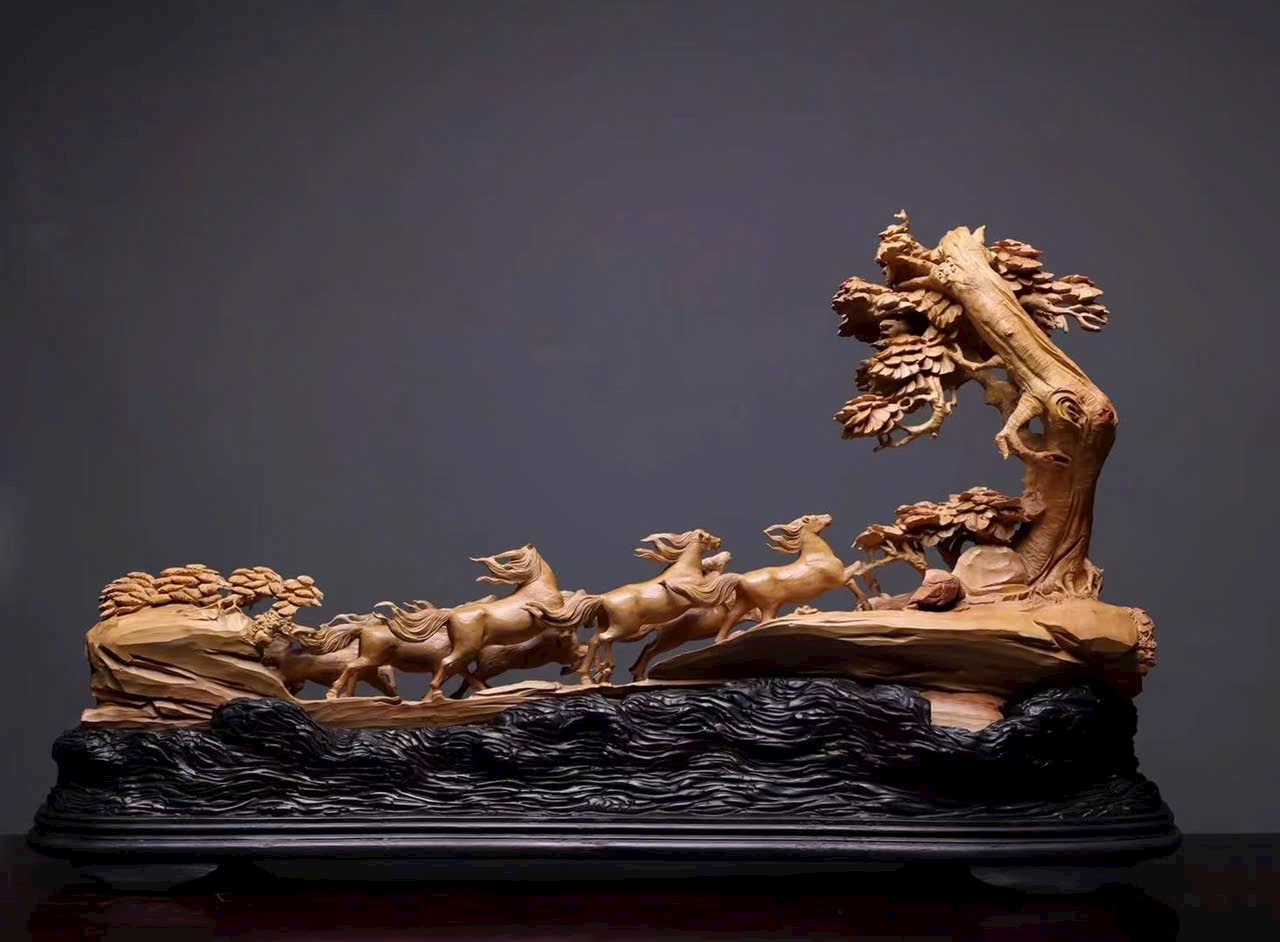 Đàn ngựa khí thế hiên ngang, dáng chạy mạnh mẽ; bờm tung bay như cuộn theo tiếng gió hú, phóng khoáng giữa trời đất bao la. Từng đường khắc sống động tái hiện thần thái oai phong của bát tuấn: con thì vươn cao cất tiếng hí, con lại tung vó lao nhanh, tạo nên khí thế hùng tráng. Hàm chứa ý nghĩa mã đáo thành công – bước bước thăng hoa.