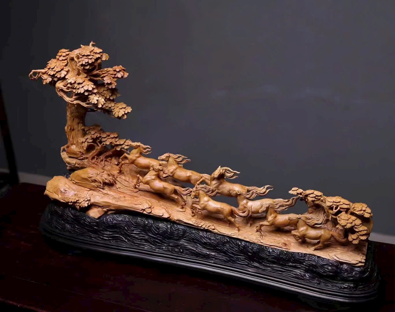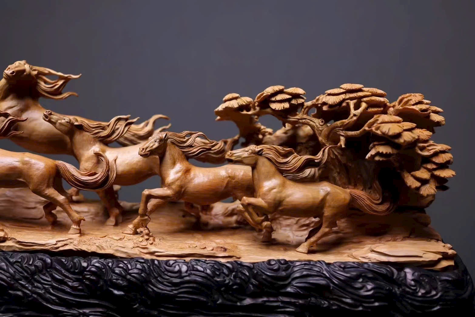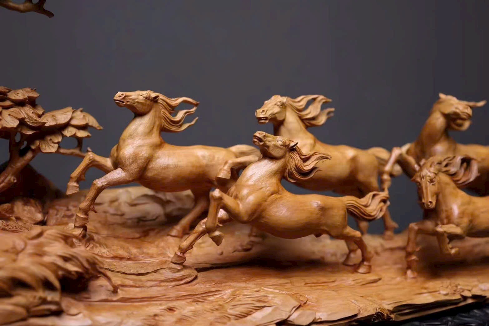 Đàn ngựa khí thế hiên ngang, dáng chạy mạnh mẽ; bờm tung bay như cuộn theo tiếng gió hú, phóng khoáng giữa trời đất bao la. Từng đường khắc sống động tái hiện thần thái oai phong của bát tuấn: con thì vươn cao cất tiếng hí, con lại tung vó lao nhanh, tạo nên khí thế hùng tráng. Hàm chứa ý nghĩa mã đáo thành công – bước bước thăng hoa.