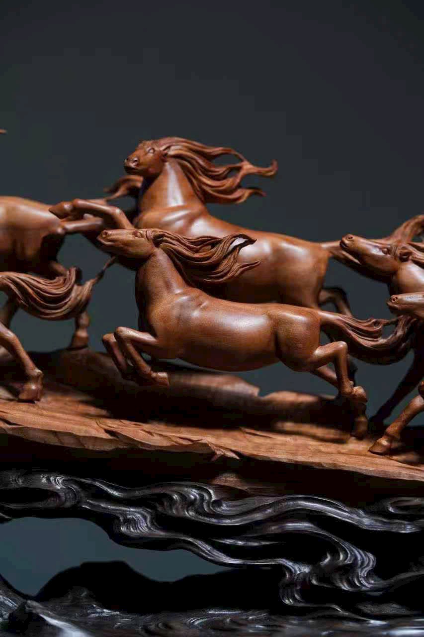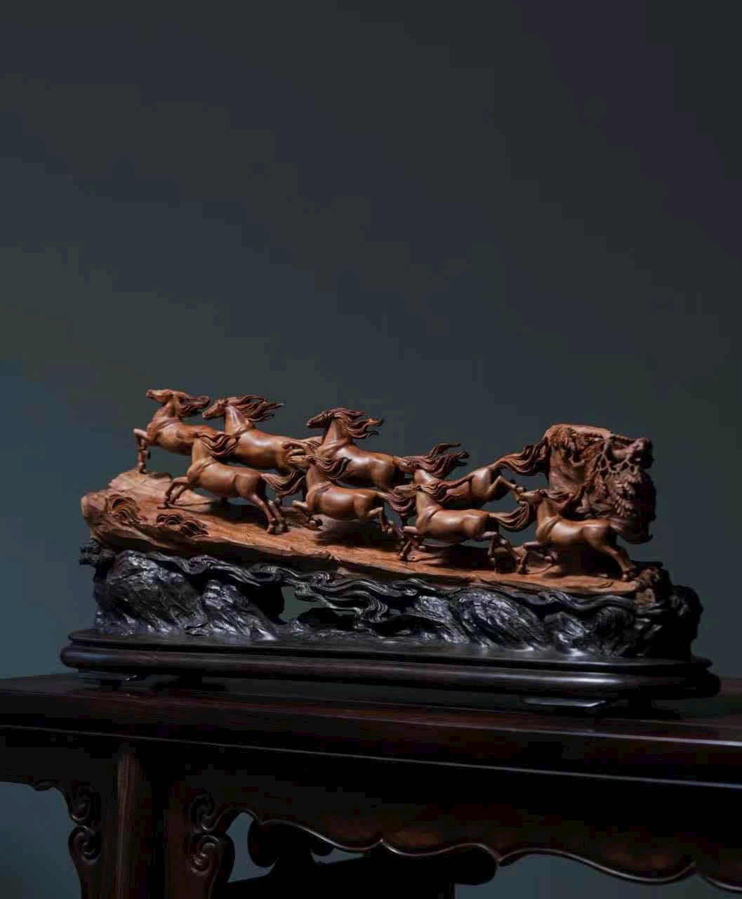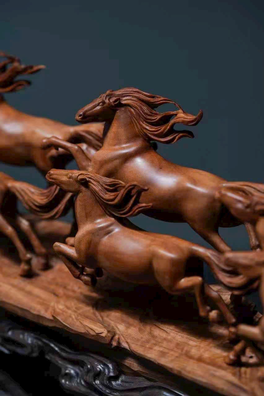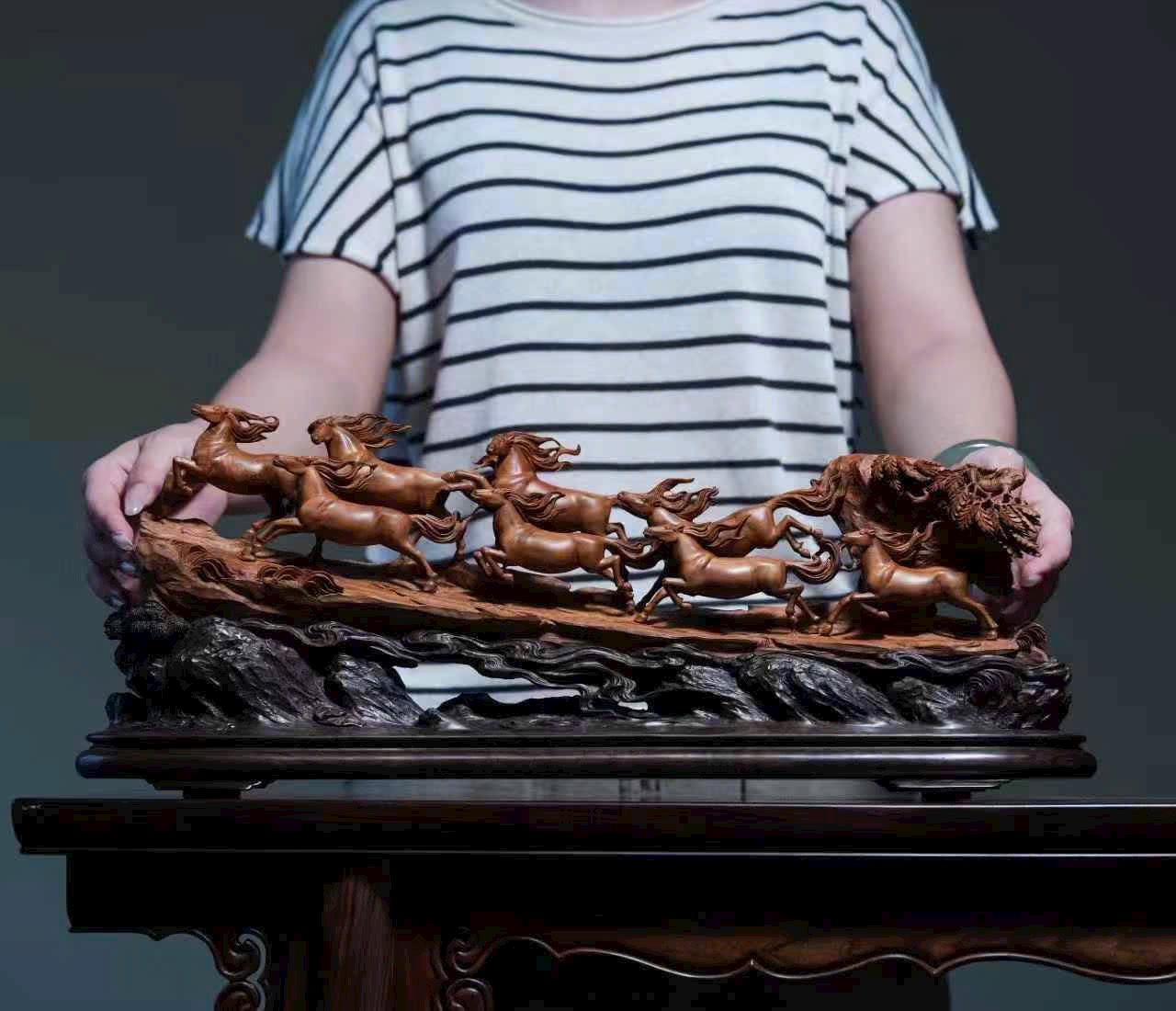 Gỗ Đàn Hương Ấn Độ thơm nức, tám tuấn mã tung vó trên mây, bờm bay theo gió – khí thế như sấm động. Tượng trưng chí lớn ngàn dặm, thích hợp bài trí phòng khách, thư phòng.