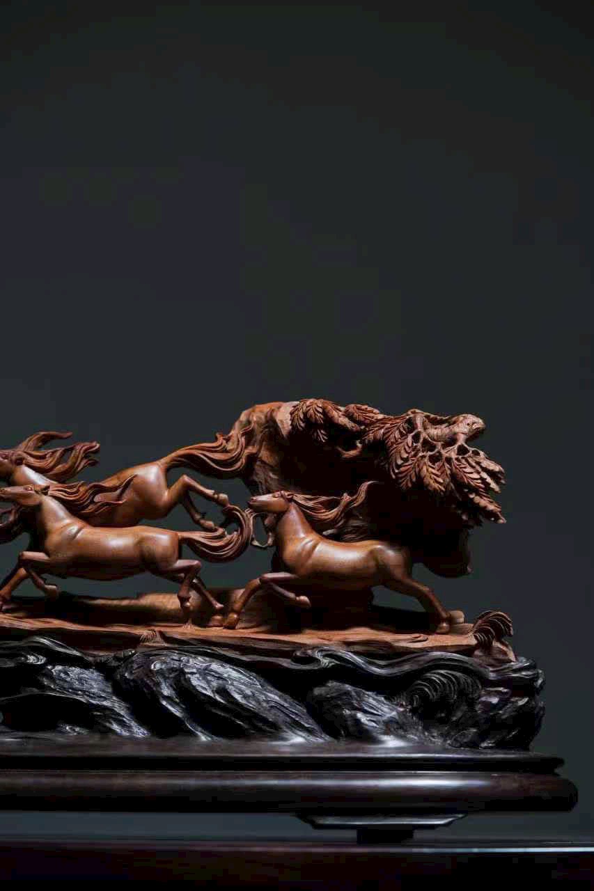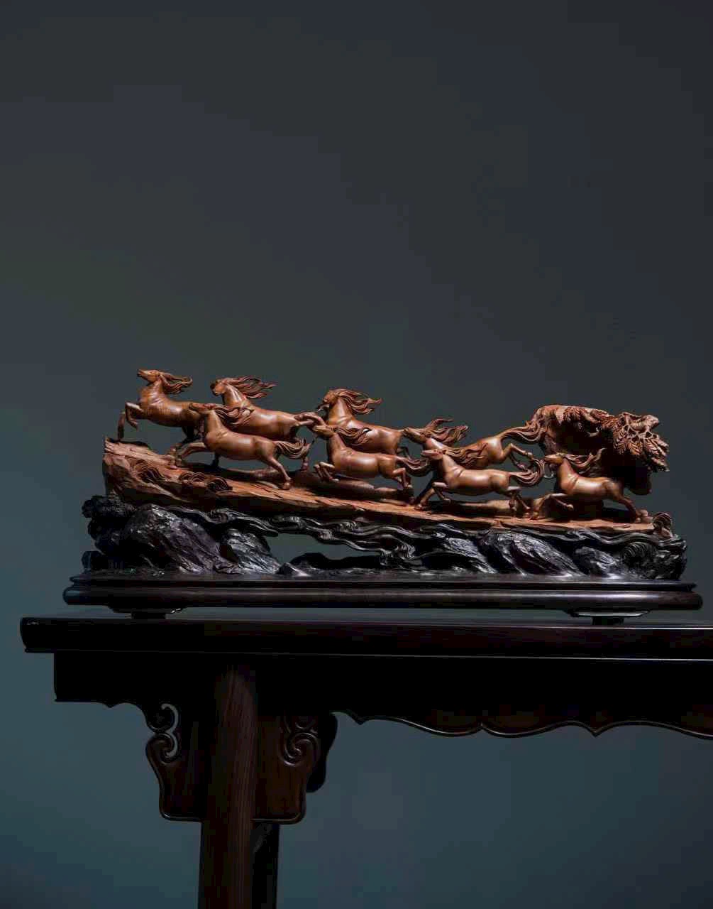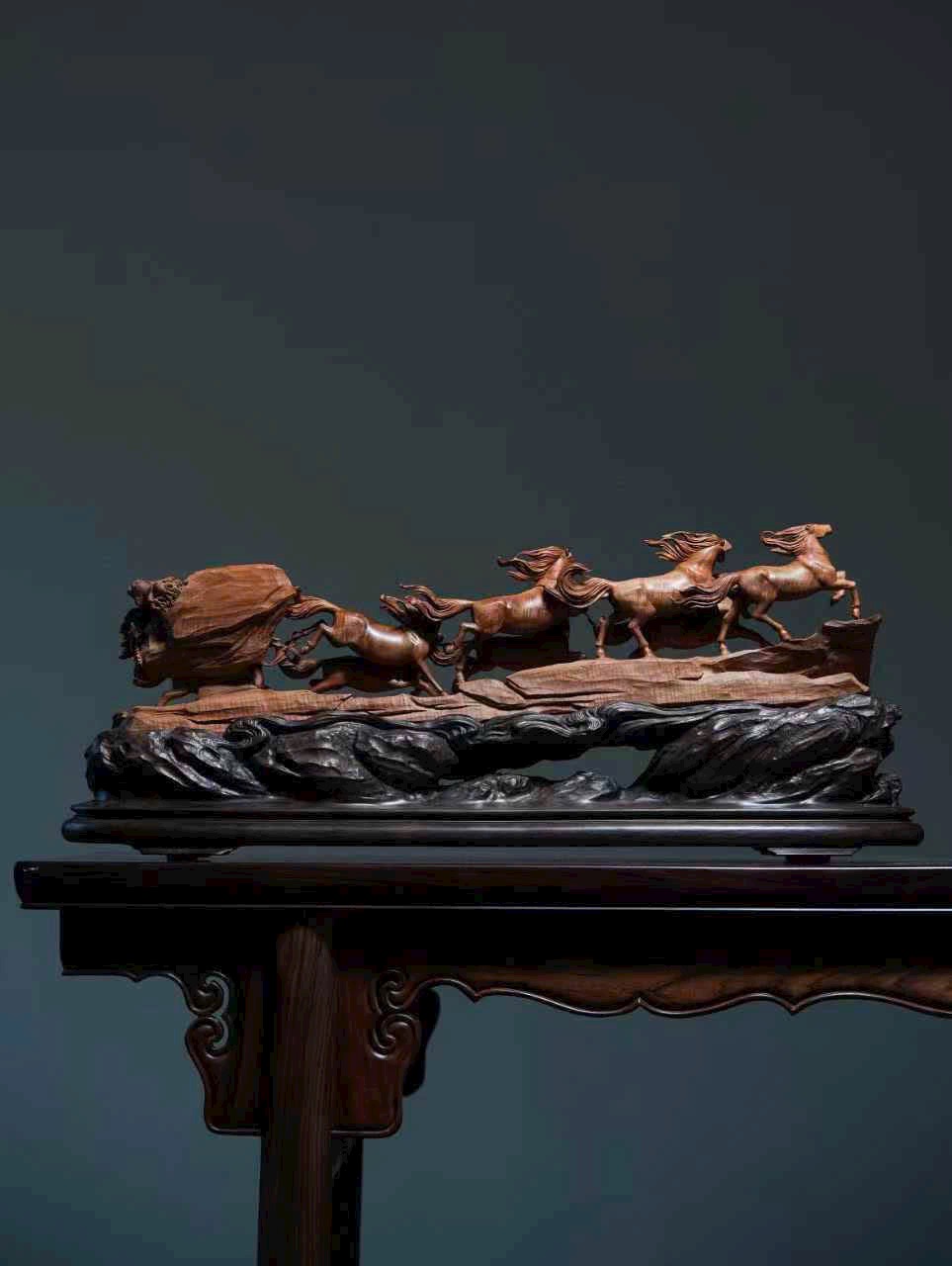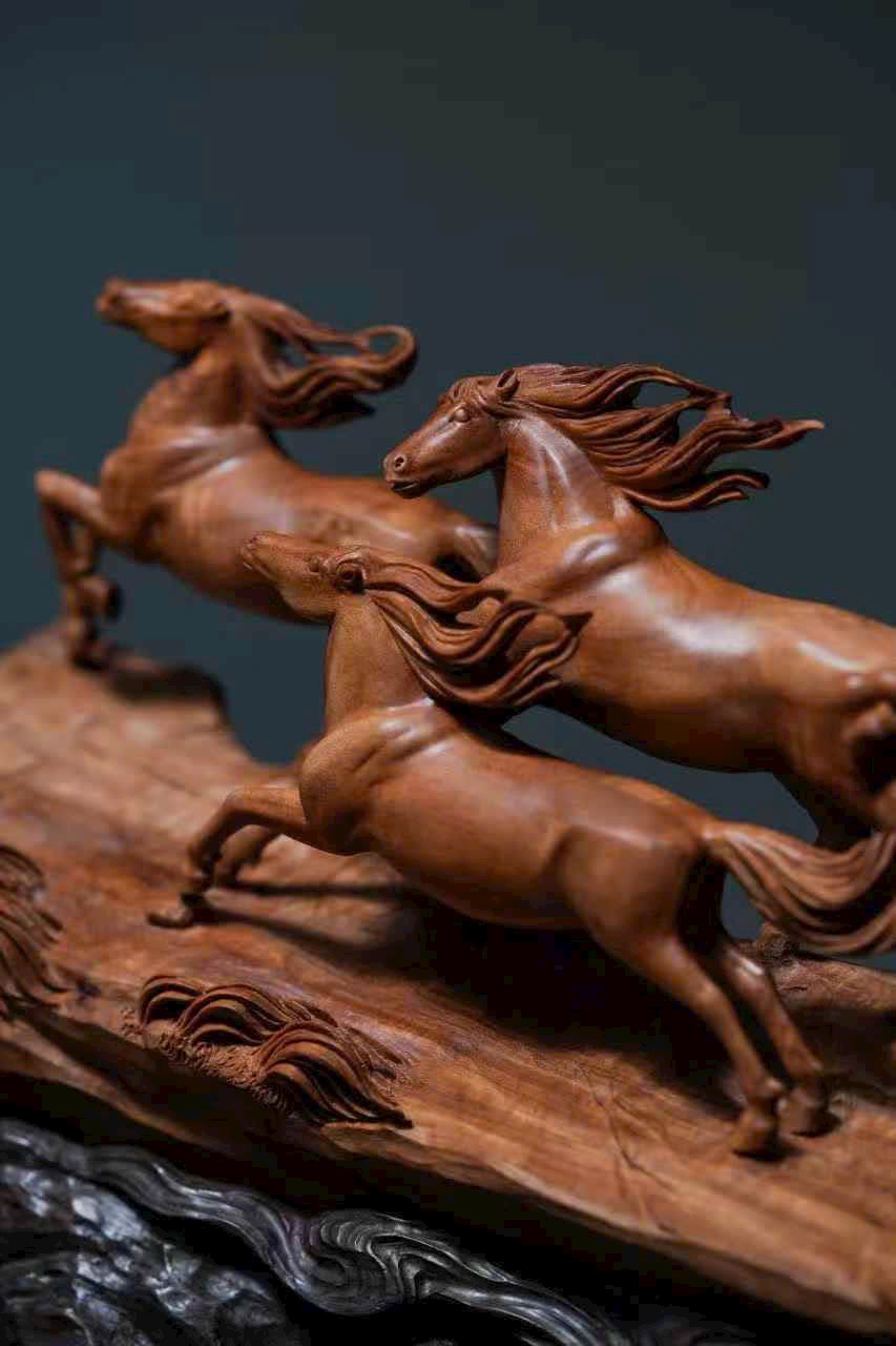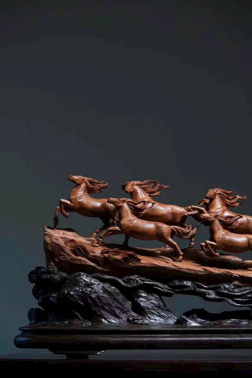 Gỗ Đàn Hương Ấn Độ thơm nức, tám tuấn mã tung vó trên mây, bờm bay theo gió – khí thế như sấm động. Tượng trưng chí lớn ngàn dặm, thích hợp bài trí phòng khách, thư phòng.