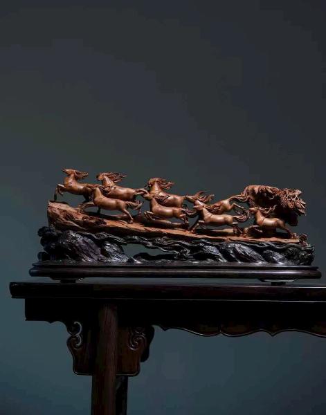 Gỗ Đàn Hương Ấn Độ thơm nức, tám tuấn mã tung vó trên mây, bờm bay theo gió – khí thế như sấm động. Tượng trưng chí lớn ngàn dặm, thích hợp bài trí phòng khách, thư phòng.