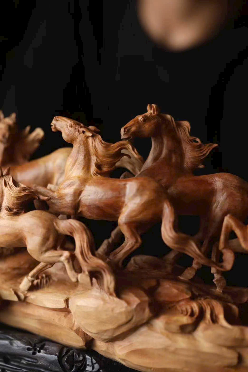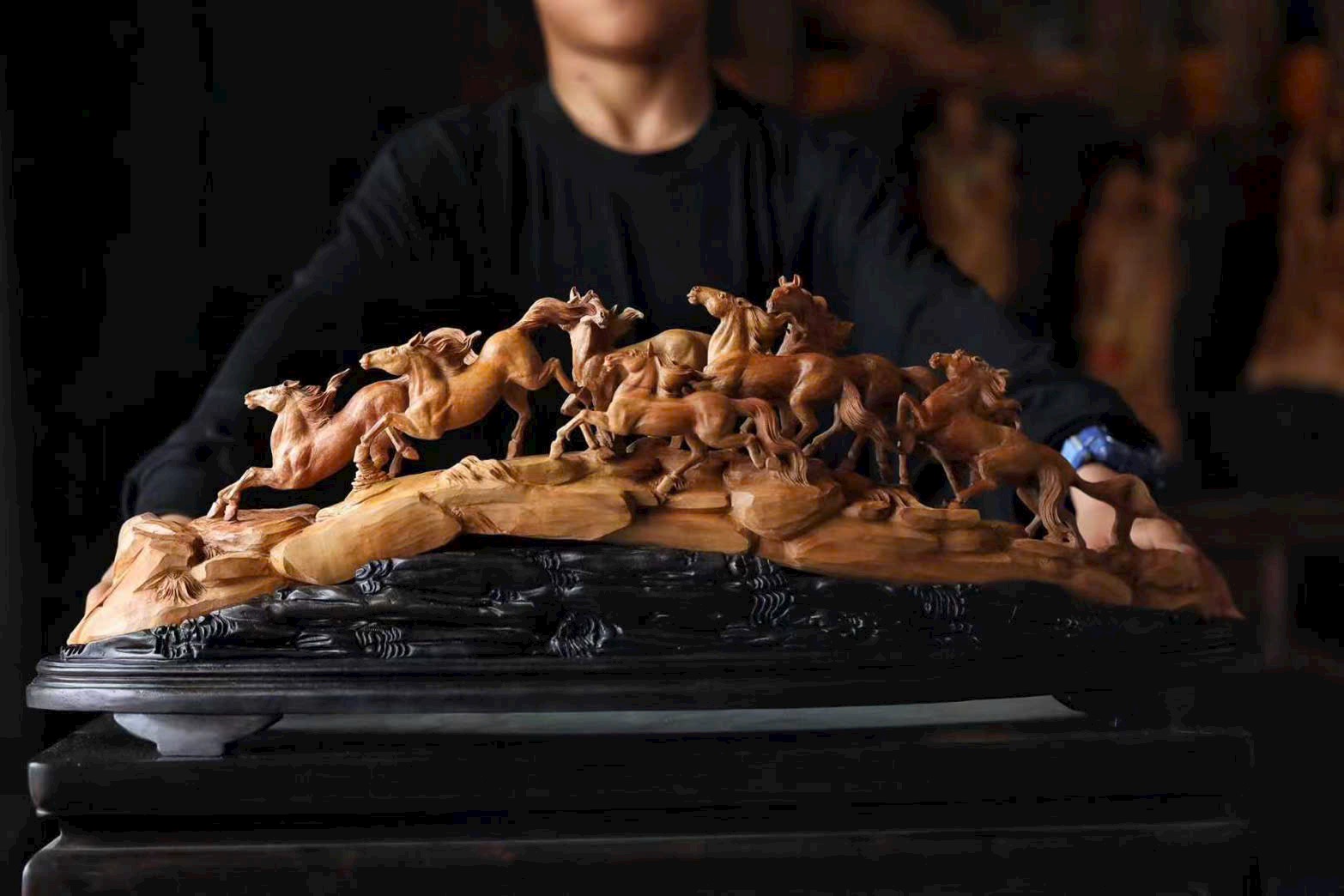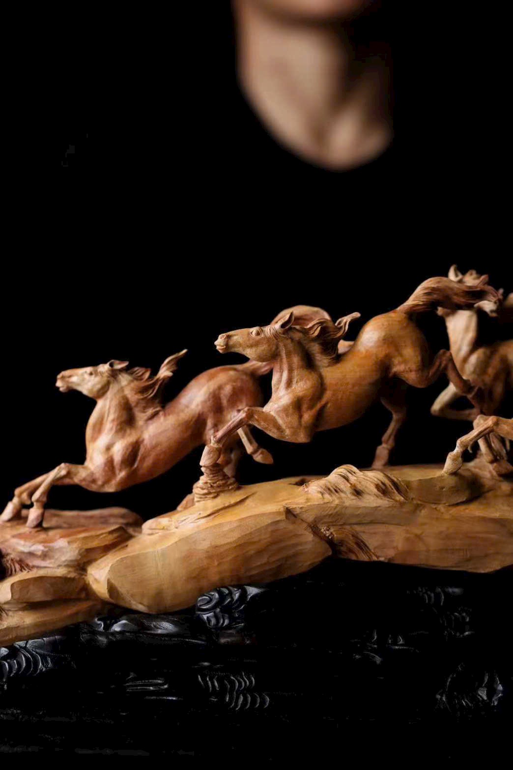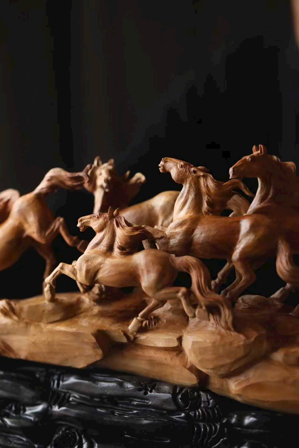 Chế tác từ nguyên khối, chạm rỗng tinh xảo, đàn ngựa phi nước đại sống động như thật. Tám tuấn mã dáng thế mỗi con một vẻ: con ngẩng đầu hí vang, con tung vó lao nhanh, như muốn phá khỏi giới hạn của gỗ chạm để tung hoành giữa trời đất rộng lớn.