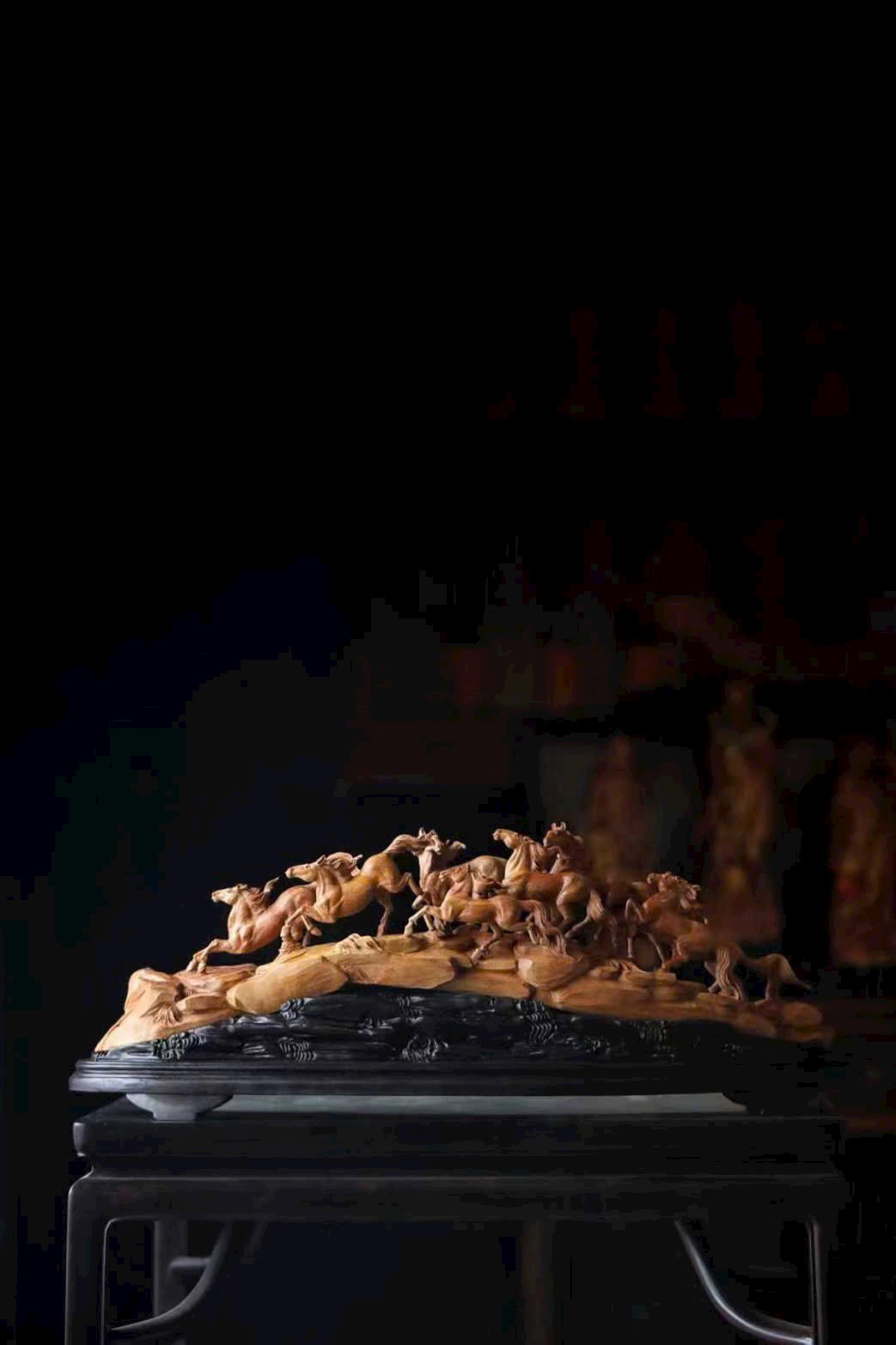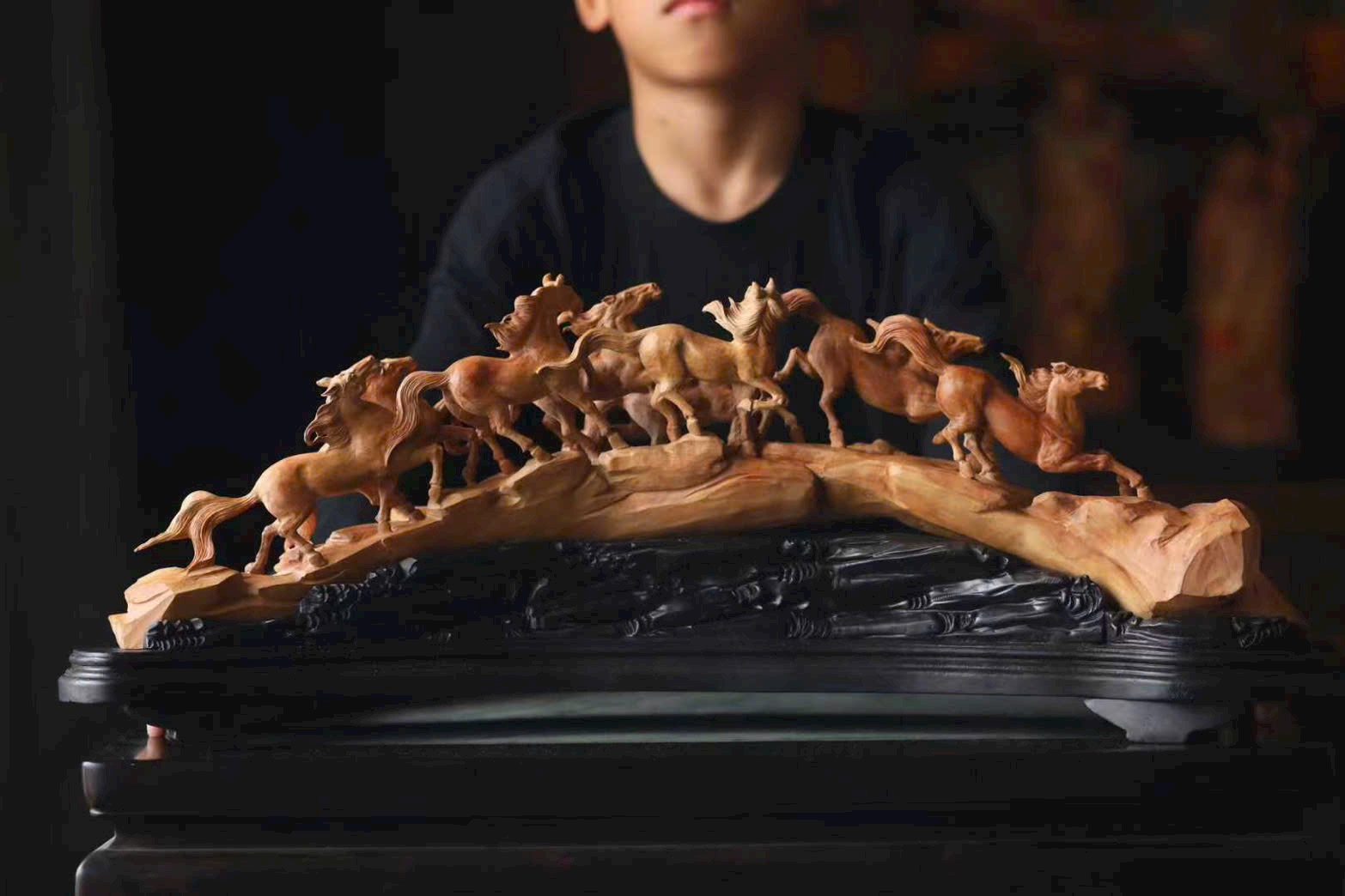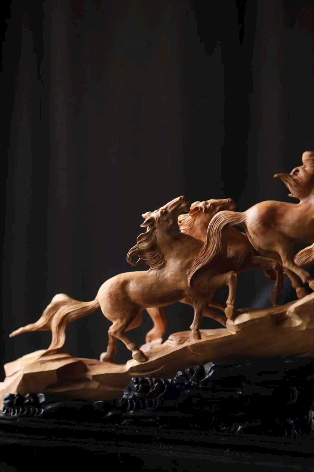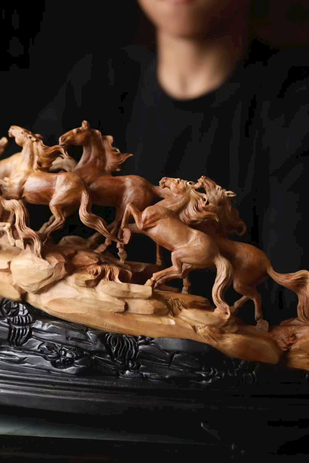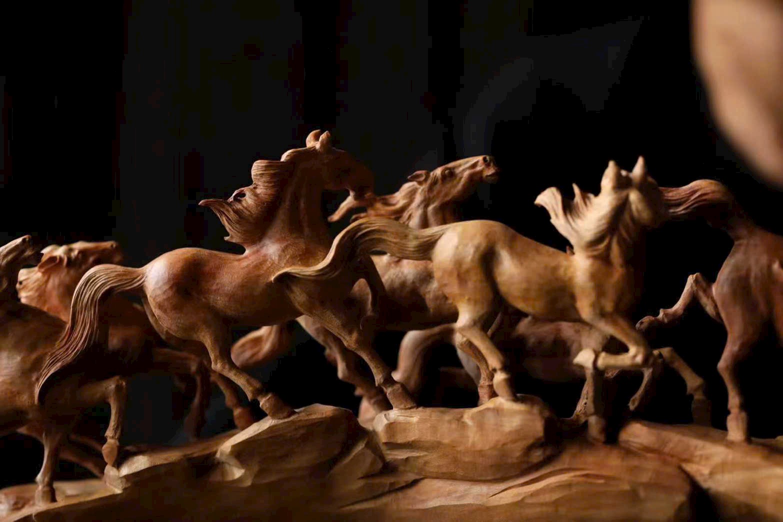 Chế tác từ nguyên khối, chạm rỗng tinh xảo, đàn ngựa phi nước đại sống động như thật. Tám tuấn mã dáng thế mỗi con một vẻ: con ngẩng đầu hí vang, con tung vó lao nhanh, như muốn phá khỏi giới hạn của gỗ chạm để tung hoành giữa trời đất rộng lớn.