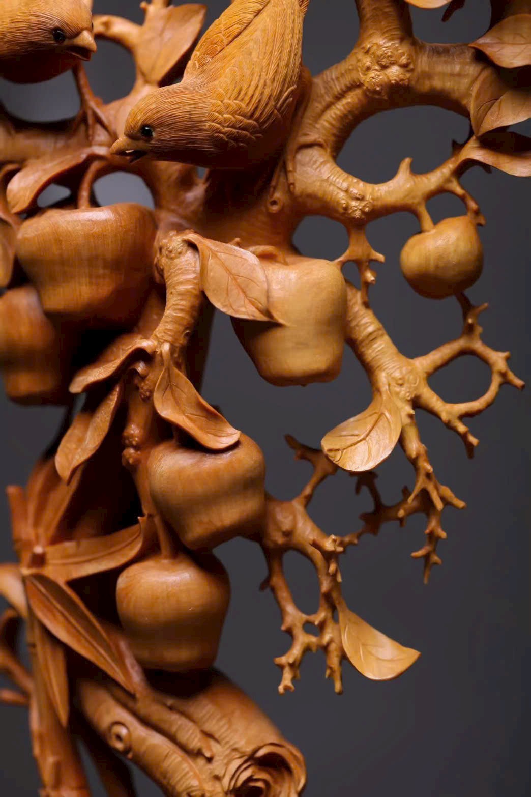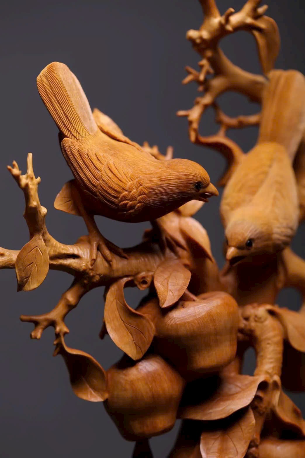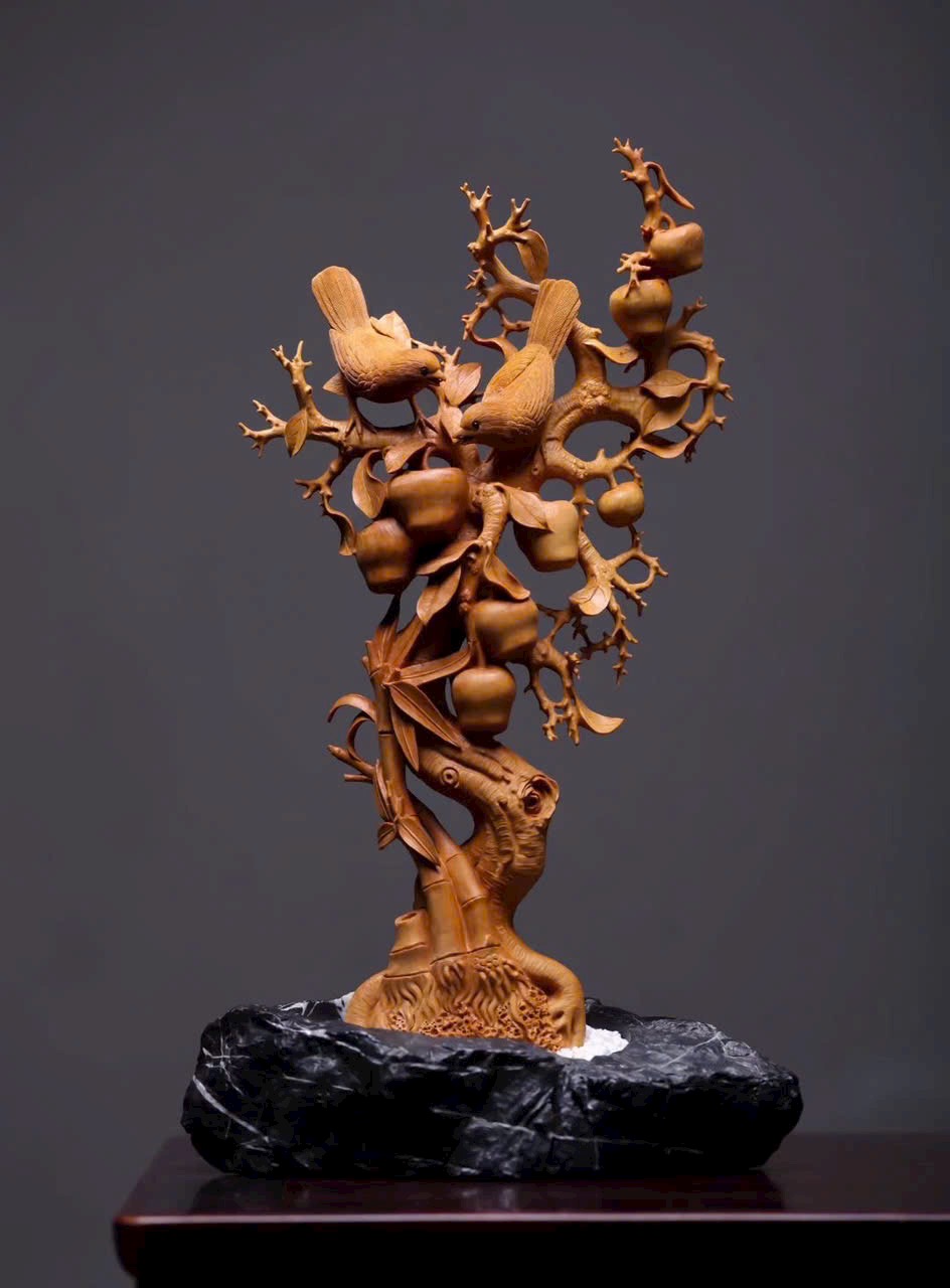 Quả táo tròn đầy căng mọng như ẩn chứa vị ngọt thanh. Đôi chim hỷ tước nép mình trên cành, cùng lá và quả dệt nên bức họa, gửi gắm ý vị bình an, khắc thành lời chúc an vui bất tận nơi án thư.
