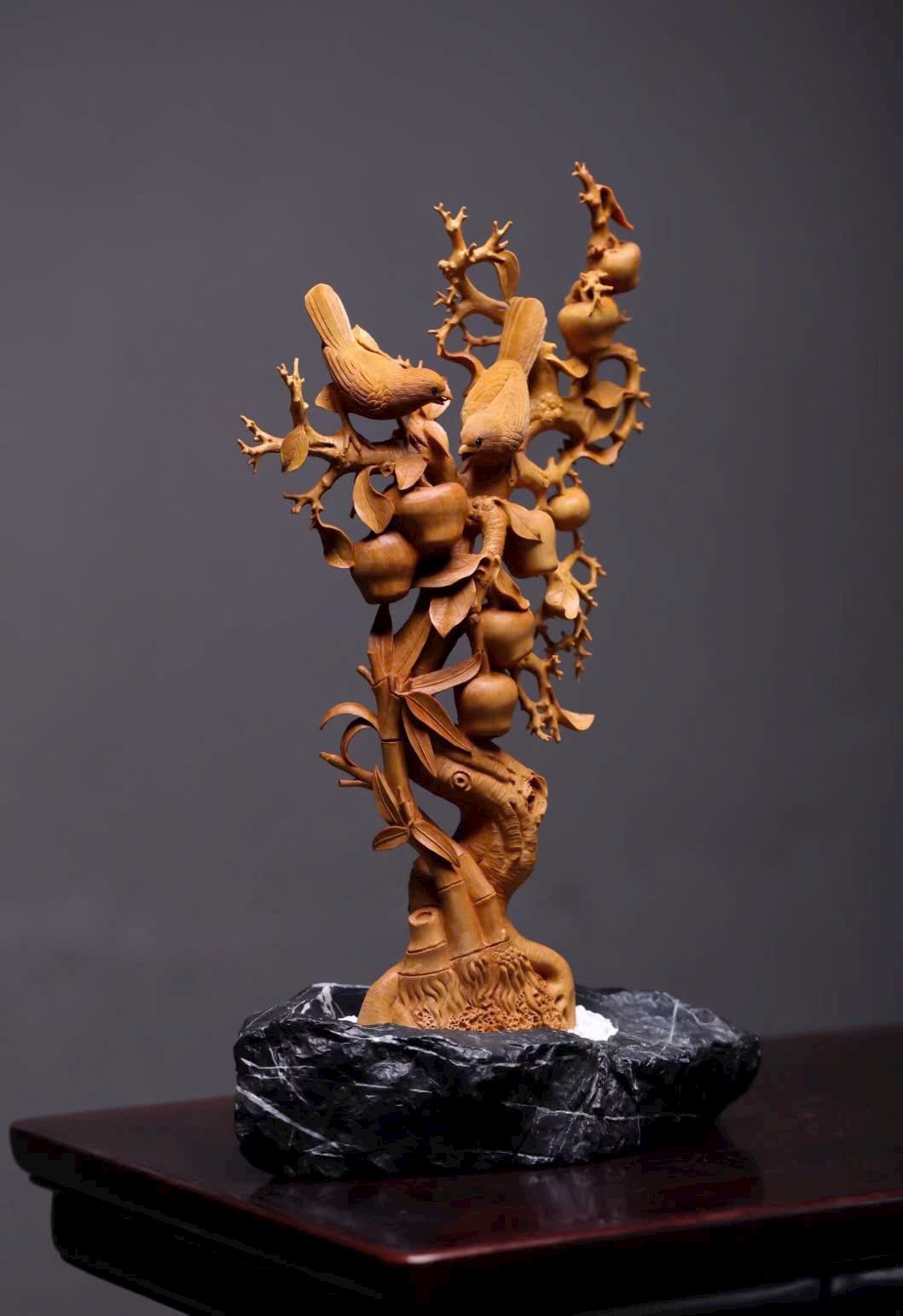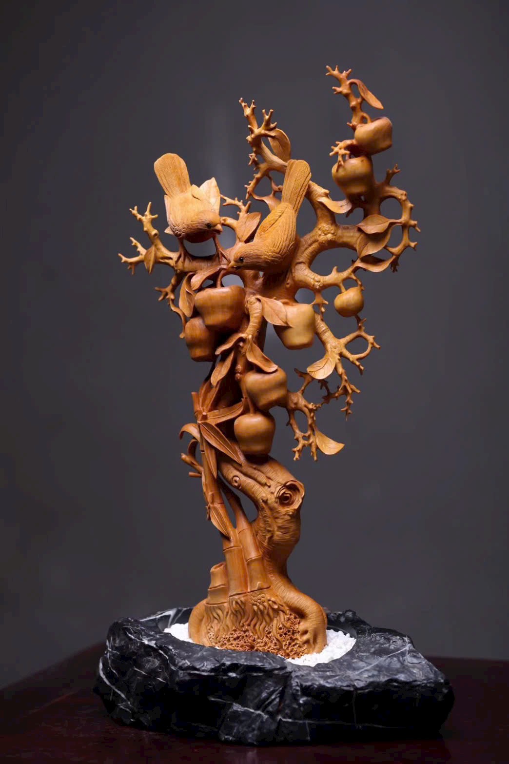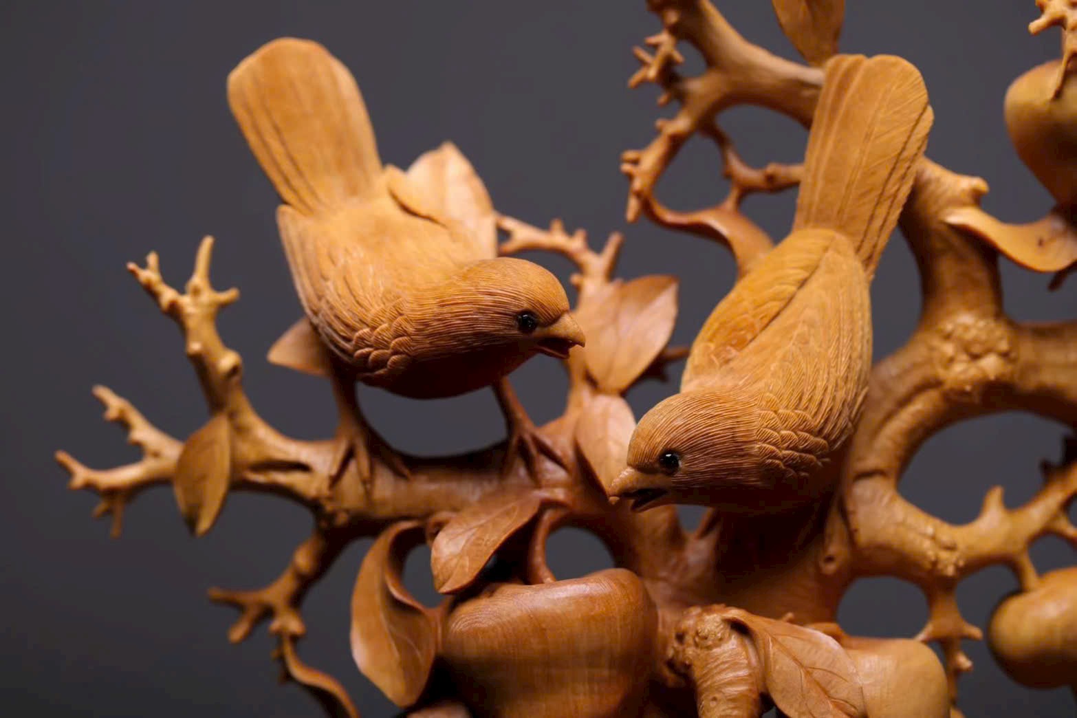 Quả táo tròn đầy căng mọng như ẩn chứa vị ngọt thanh. Đôi chim hỷ tước nép mình trên cành, cùng lá và quả dệt nên bức họa, gửi gắm ý vị bình an, khắc thành lời chúc an vui bất tận nơi án thư.