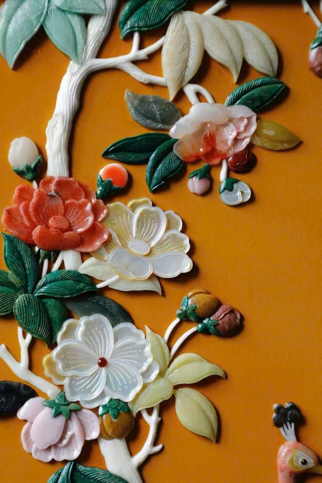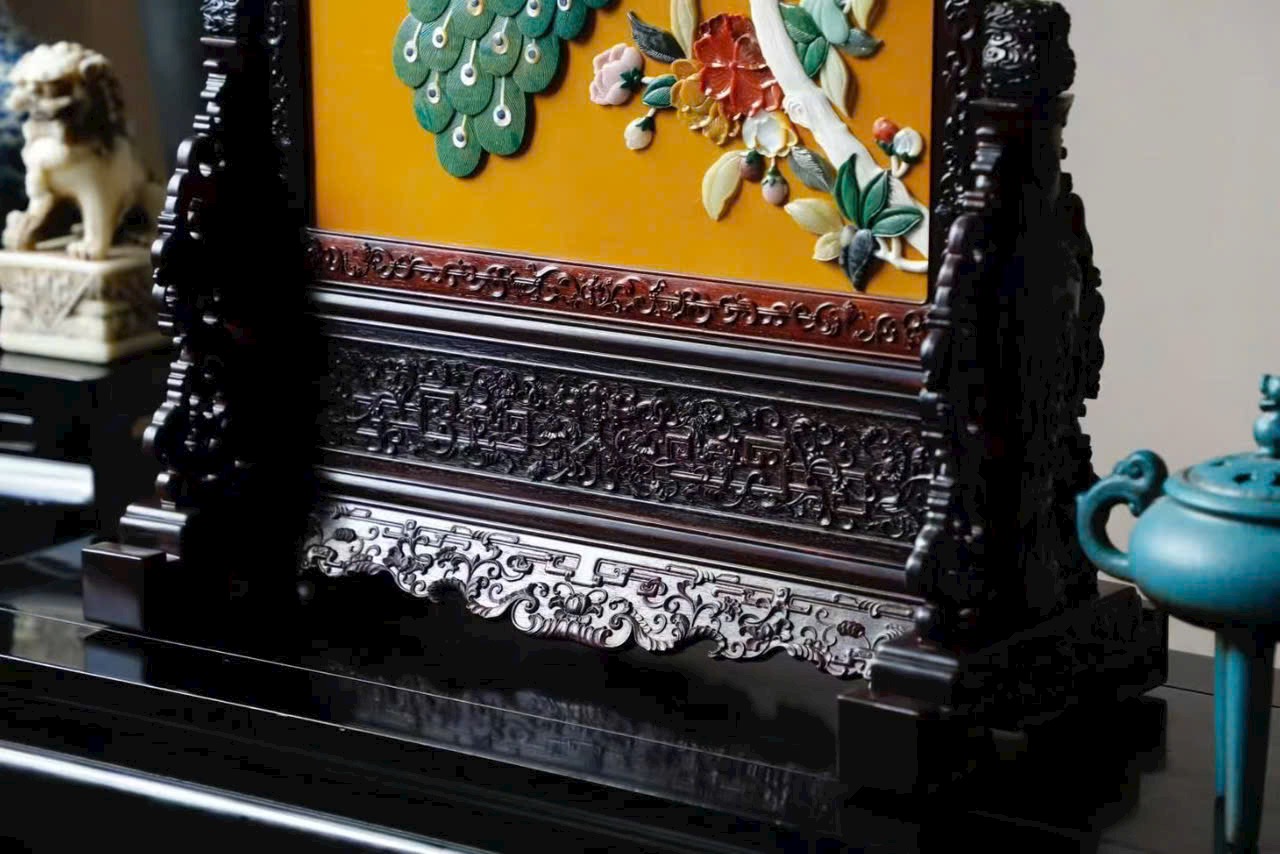 Giữa bình khảm bách bảo đồ án “Khổng tước phú quý”, kết hợp kỹ pháp vẽ thếp kim, tái hiện lầu đài, đình các, cảnh hải thị thận lâu mờ ảo như mộng.