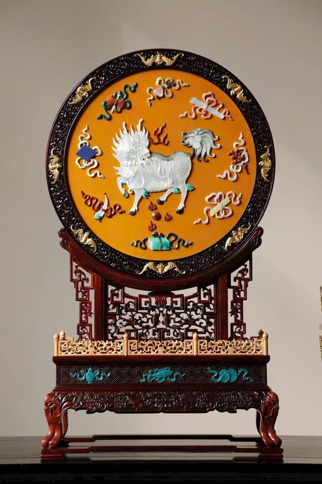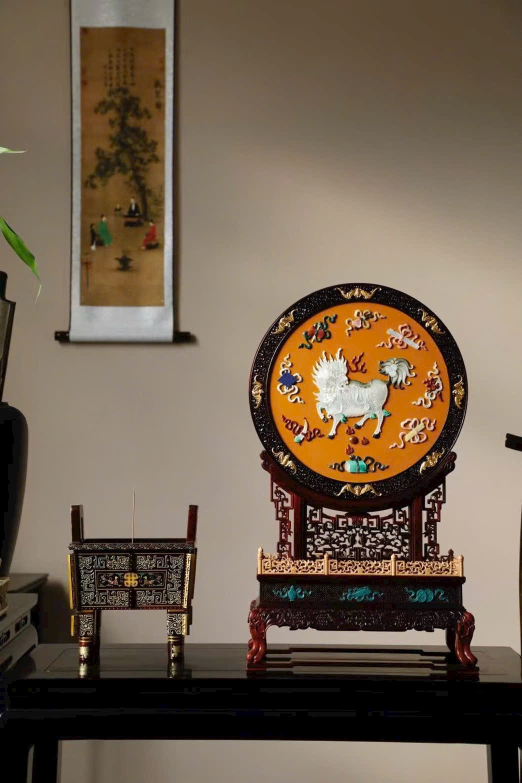 Mặt trước áp dụng kỹ pháp “chu chế” khảm nổi, tạo hình Kỳ lân bát bảo, mang ý nghĩa kỳ lân xuất hiện nơi đâu tất sinh cát tường.