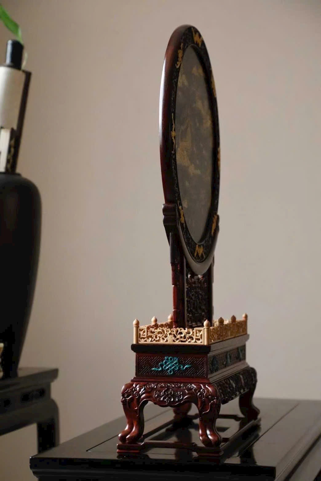 Mặt sau nền sơn đen, vẽ vàng cảnh sơn thủy sống động như thật.