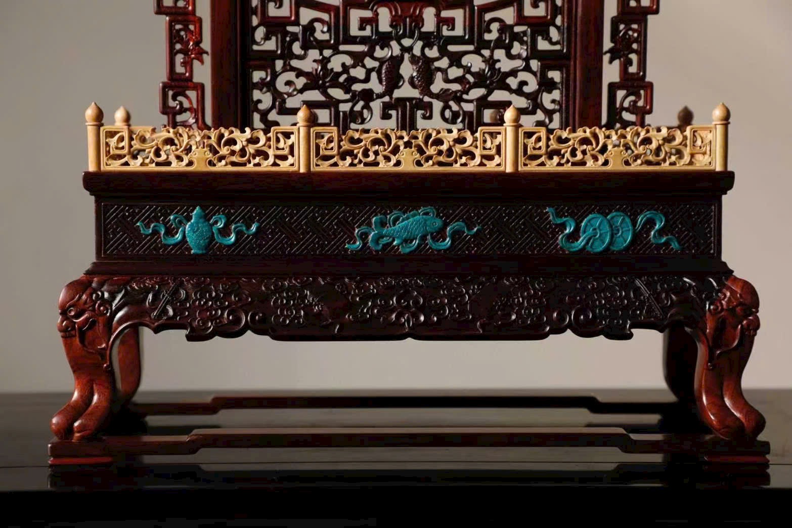 Tác phẩm bình phong làm từ tử đàn lá nhỏ Ấn Độ, kết cấu mộng – lỗ truyền thống.
