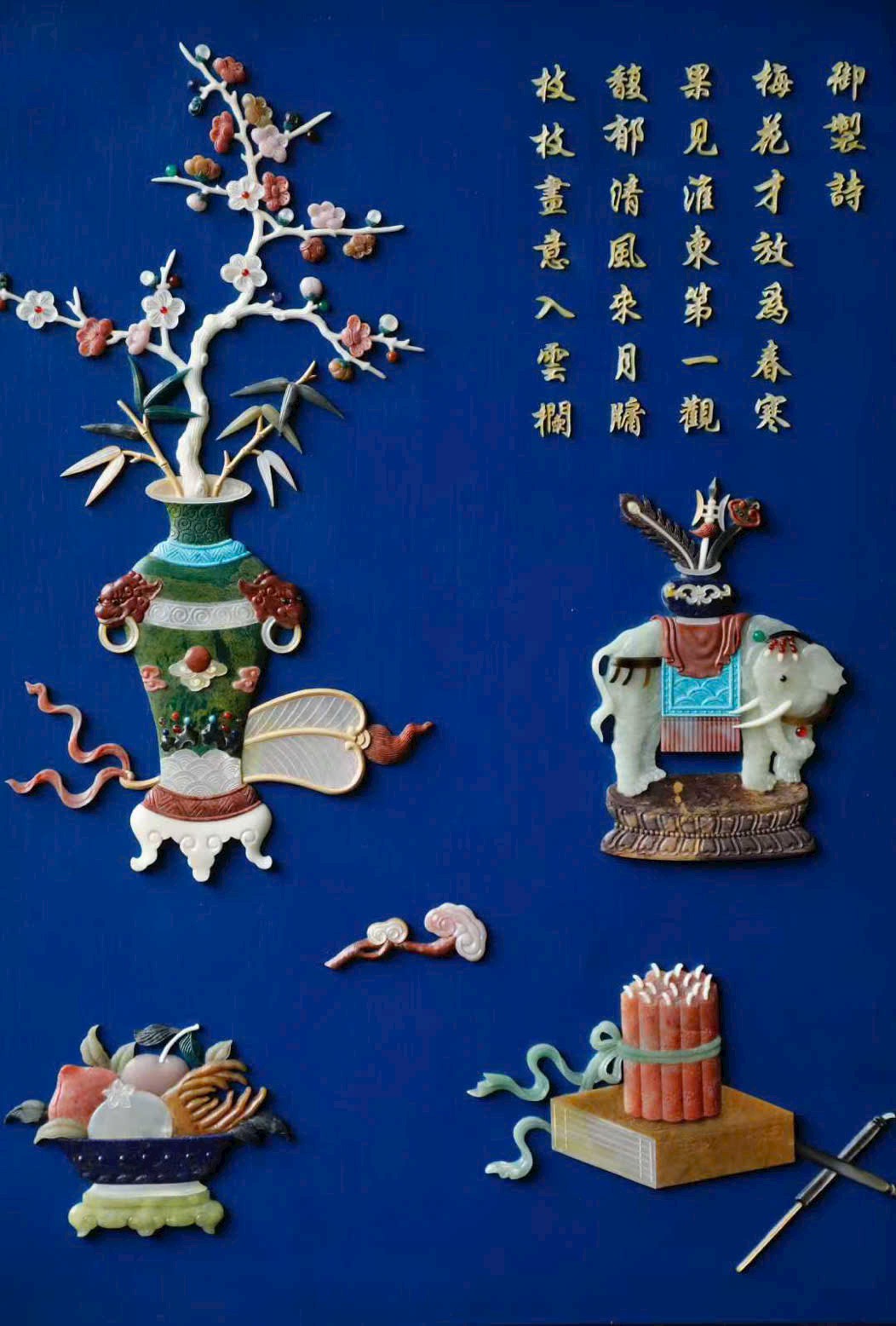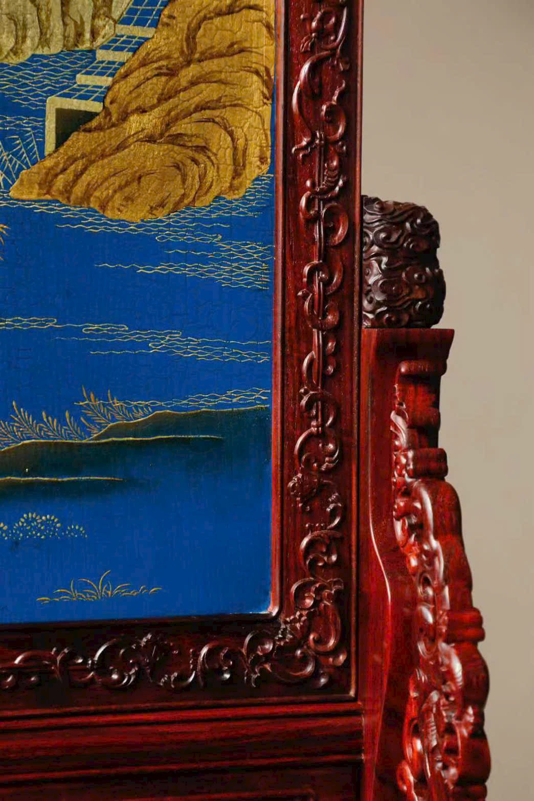 Mặt bình phong khảm bách bảo danh quý ngọc thạch, kết hợp kỹ nghệ miêu kim tinh xảo, họa cảnh hải thị thận lâu (ảo cảnh lầu gác giữa mây nước), tổng thể toát lên phong vị cổ nhã, tuấn lệ.