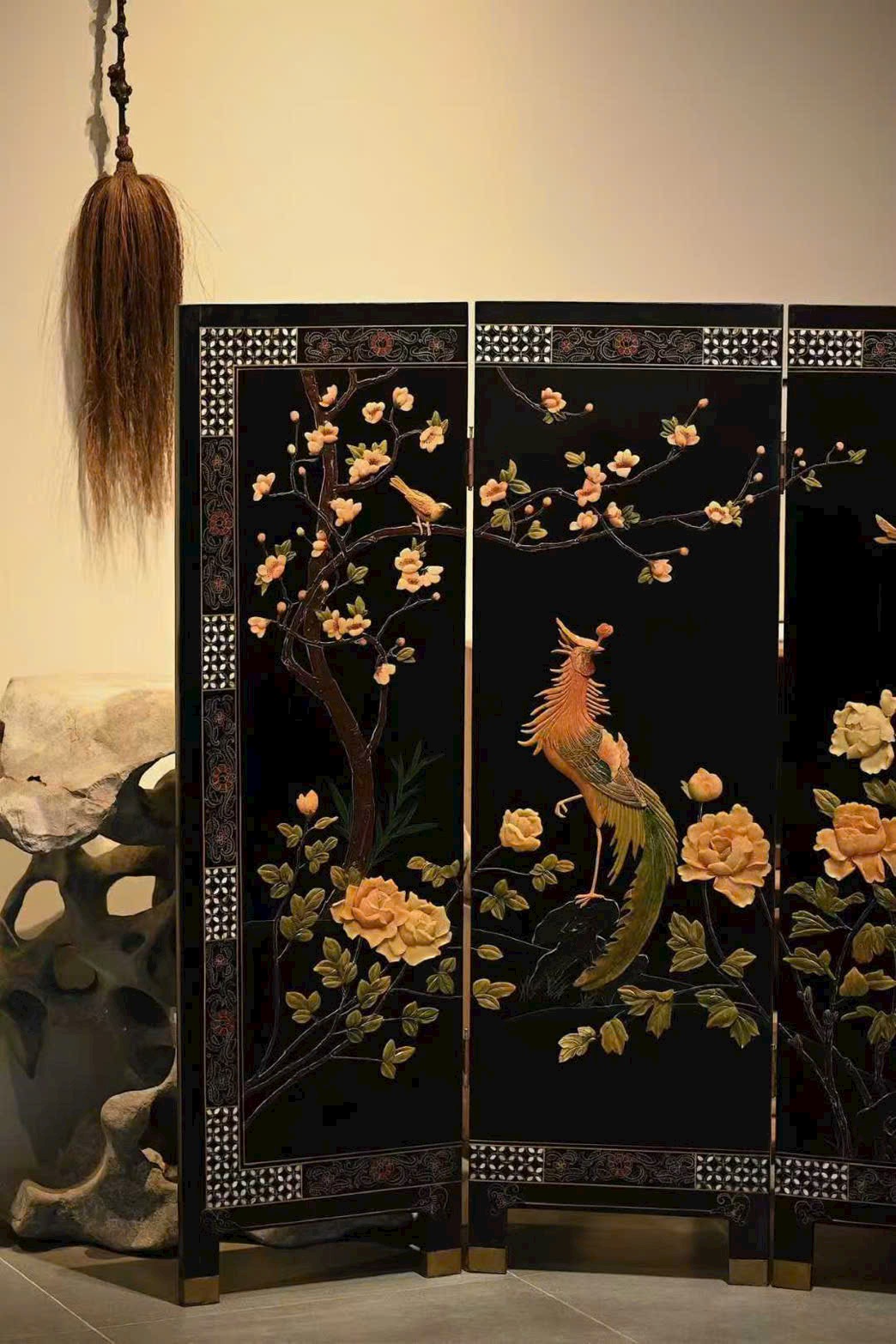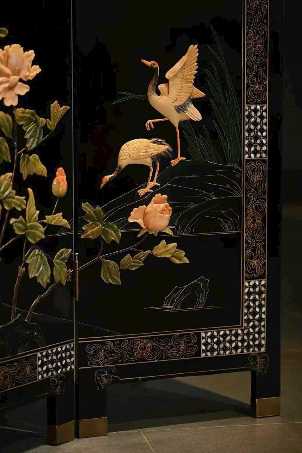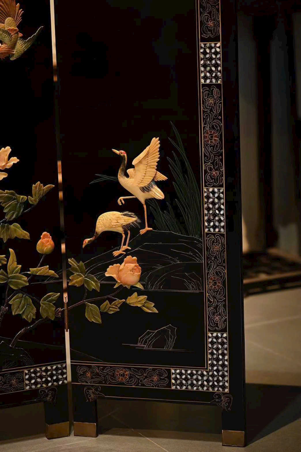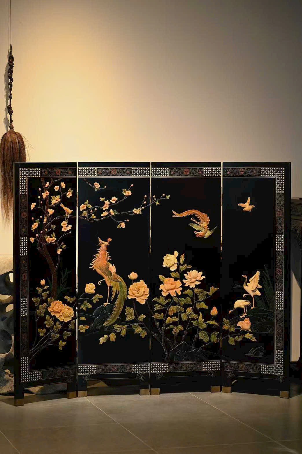 Bình phong gồm bốn cánh, dùng kỹ pháp bách bảo tạo tranh. Phượng hoàng dáng vẻ đoan trang, từng sải cánh chạm khắc tinh tế; tiên hạc phong thái nhã nhặn, uyển chuyển hài hòa; giữa tranh, mẫu đơn nở rộ, biểu trưng phú quý tràn đầy. Bày trong không gian thanh nhã, ẩn chứa ý nghĩa cát tường.