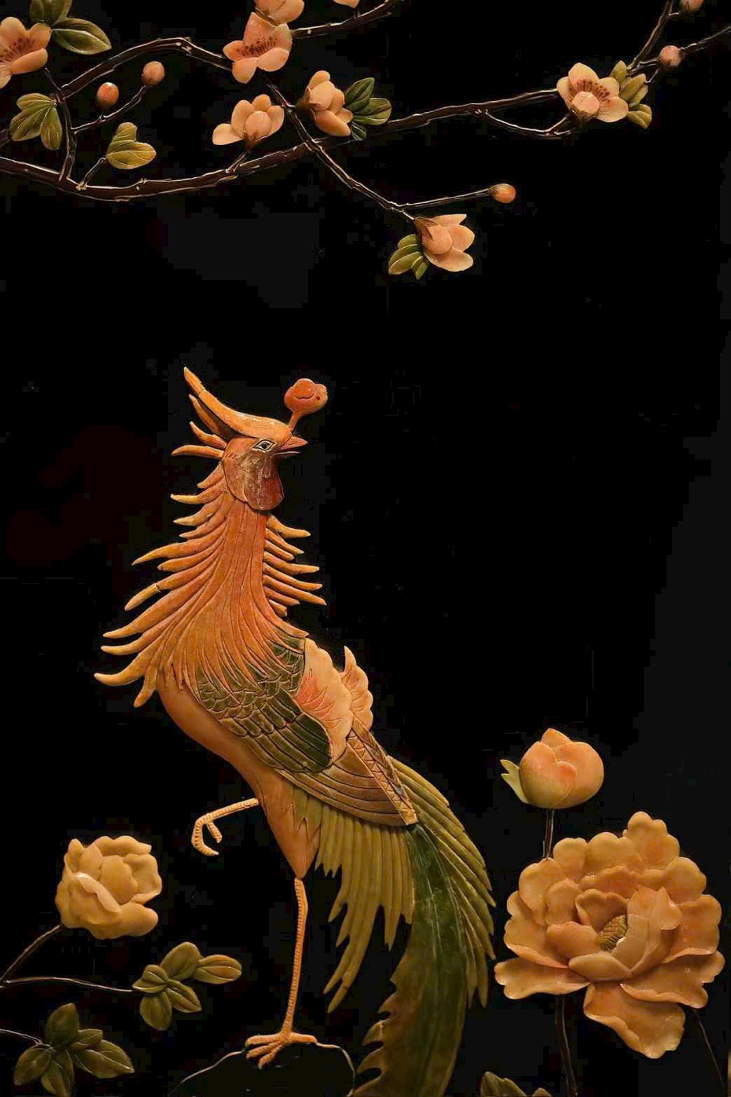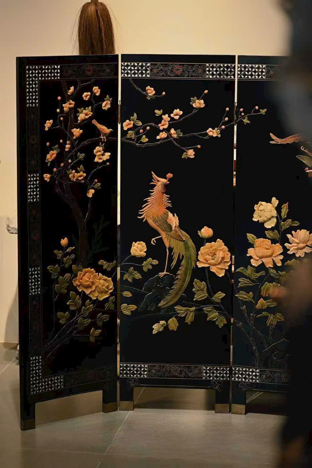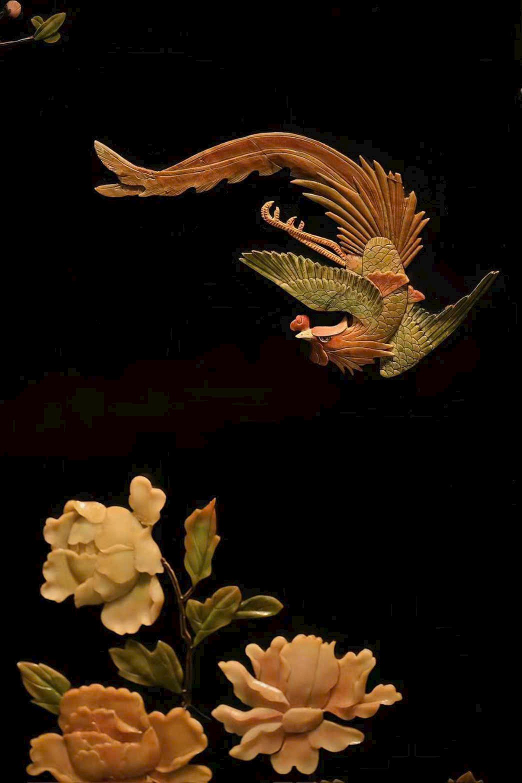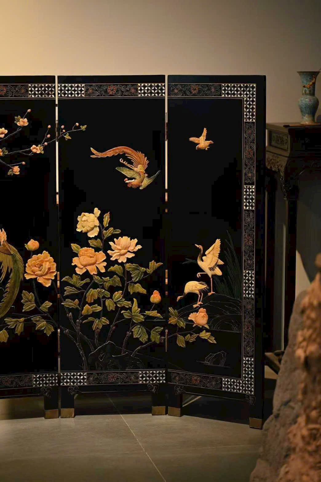 Bình phong gồm bốn cánh, dùng kỹ pháp bách bảo tạo tranh. Phượng hoàng dáng vẻ đoan trang, từng sải cánh chạm khắc tinh tế; tiên hạc phong thái nhã nhặn, uyển chuyển hài hòa; giữa tranh, mẫu đơn nở rộ, biểu trưng phú quý tràn đầy. Bày trong không gian thanh nhã, ẩn chứa ý nghĩa cát tường.