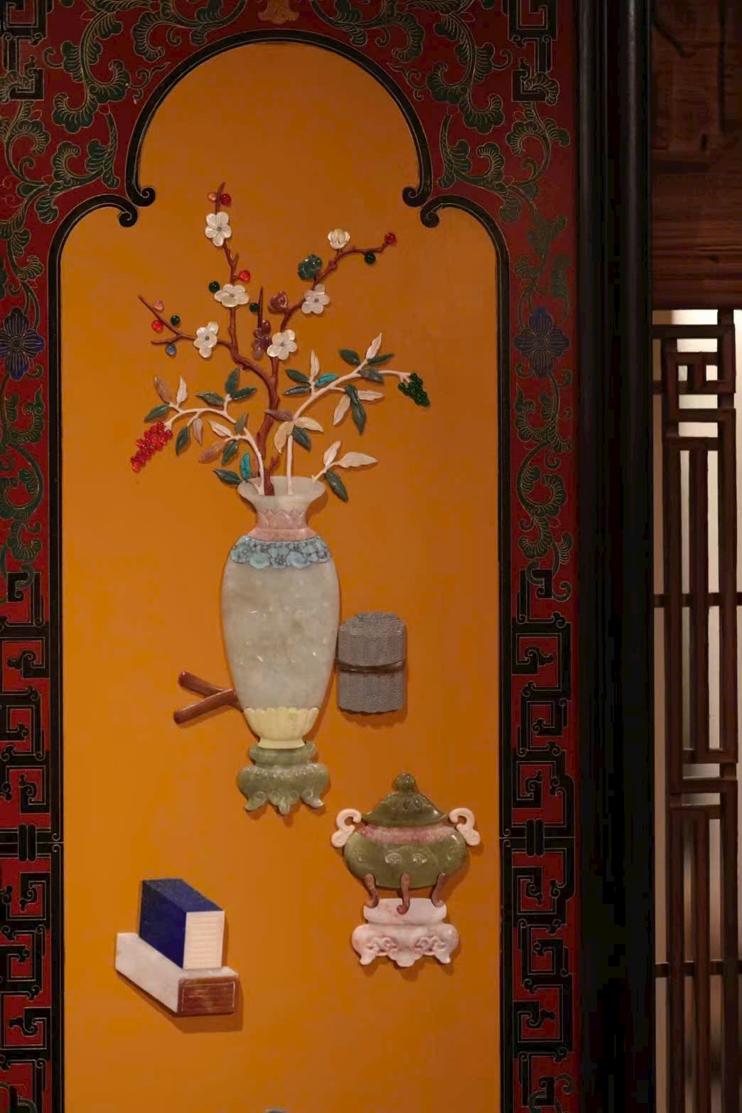 Các chất liệu ngọc – đá quý tuyển chọn gồm: thanh kim thạch (lapis lazuli), thạch anh hồng (phù dung thạch), mã não, bích ngọc, vỏ trai màu…, mỗi chất liệu đều mang vẻ đẹp riêng, cùng gửi gắm ý nghĩa hồng phúc hội tụ, bình an hỷ lạc.