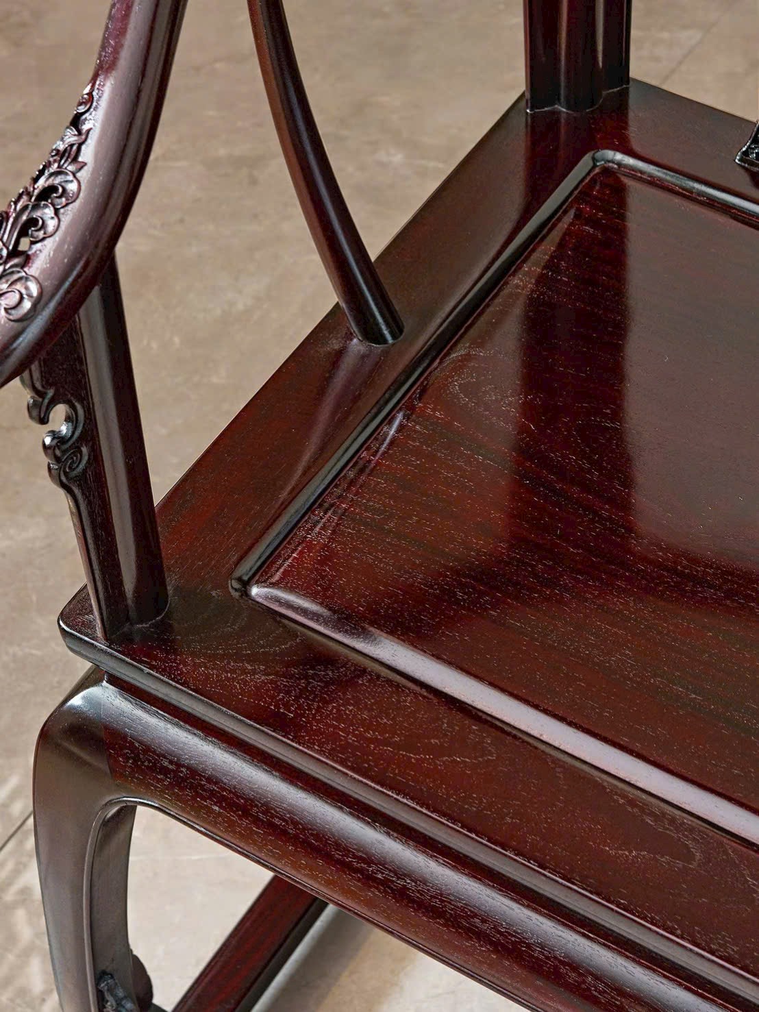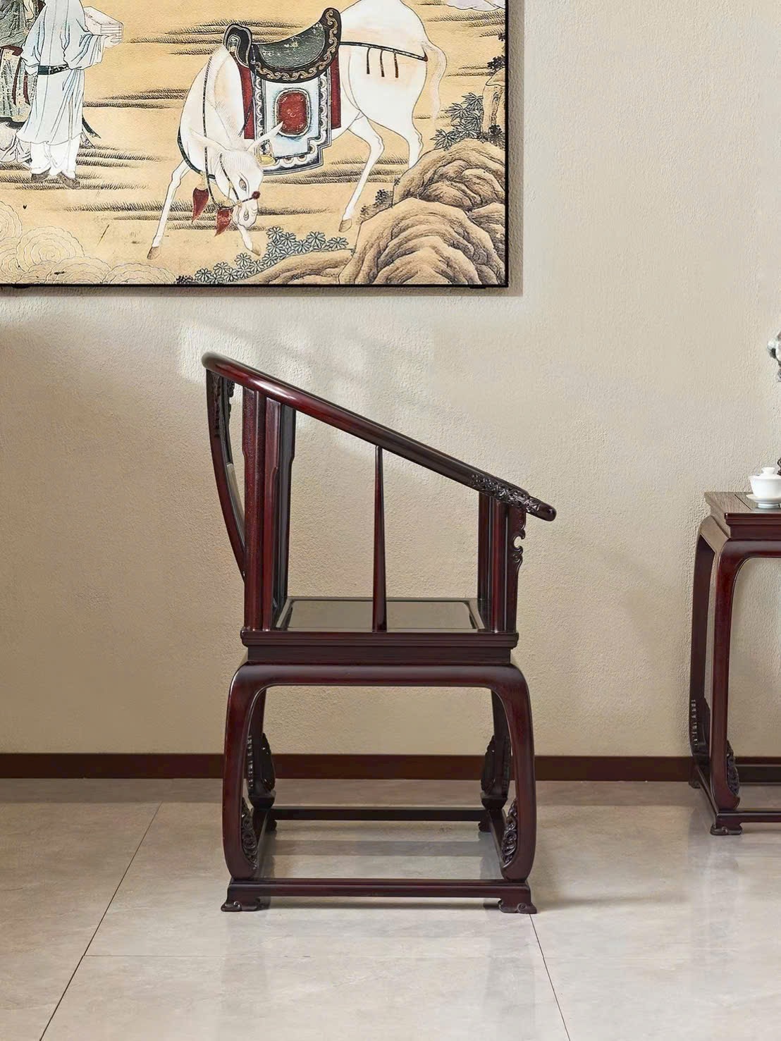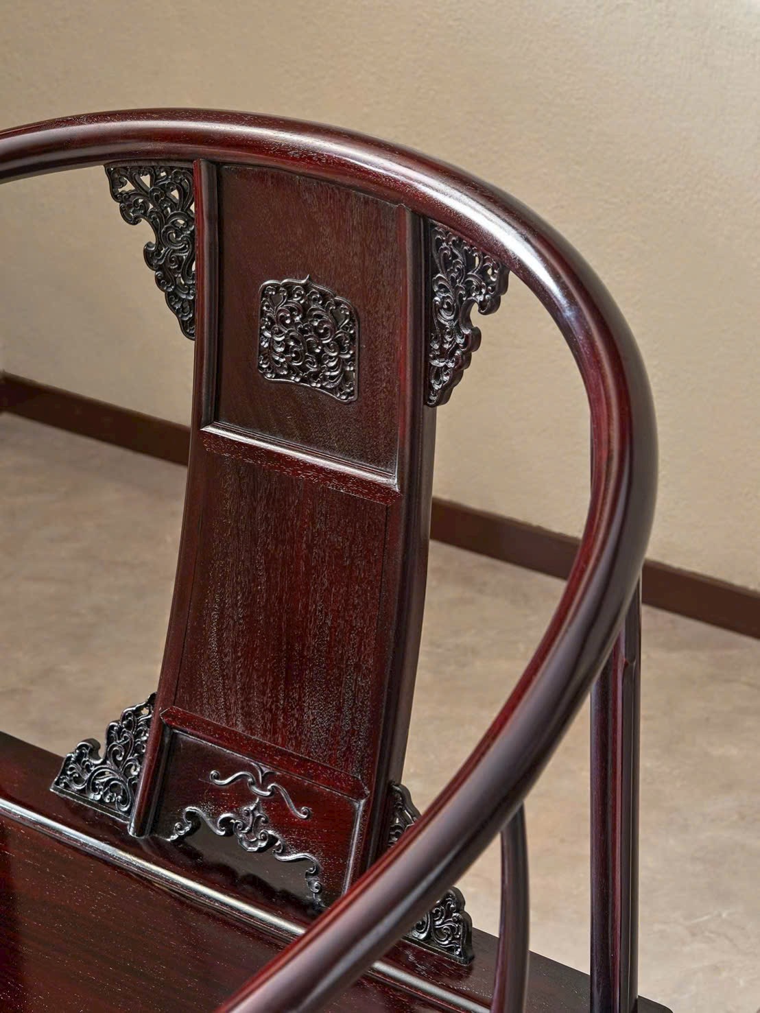 Bộ ghế được chế tác từ tử đàn Zambia quý hiếm, vân gỗ rõ nét, màu sắc đỏ sậm sang trọng. Dáng ghế hoàng cung đường bệ, tay vịn và lưng ghế uốn cong mềm mại, tôn lên vẻ uy nghi trang nhã. Bàn trà nhỏ đi kèm tạo nên bố cục cân đối, phù hợp bài trí trong phòng khách, phòng trà hay thư phòng, thể hiện phong thái quý tộc và gu thẩm mỹ tinh tế.
