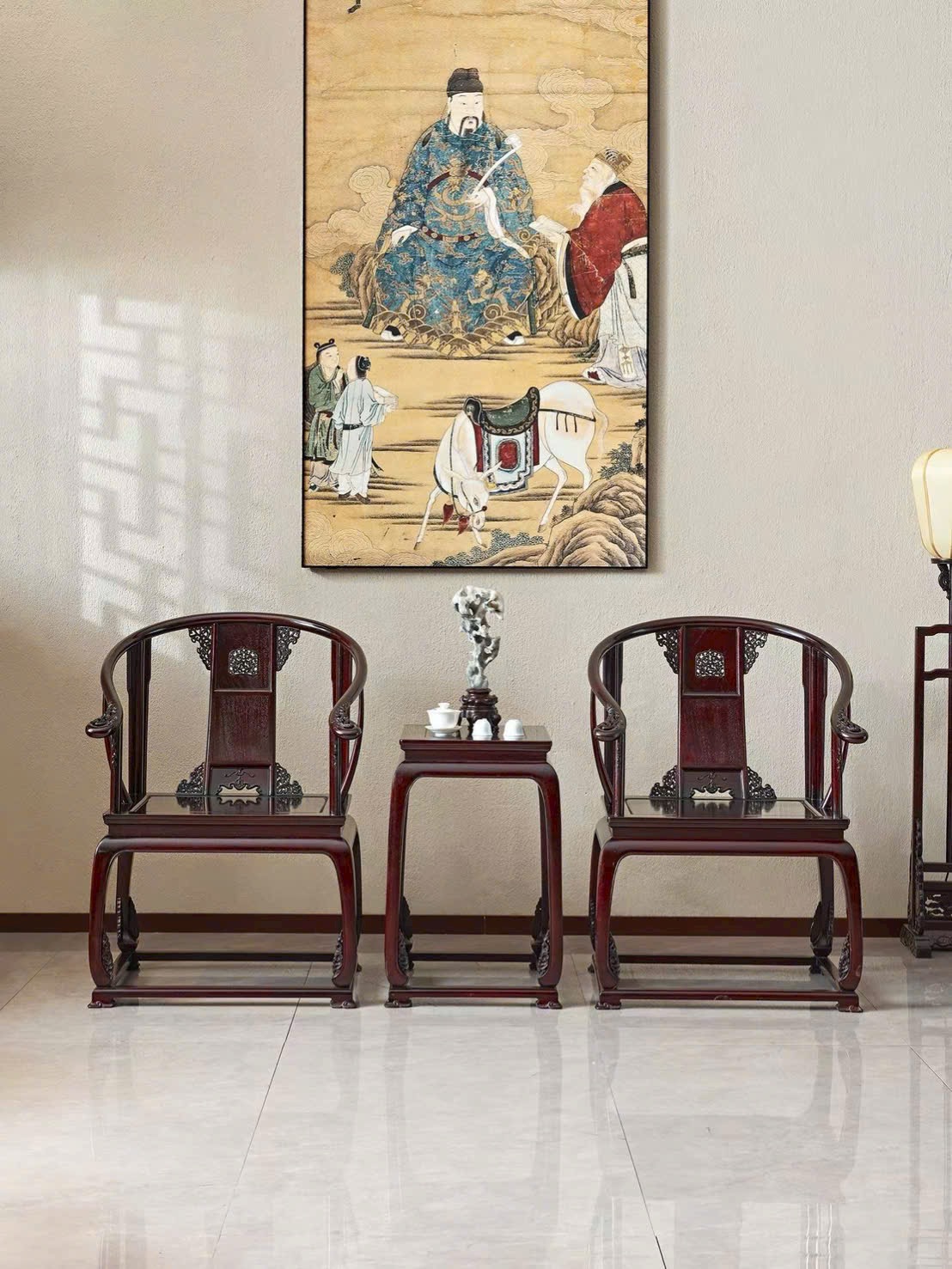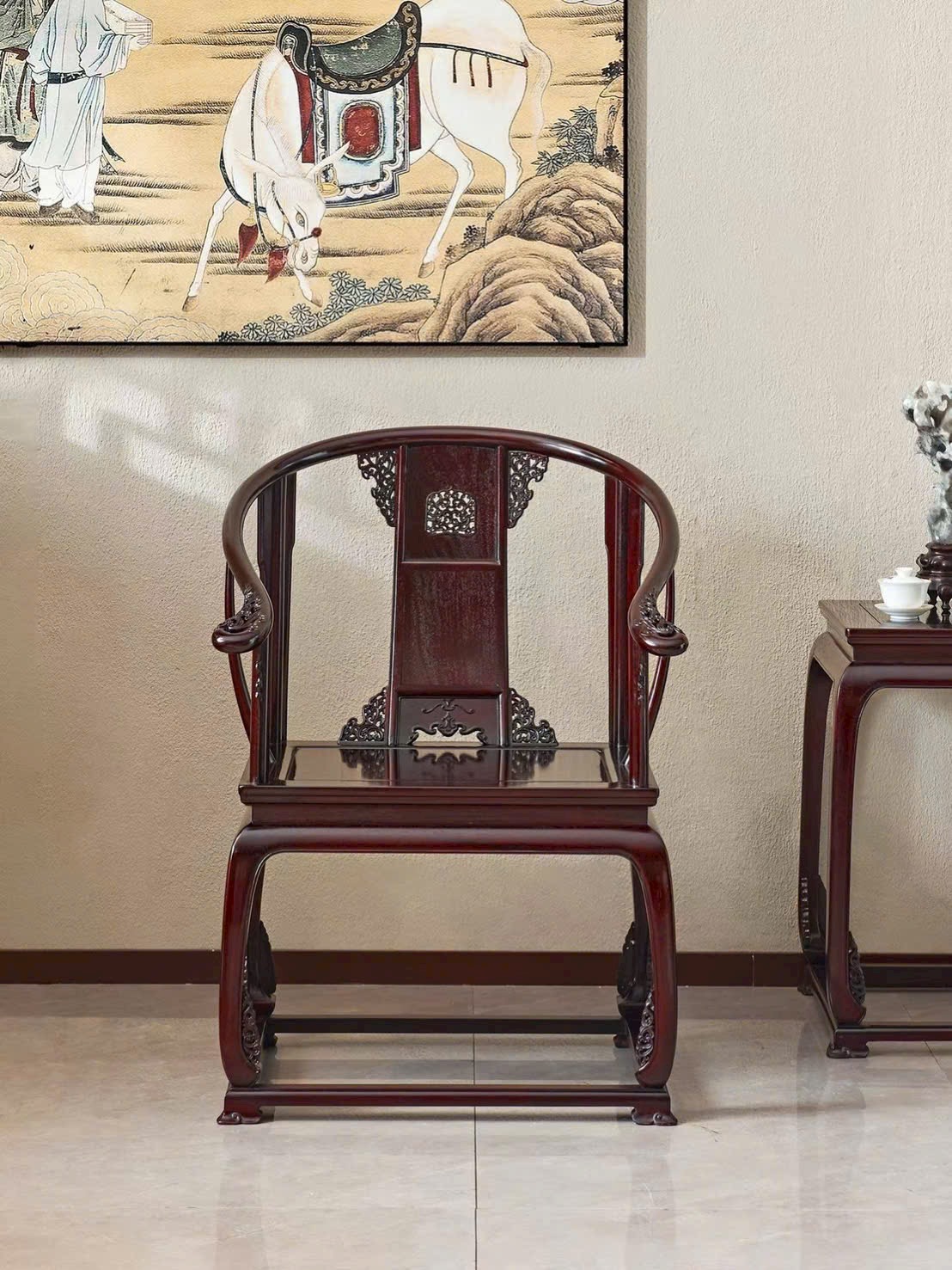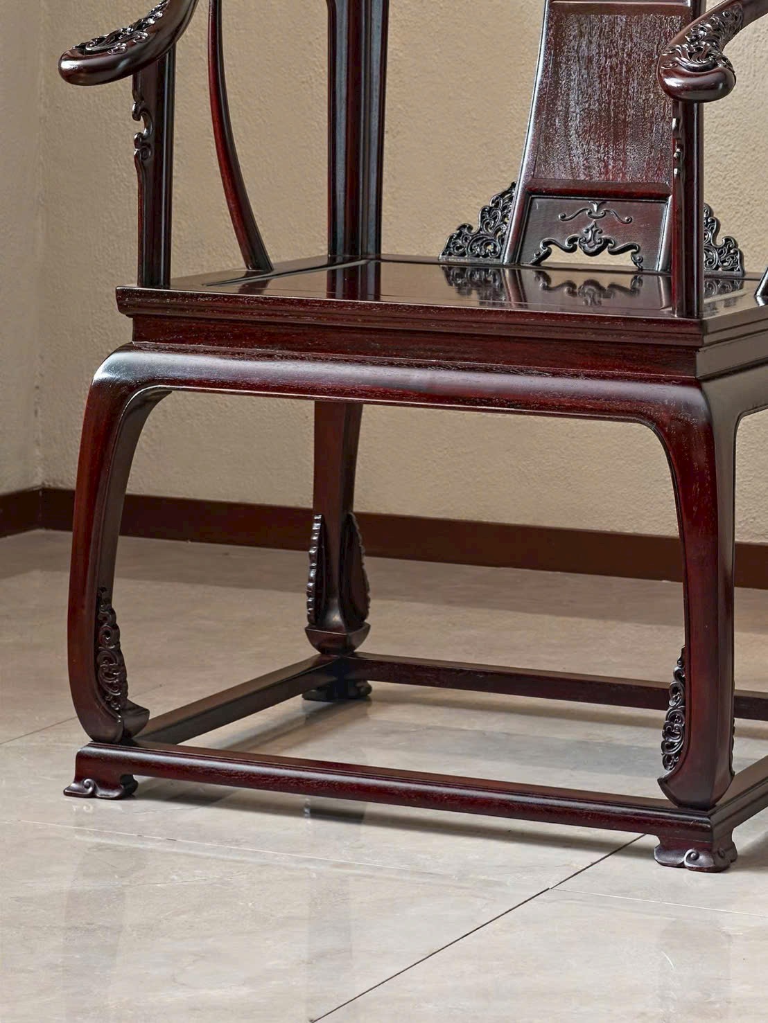 Bộ ghế được chế tác từ tử đàn Zambia quý hiếm, vân gỗ rõ nét, màu sắc đỏ sậm sang trọng. Dáng ghế hoàng cung đường bệ, tay vịn và lưng ghế uốn cong mềm mại, tôn lên vẻ uy nghi trang nhã. Bàn trà nhỏ đi kèm tạo nên bố cục cân đối, phù hợp bài trí trong phòng khách, phòng trà hay thư phòng, thể hiện phong thái quý tộc và gu thẩm mỹ tinh tế.