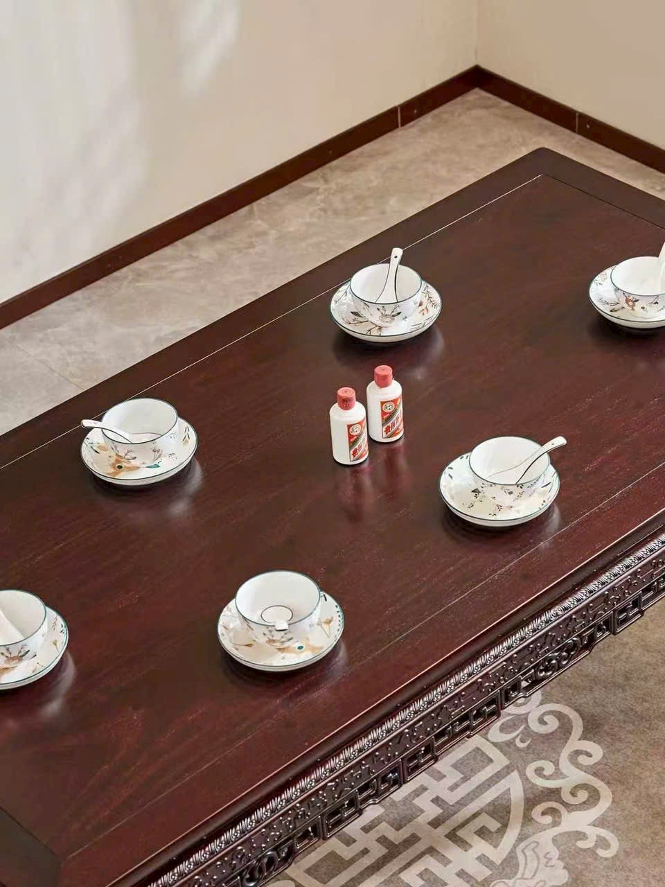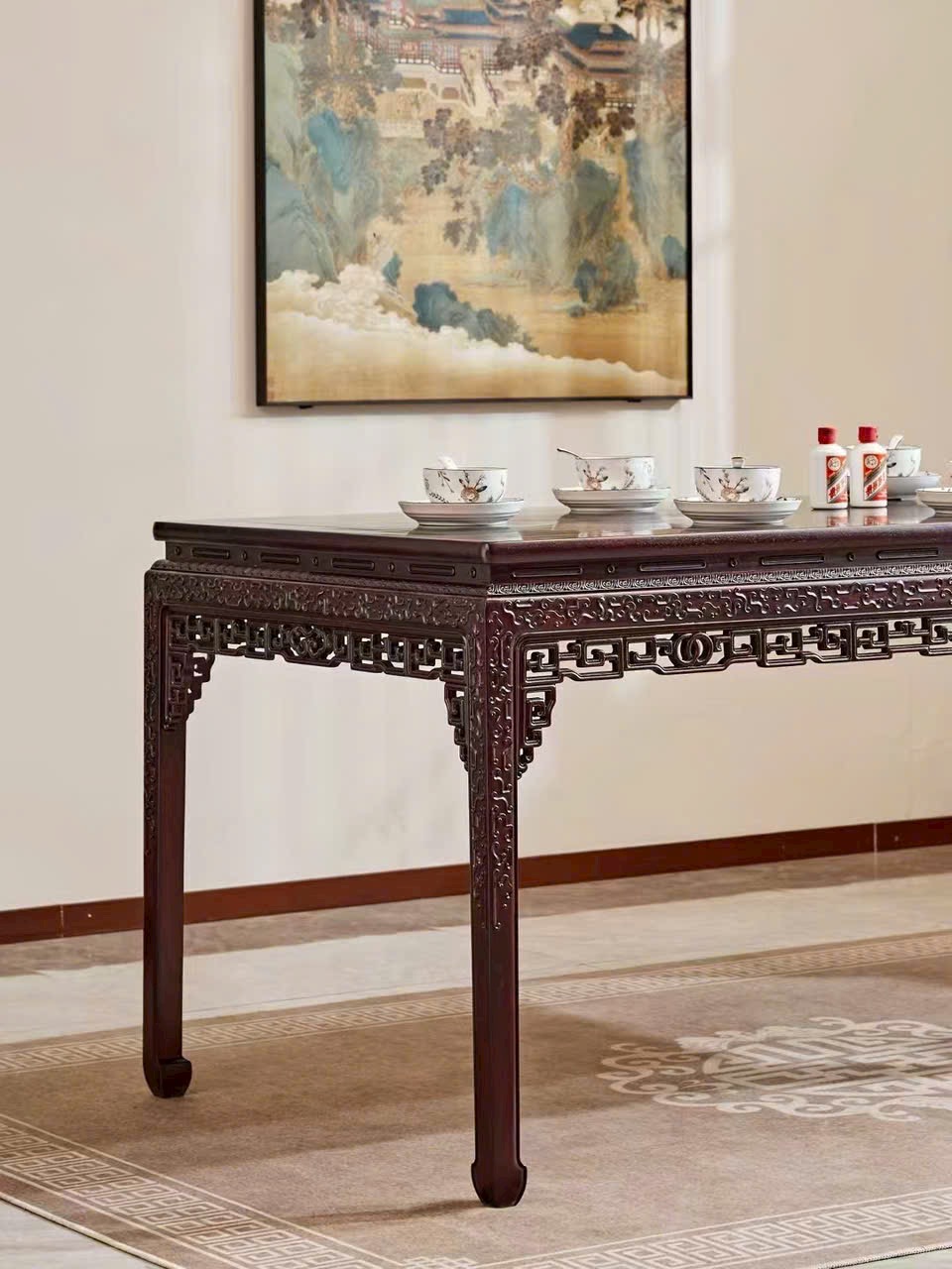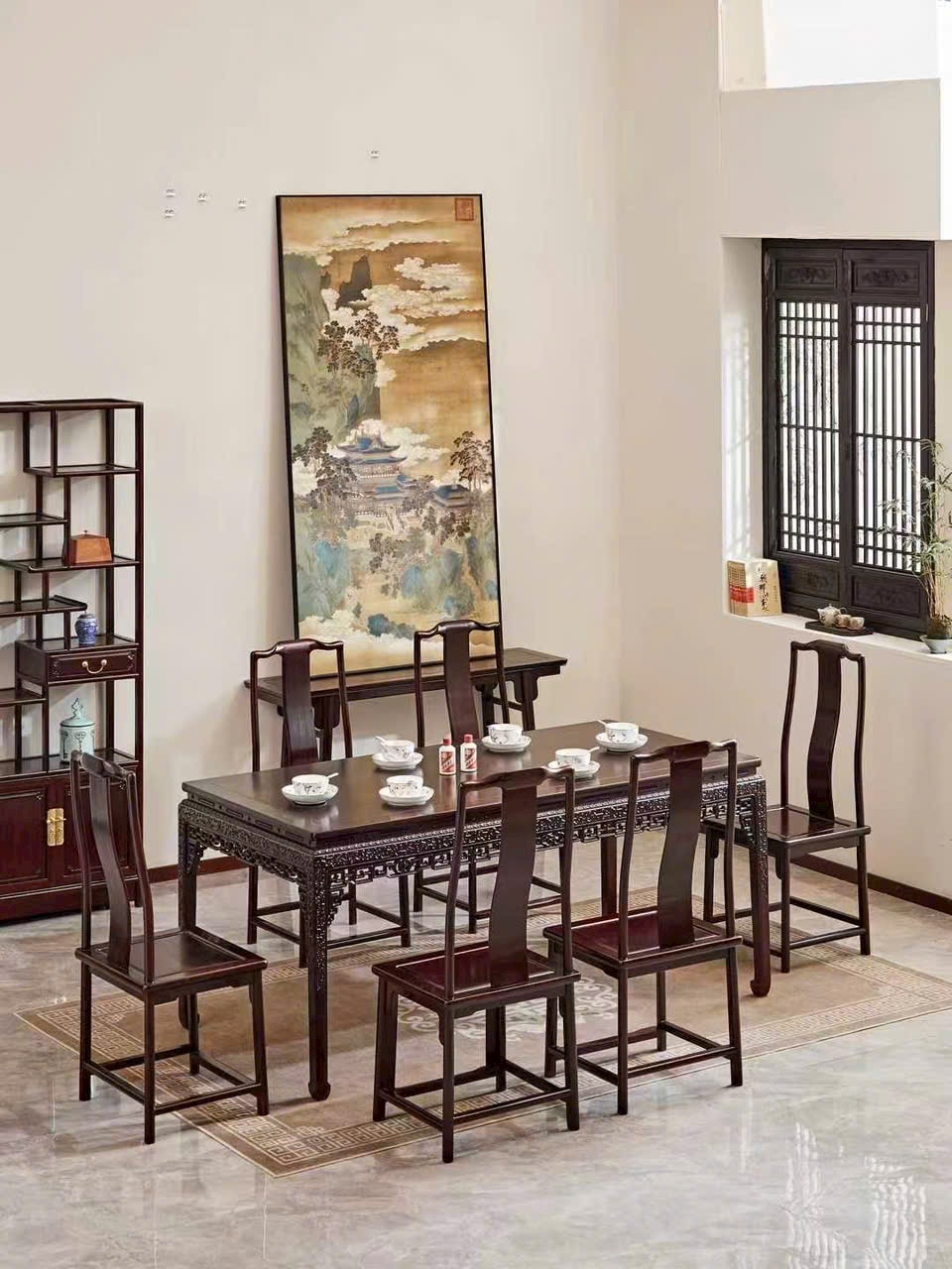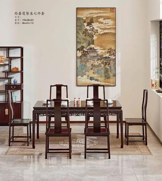 Bộ bàn ăn thiết kế chữ nhật, tổng thể hài hòa, vân gỗ đẹp và sắc đỏ trầm ấm sang trọng.