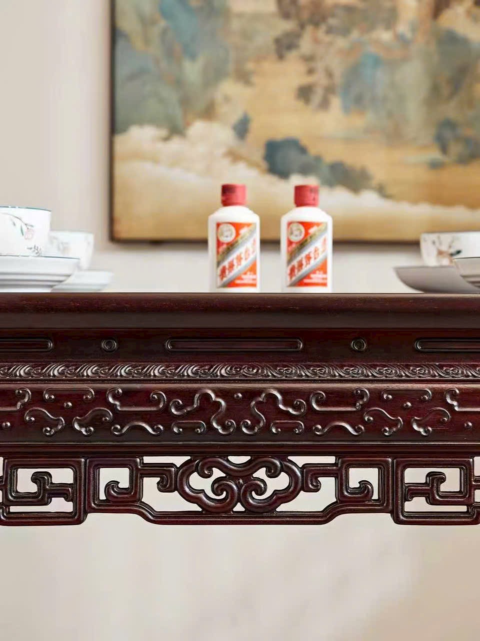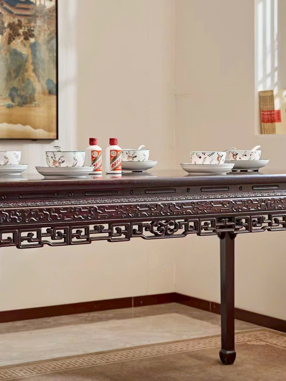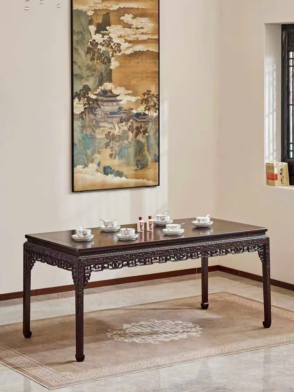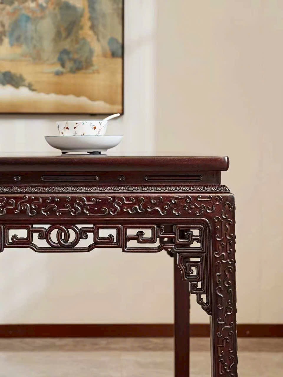 Bộ bàn ăn thiết kế chữ nhật, tổng thể hài hòa, vân gỗ đẹp và sắc đỏ trầm ấm sang trọng.